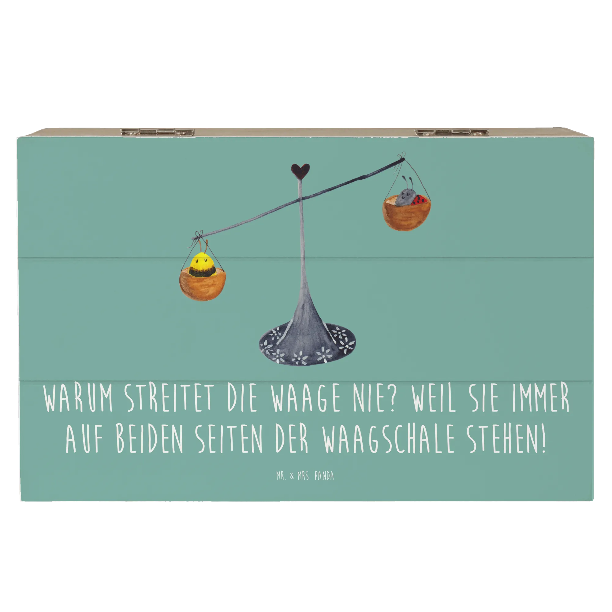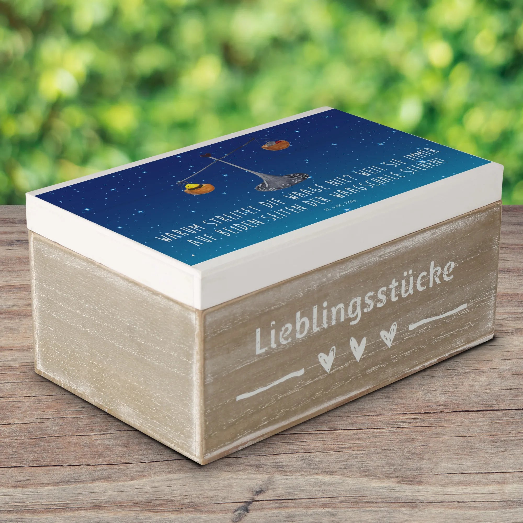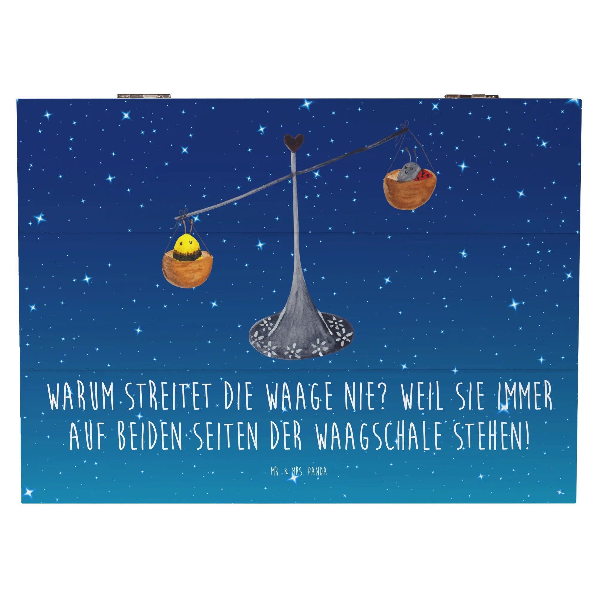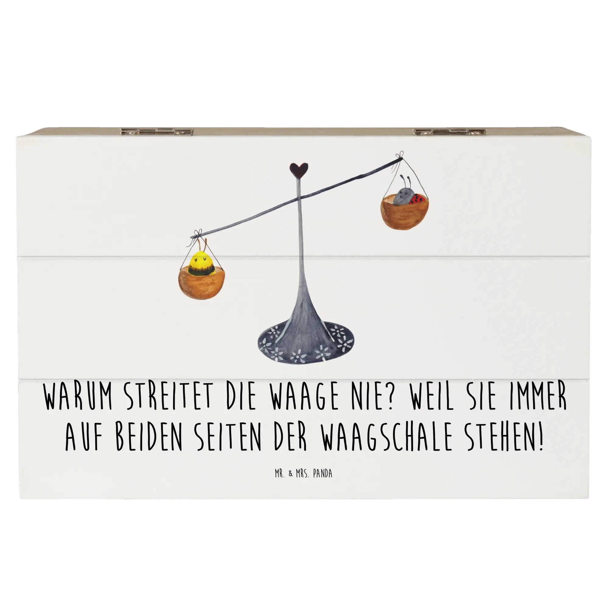 Die wunderschöne Holzkiste von Mr. & Mrs. Panda ist das perfekte Geschenk für alle, die die Magie der Sterne und die charmanten Eigenschaften des Tierkreiszeichens Waage schätzen. Mit einem lustigen Spruch "Warum streitet die Waage nie? Weil sie immer auf beiden Seiten der Waagschale stehen!" verleiht diese Kiste jedem Raum eine fröhliche Note.