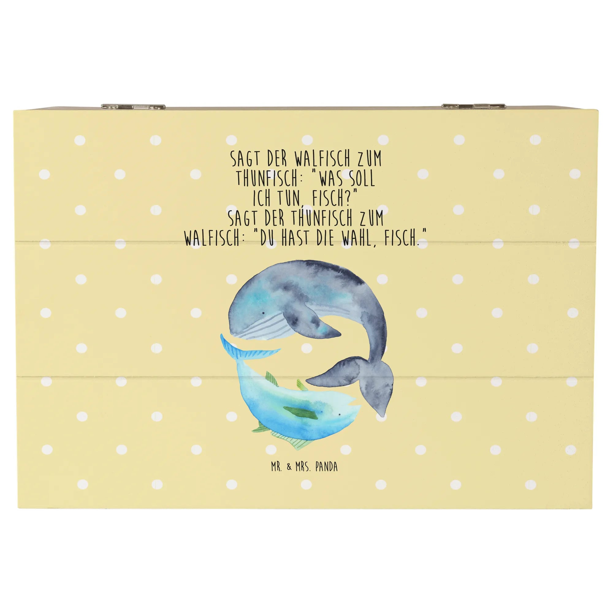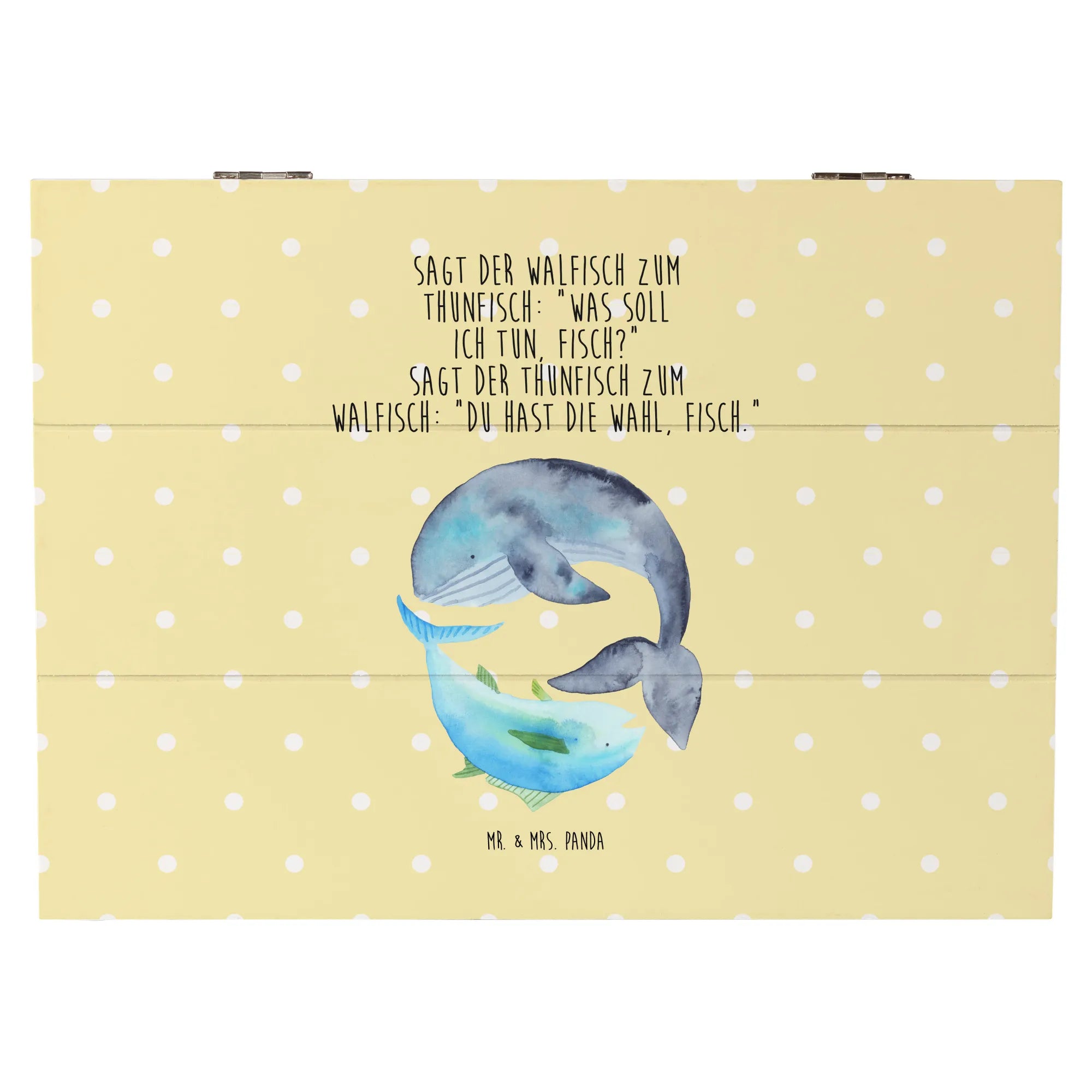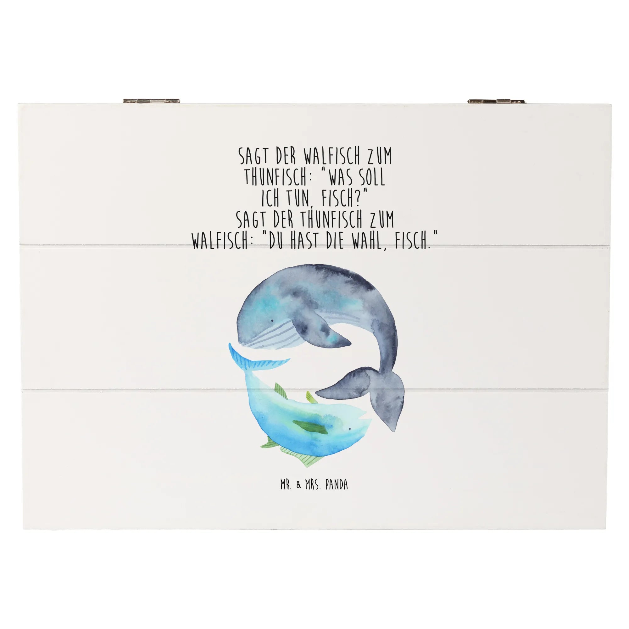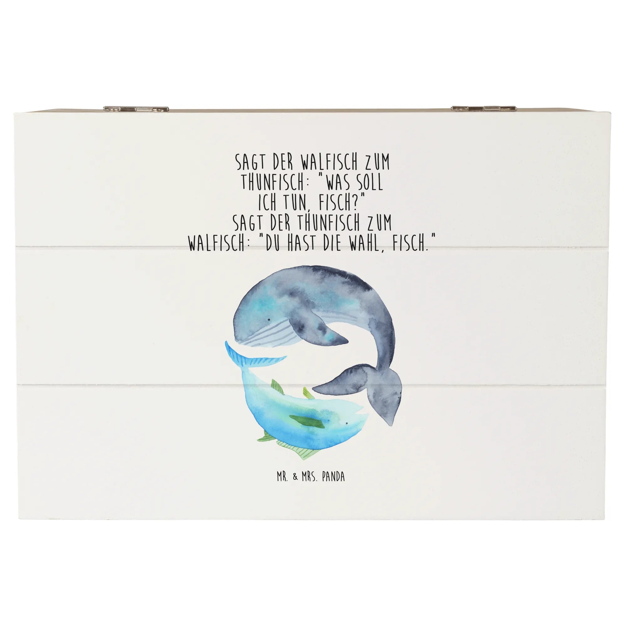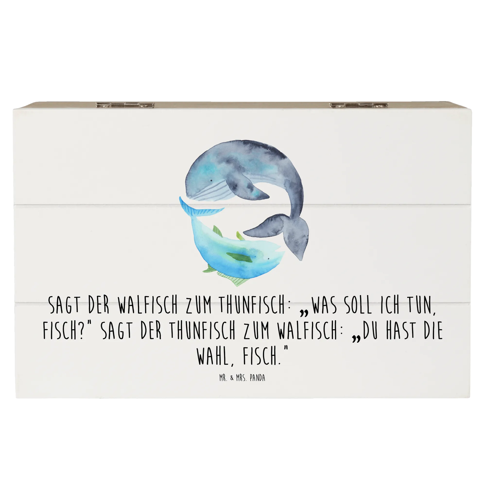 Der lustige Spruch "Sagt der Walfisch zum Thunfisch: „Was soll ich tun, Fisch?“ Sagt der Thunfisch zum Walfisch: „Du hast die Wahl, Fisch." verleiht der Kiste einen charmanten und fröhlichen Touch.