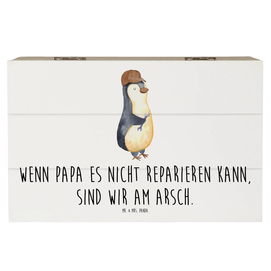 Die Holzkiste "Wenn Papa es nicht reparieren kann, sind wir am Arsch" von Mr. & Mrs. Panda ist das perfekte Geschenk für all die besonderen Anlässe in der Familie. Mit einem liebevoll designten Pinguin-Motiv, der ganz entspannt mit einem Schraubenschlüssel posiert, bringt sie nicht nur einen Hauch von Humor in jedes Zuhause, sondern ist auch ein praktisches Accessoire für jeden Papa.