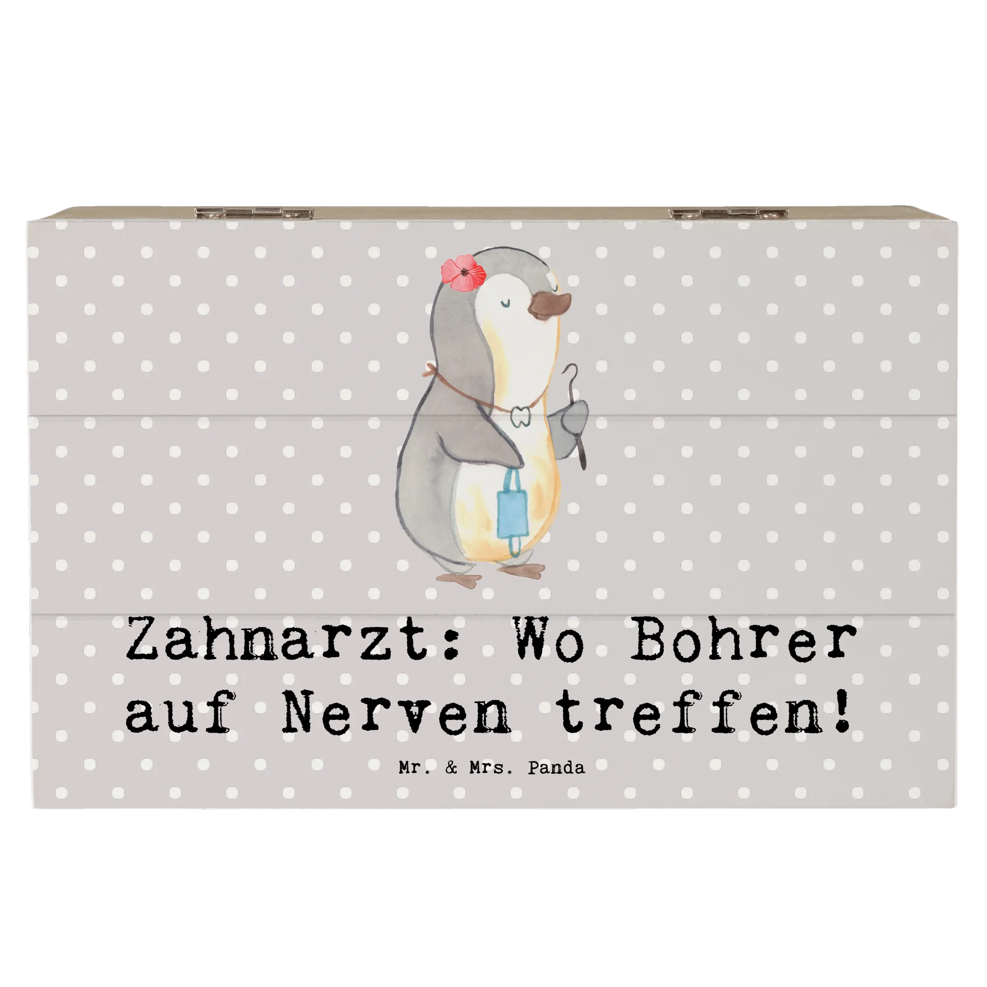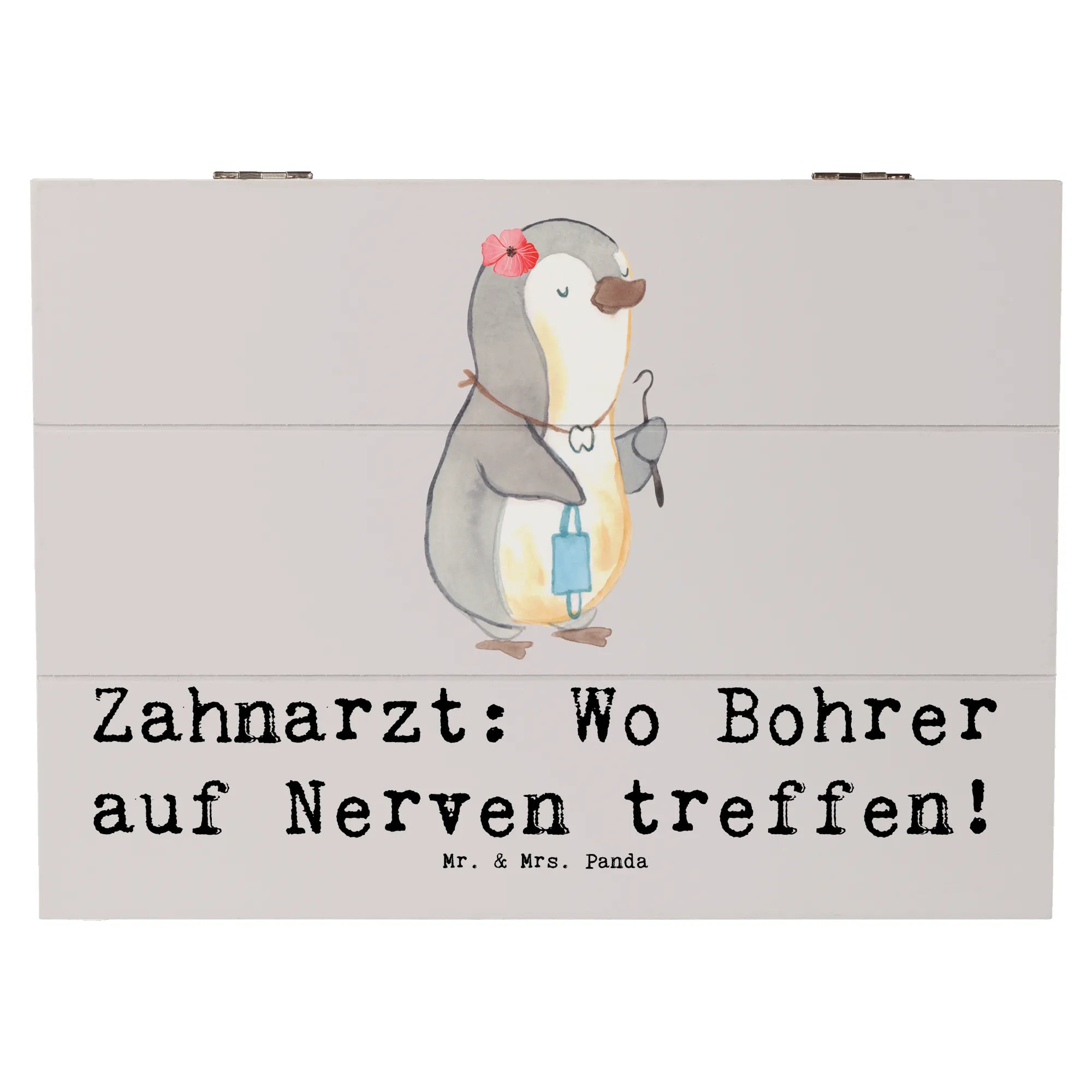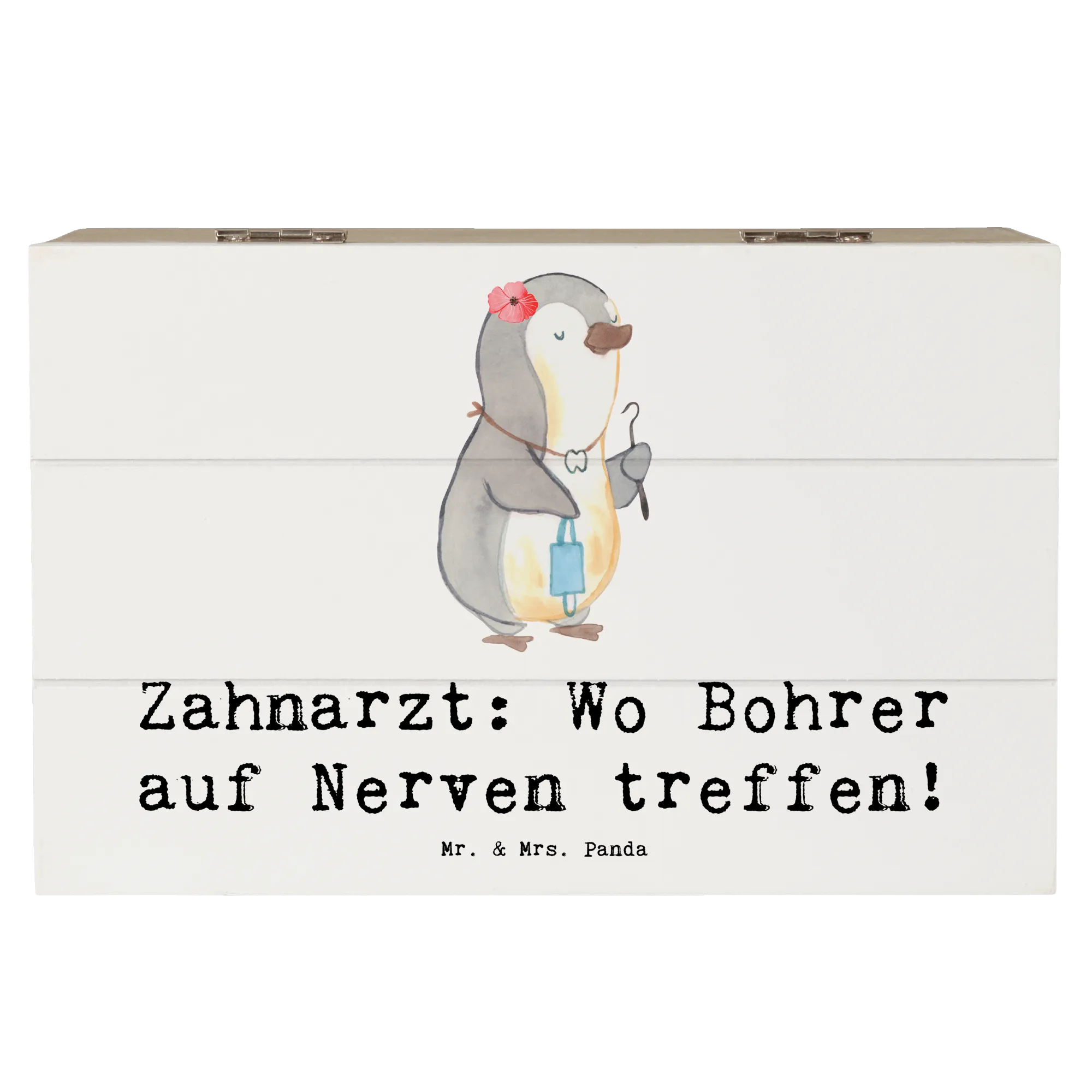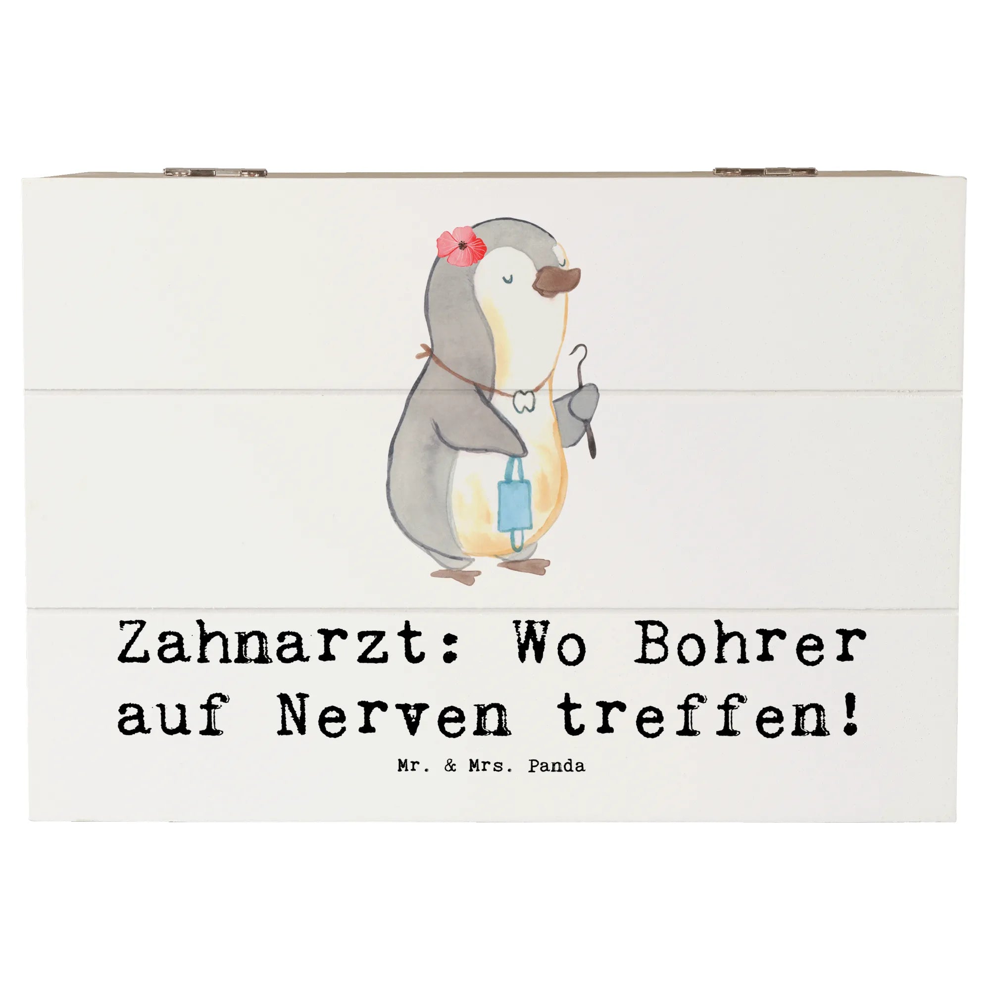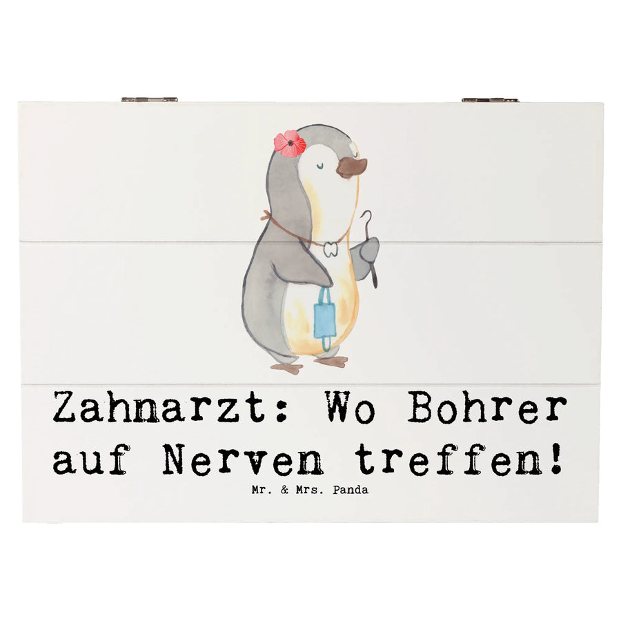 Entdecke die wundervolle Holzkiste von Mr. & Mrs. Panda, die nicht nur eine hübsche Dekoration ist, sondern auch perfekt als Aufbewahrungsort für all Deine wertvollen Schätze dient. Diese besondere Kiste ist mit dem liebevollen Motiv "Zahnarzt: Wo Bohrer auf Nerven treffen!" bedruckt und bringt garantiert ein Schmunzeln auf Dein Gesicht!