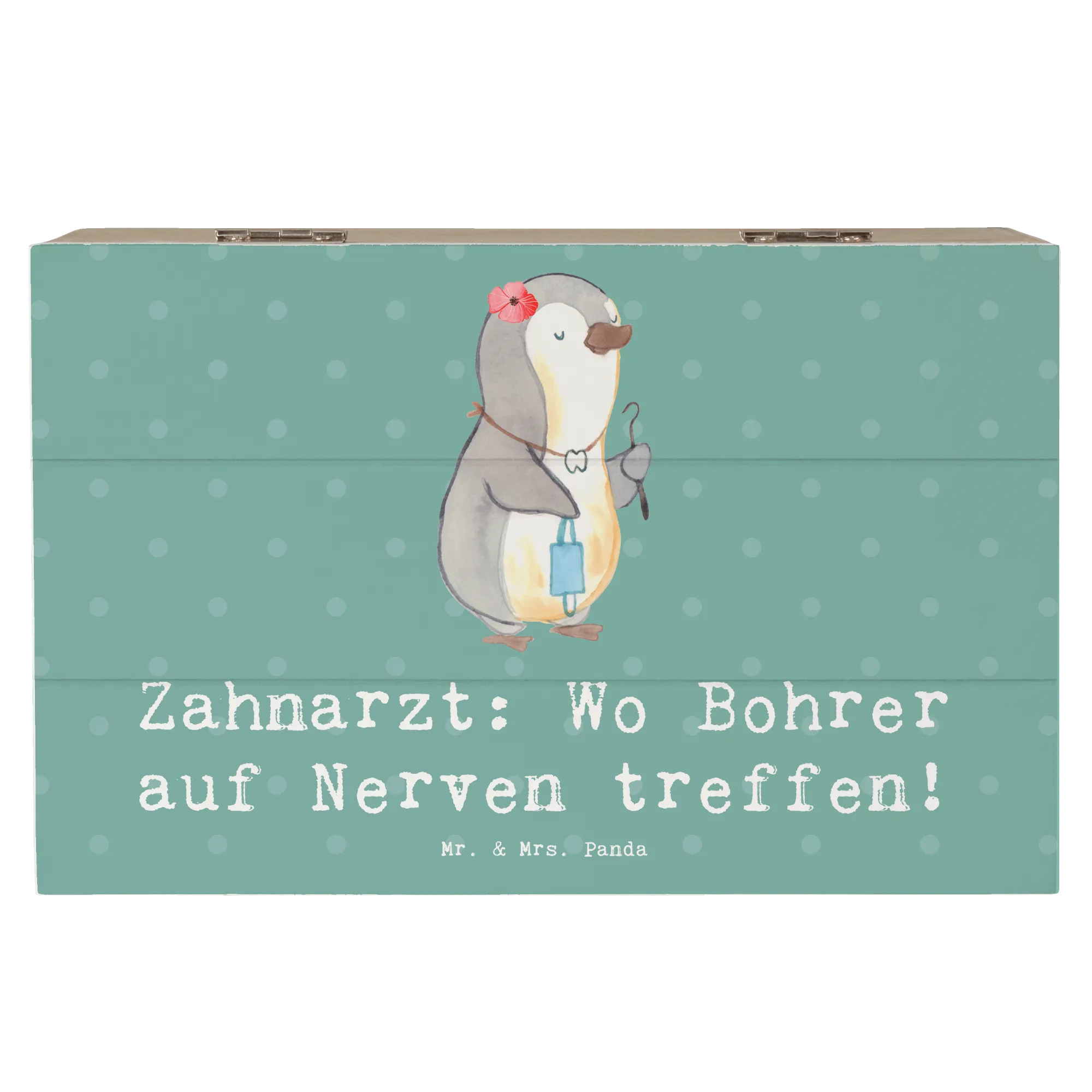 Praktisch und schön zugleich, ist diese Holzkiste ein 'must-have' für jeden Berufszahnarzt und eine wunderbare Möglichkeit, seinen Beruf feierlich zu würdigen. Lass den Humor der Zahnarztberufe in Dein Zuhause Einzug halten und sichere Dir diese einzigartige Schatulle von Mr. & Mrs. Panda!