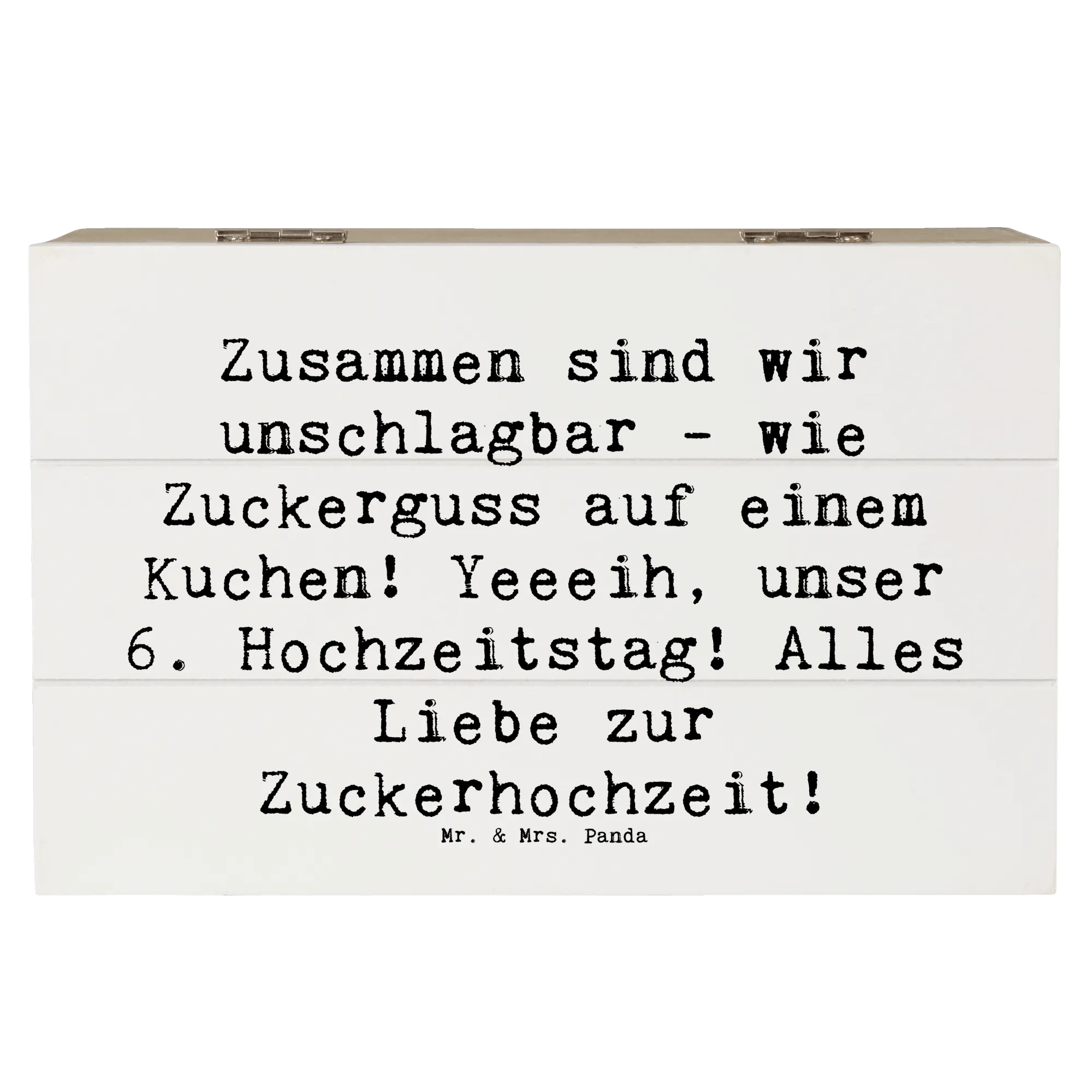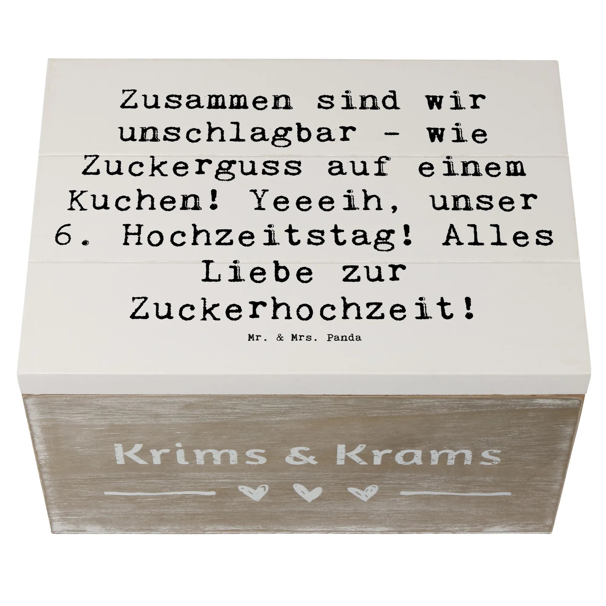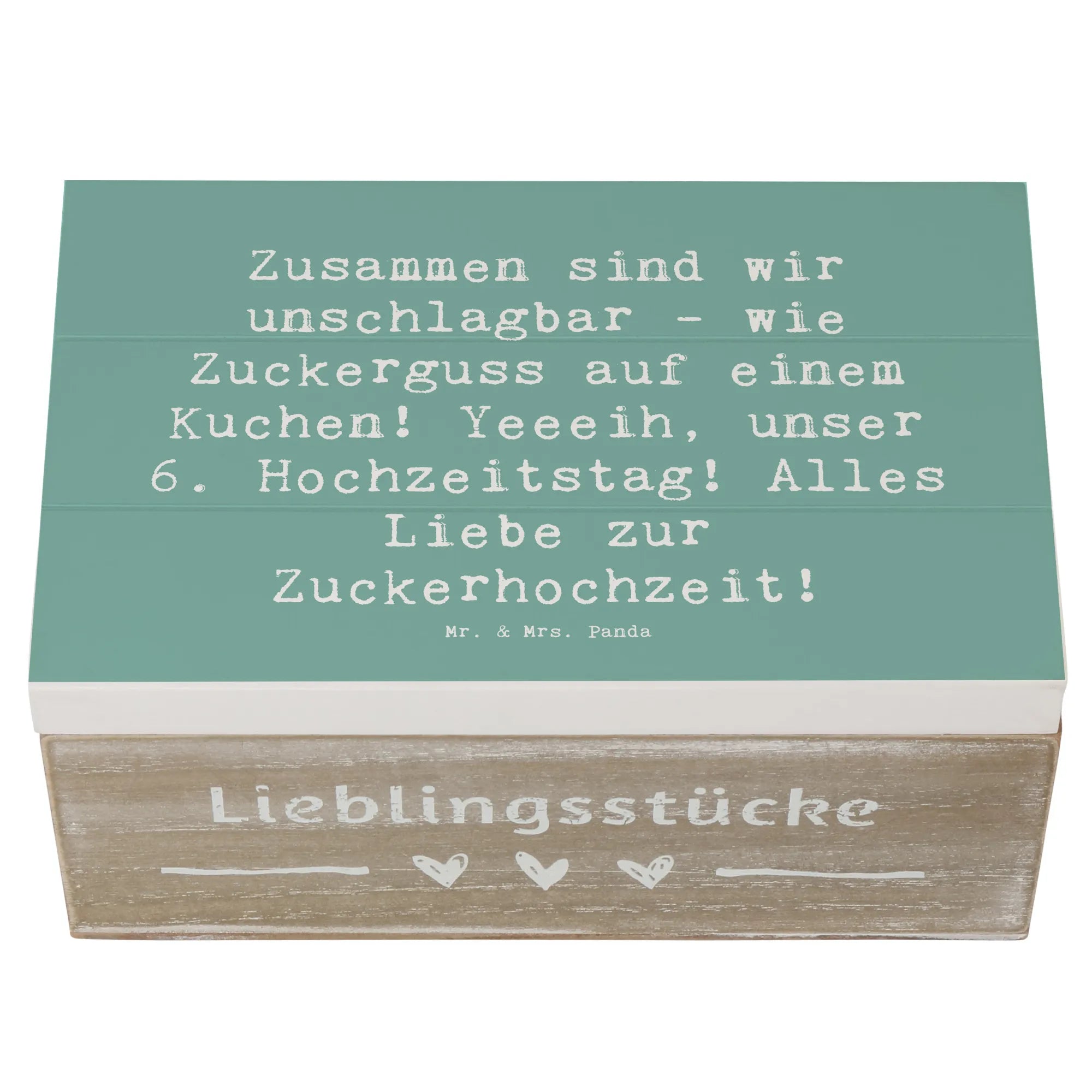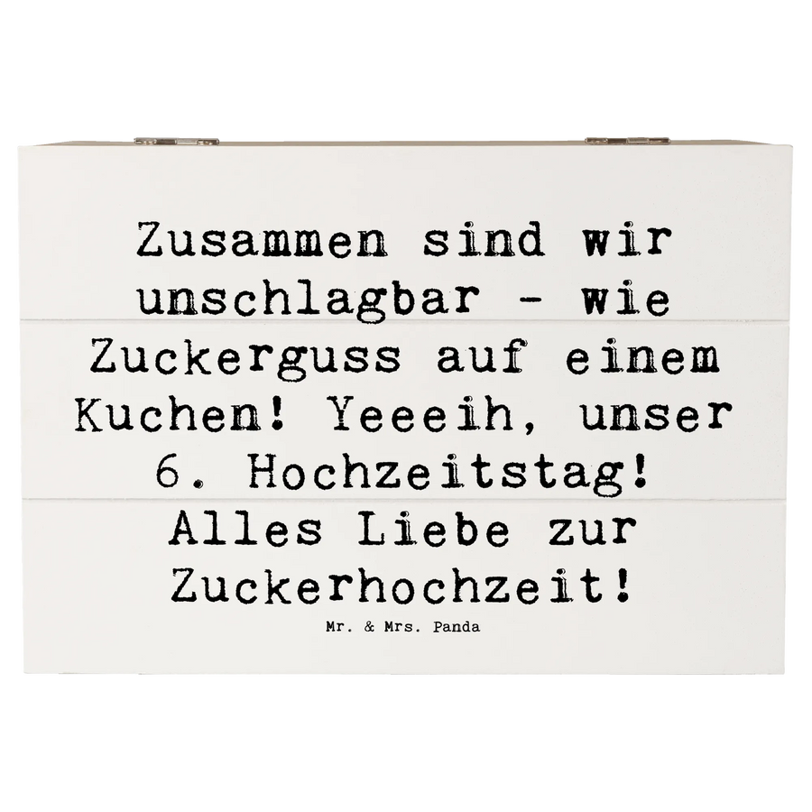 Entdecke die wunderschöne Holzkiste zum 6. Hochzeitstag, die aus robuster Holzfaser gefertigt ist und mit dem herzlichen Spruch "Zusammen sind wir unschlagbar - wie Zuckerguss auf einem Kuchen! Yeeeih, unser 6. Hochzeitstag! Alles Liebe zur Zuckerhochzeit!" verziert ist. Diese Erinnerungskiste eignet sich perfekt, um besondere Schätze und Erinnerungen aufzubewahren. Egal, ob du Fotos, kleine Geschenke oder Andenken aus deiner gemeinsamen Zeit darin verstauen möchtest – diese nostalgische Schatzkiste ist ideal dafür!