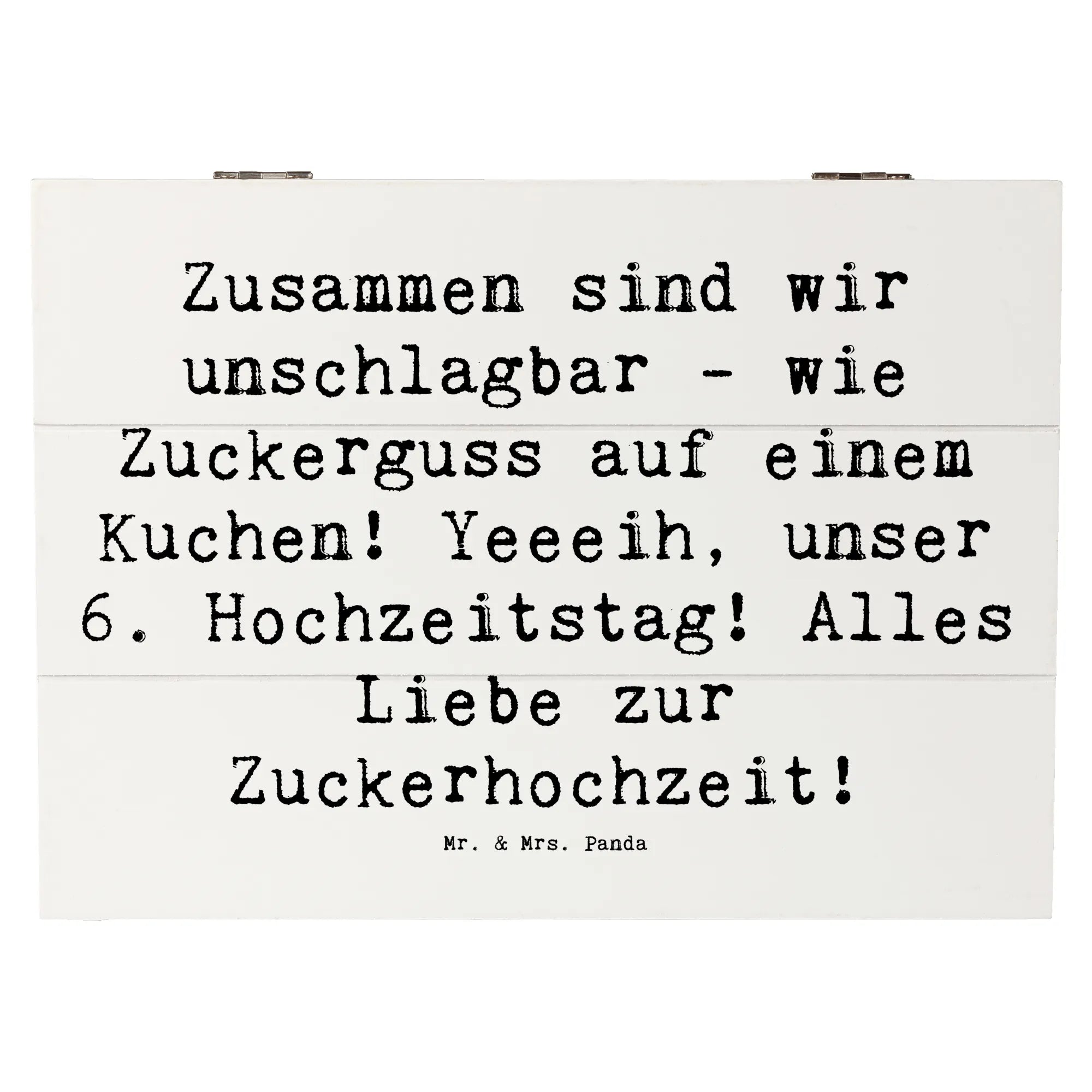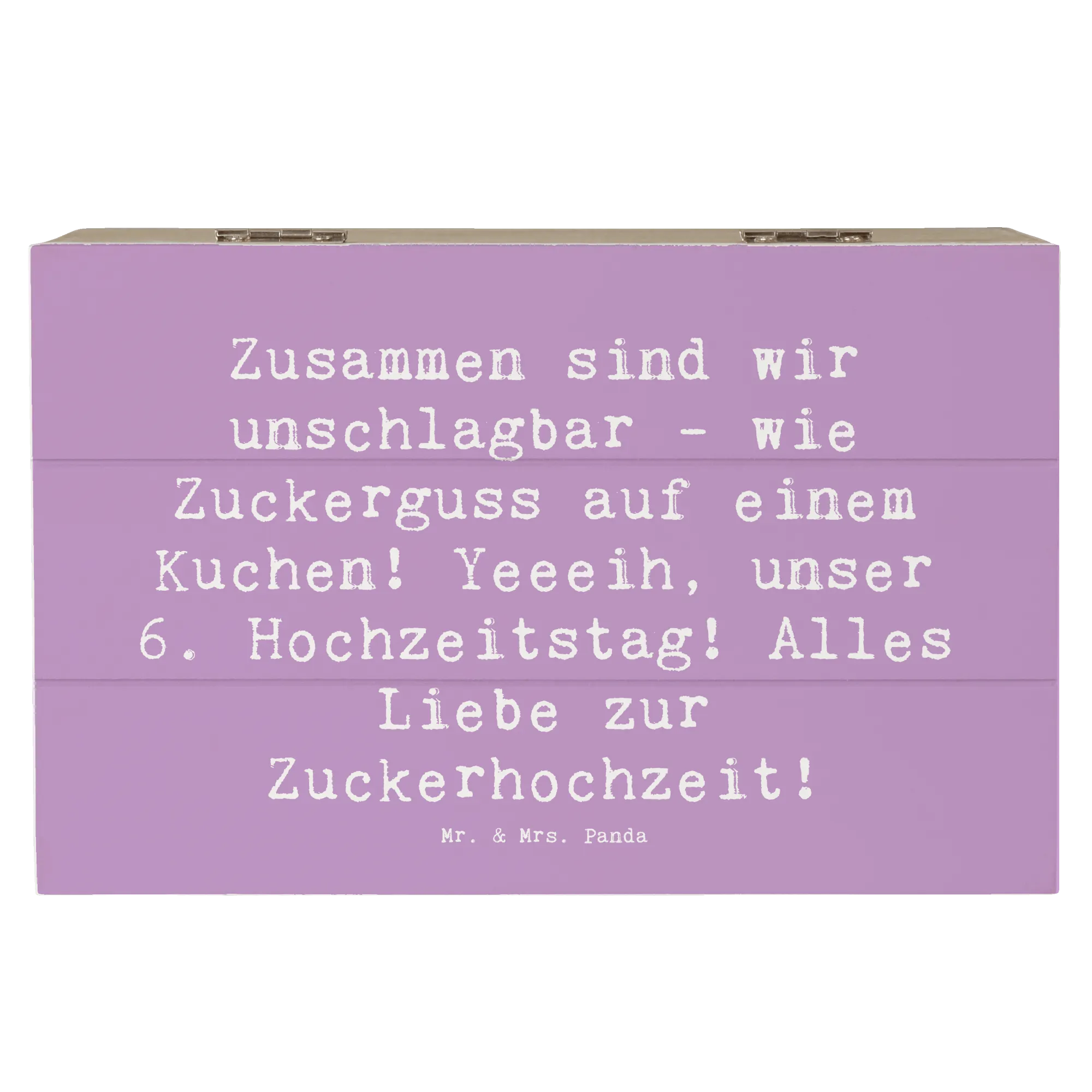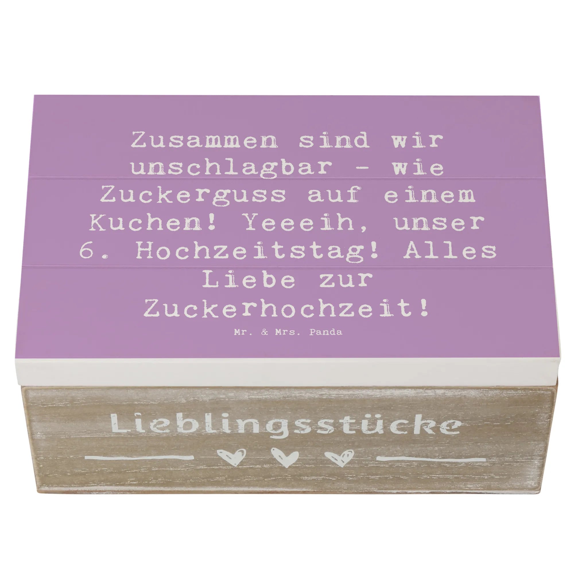 Entdecke die wunderschöne Holzkiste zum 6. Hochzeitstag, die aus robuster Holzfaser gefertigt ist und mit dem herzlichen Spruch "Zusammen sind wir unschlagbar - wie Zuckerguss auf einem Kuchen! Yeeeih, unser 6. Hochzeitstag! Alles Liebe zur Zuckerhochzeit!" verziert ist. Diese Erinnerungskiste eignet sich perfekt, um besondere Schätze und Erinnerungen aufzubewahren. Egal, ob du Fotos, kleine Geschenke oder Andenken aus deiner gemeinsamen Zeit darin verstauen möchtest – diese nostalgische Schatzkiste ist ideal dafür!