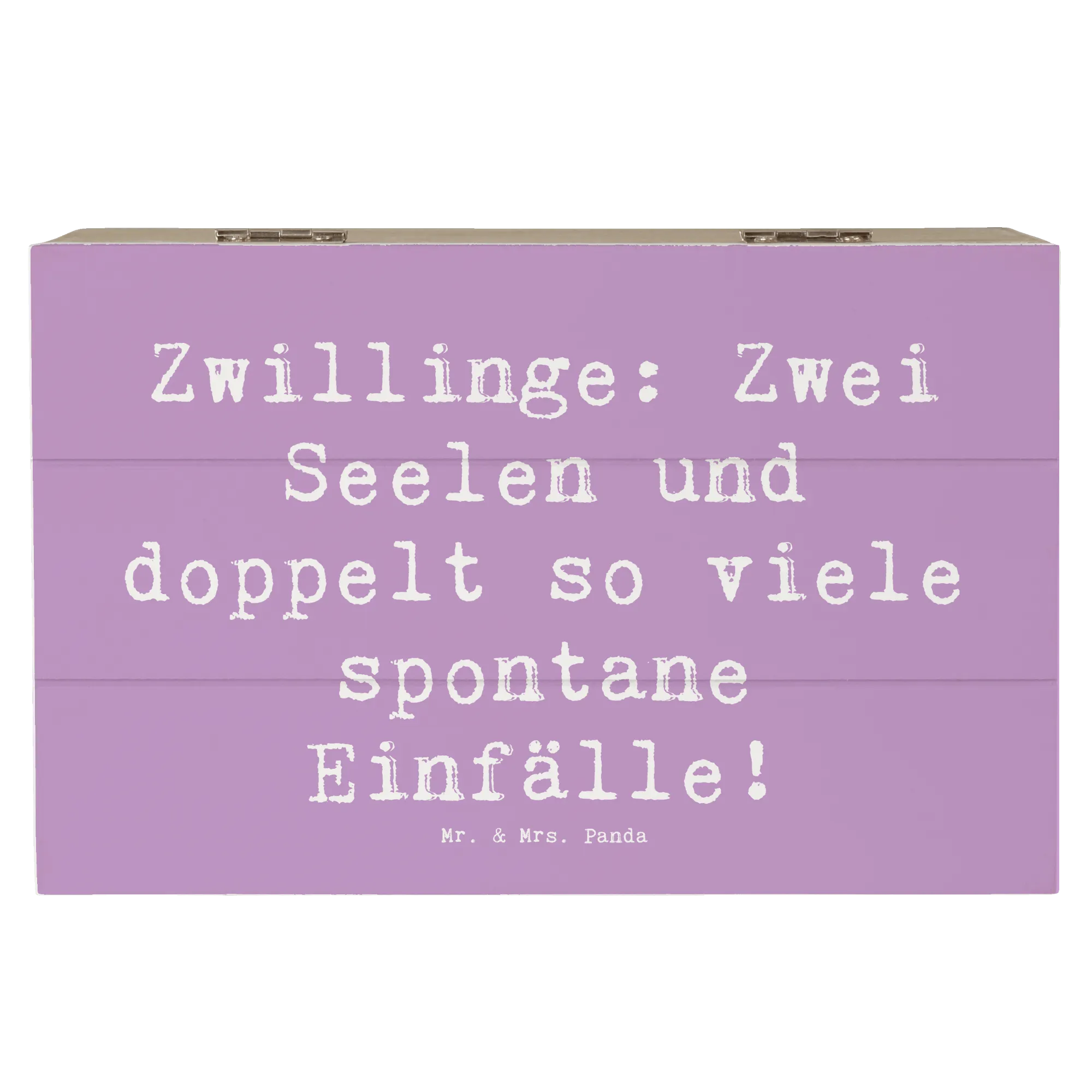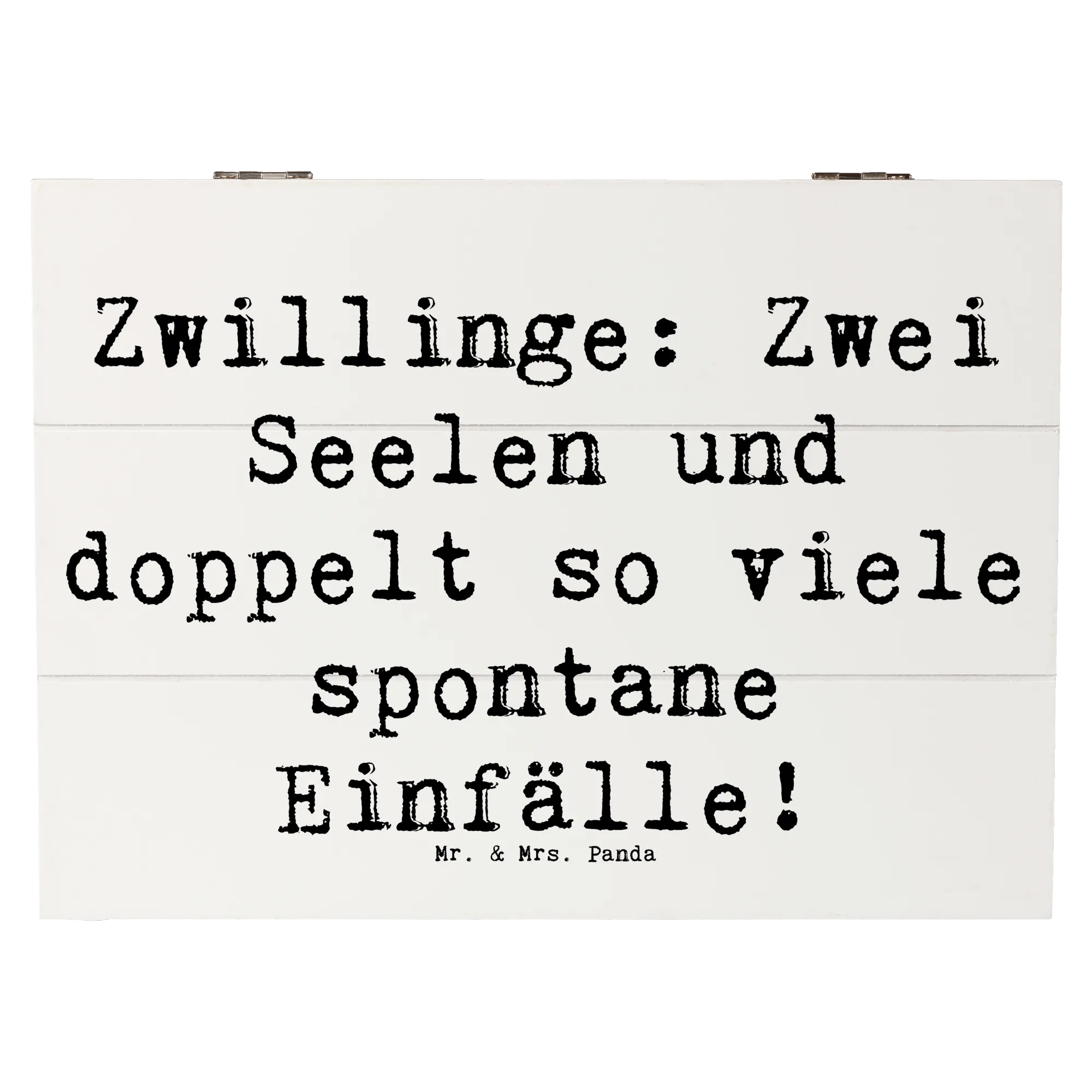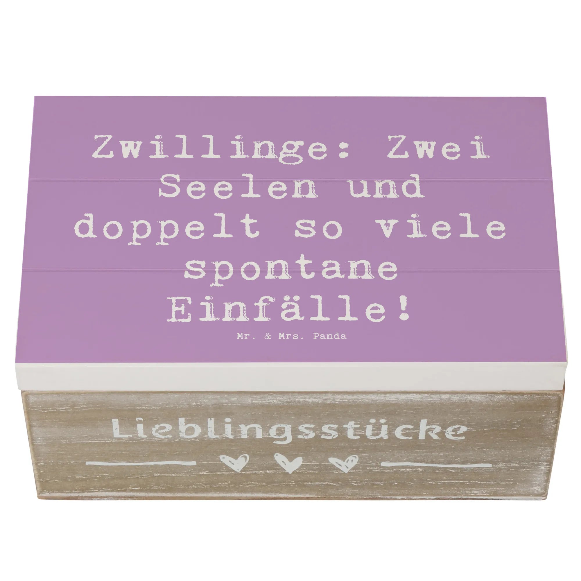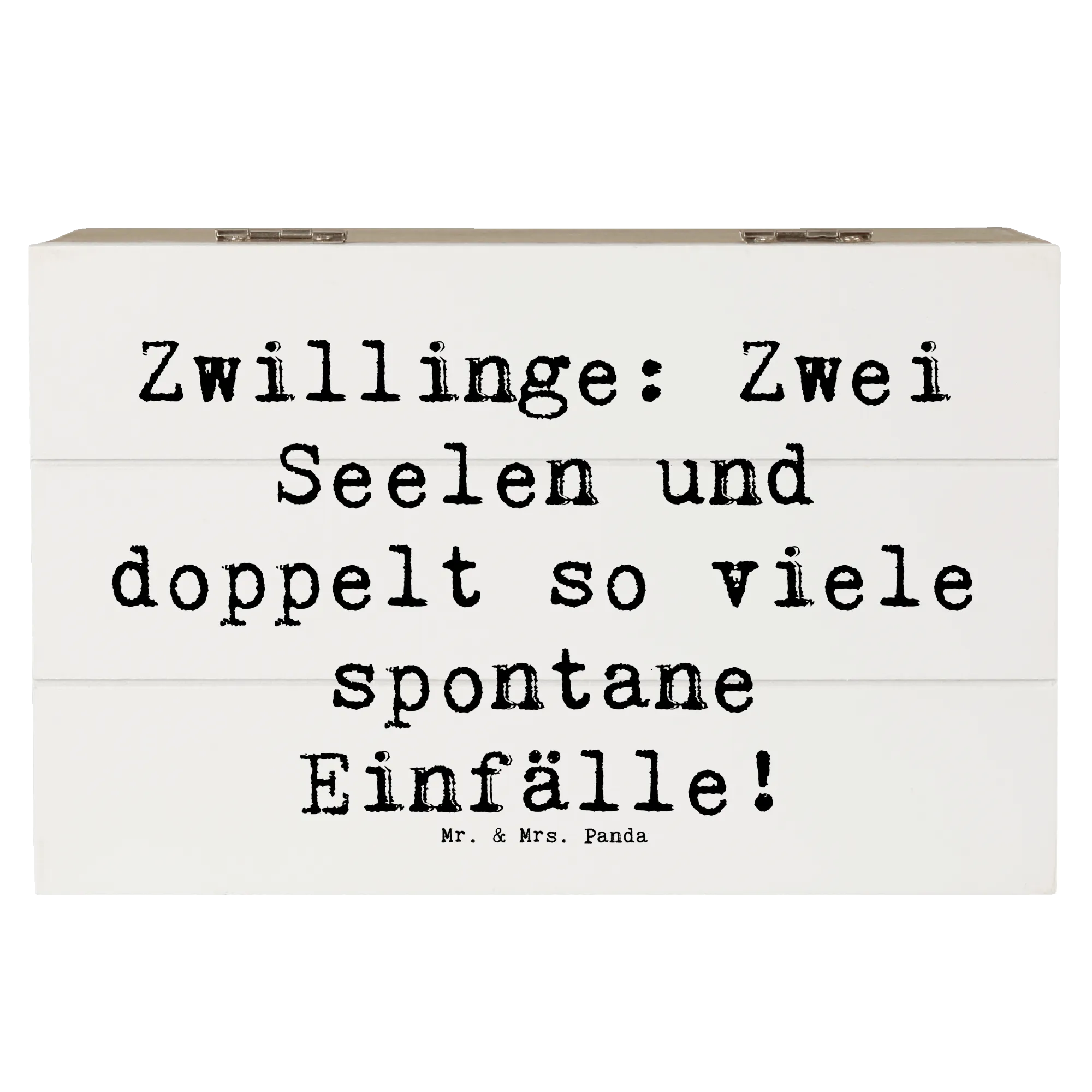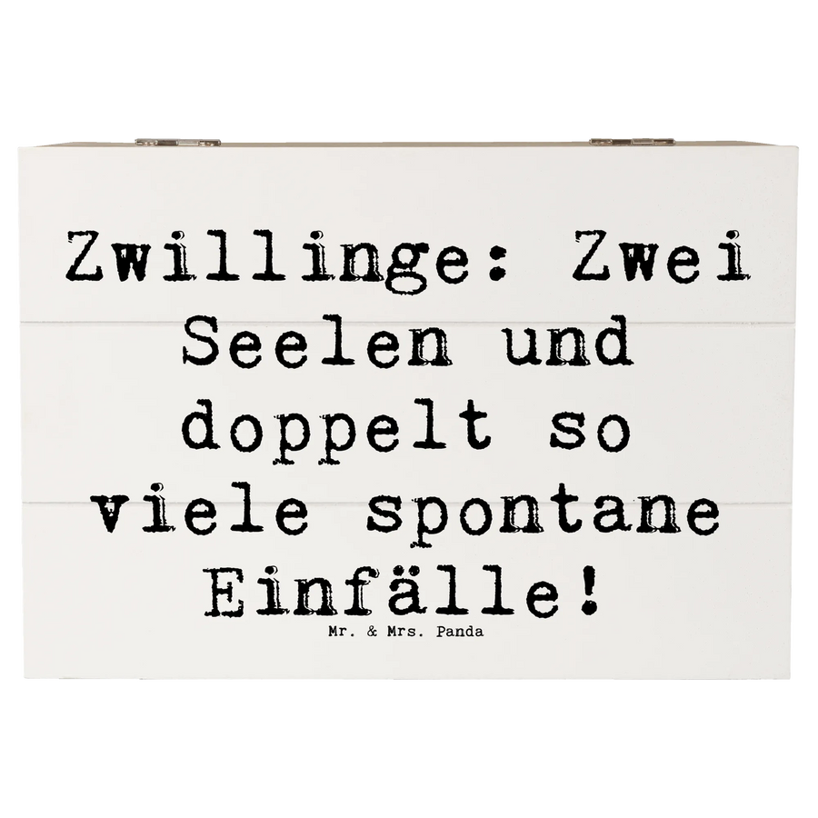 Die wunderschöne Holzkiste von Mr. & Mrs. Panda ist das perfekte Geschenk für alle Zwillinge. Ob zur Kommunion, Konfirmation oder als Aufbewahrungsort für die schönsten Erinnerungen, diese Erinnerungskiste aus robuster Holzfaser vereint Funktionalität mit einem tollen Design. Der originelle Spruch "Zwillinge: Zwei Seelen und doppelt so viele spontane Einfälle!" sorgt für ein Lächeln bei jeder Gelegenheit.