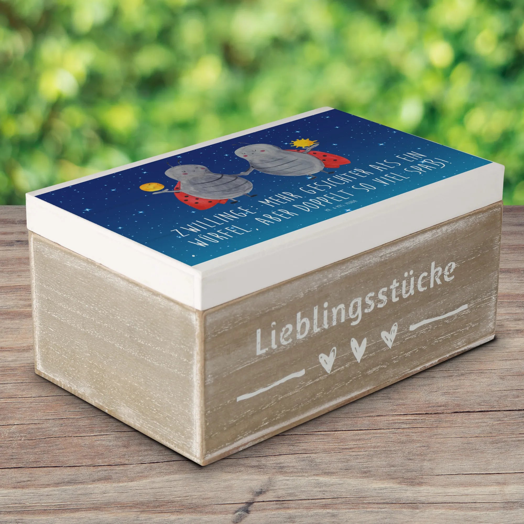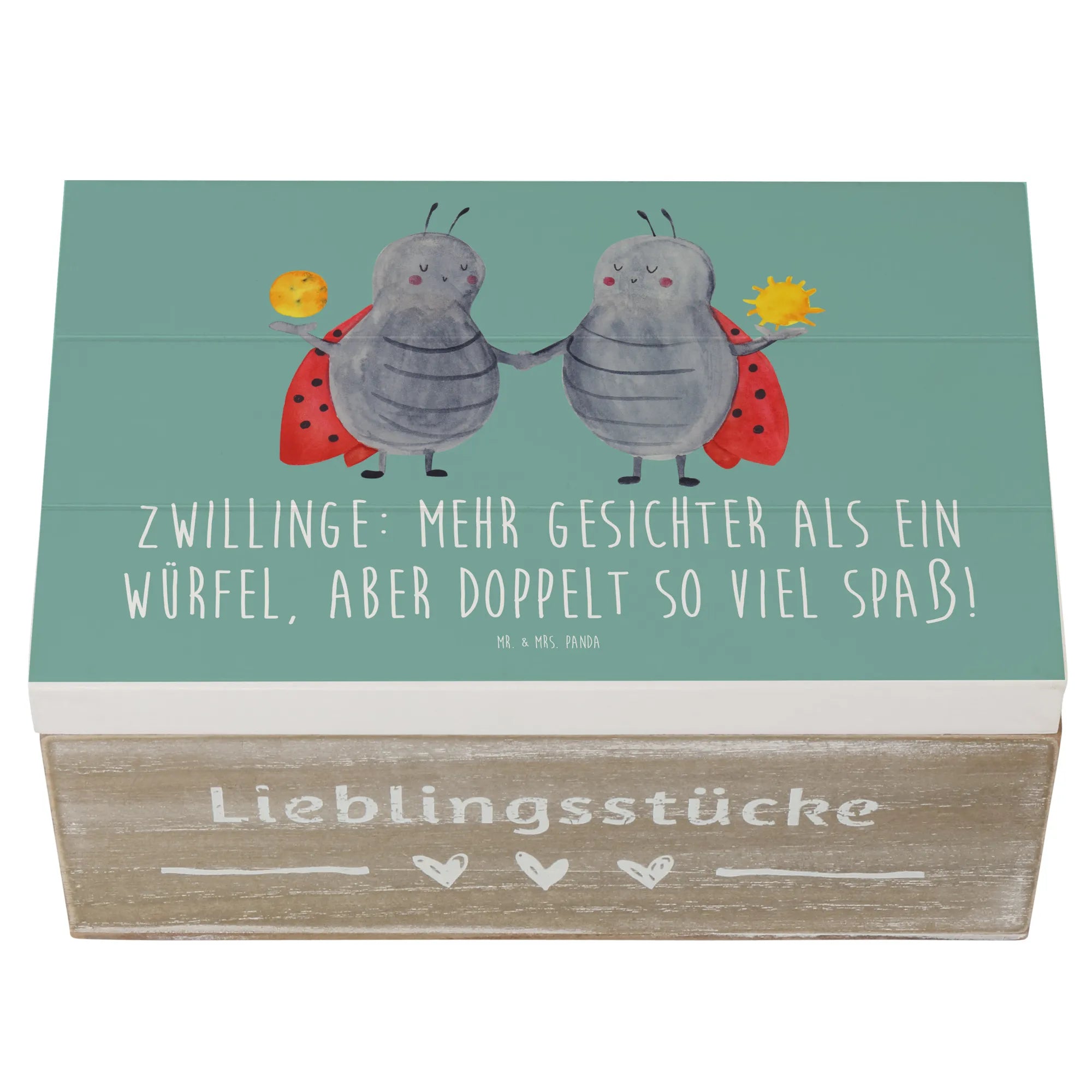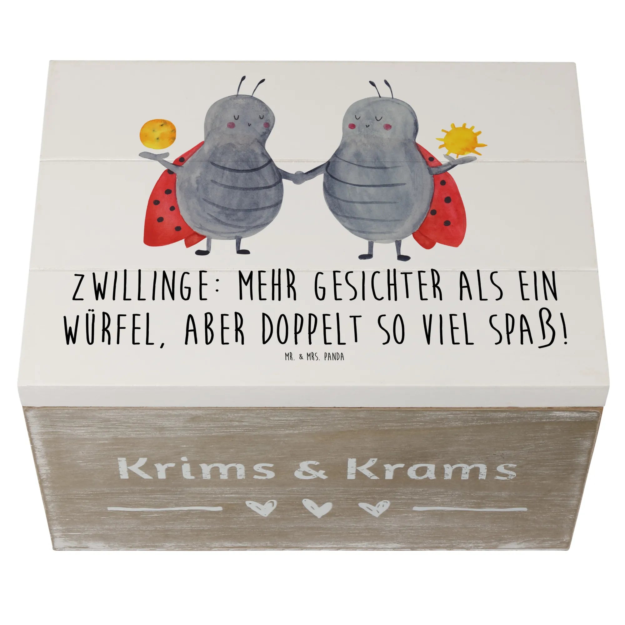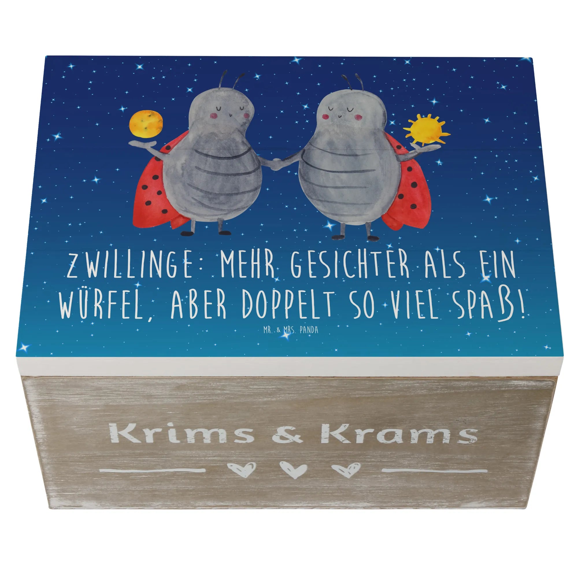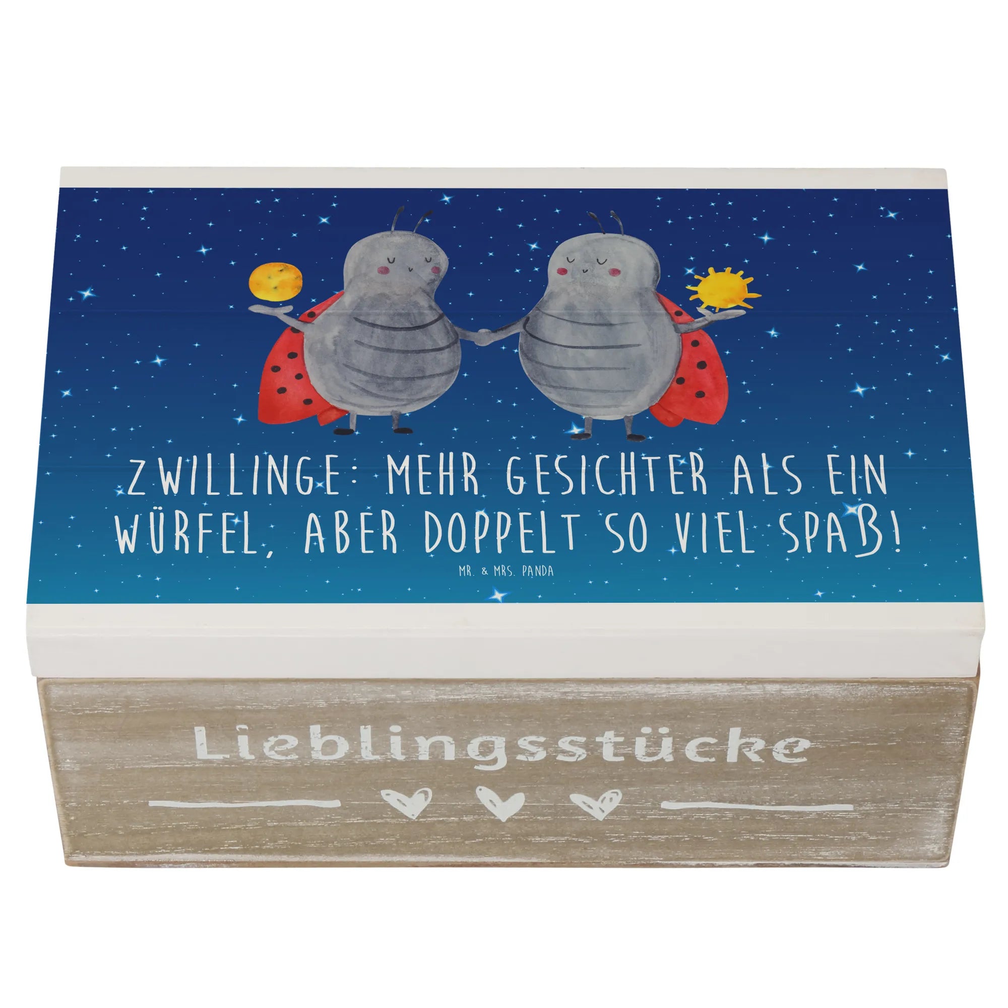 Ob als Aufbewahrungsbox oder Geschenkbox, die Holzkiste "Zwillinge" von Mr. & Mrs. Panda wird garantiert zum Highlight in jedem Zuhause. Hol dir jetzt deine Erinnerungskiste und lass dich von der Magie der Sternzeichen verzaubern!