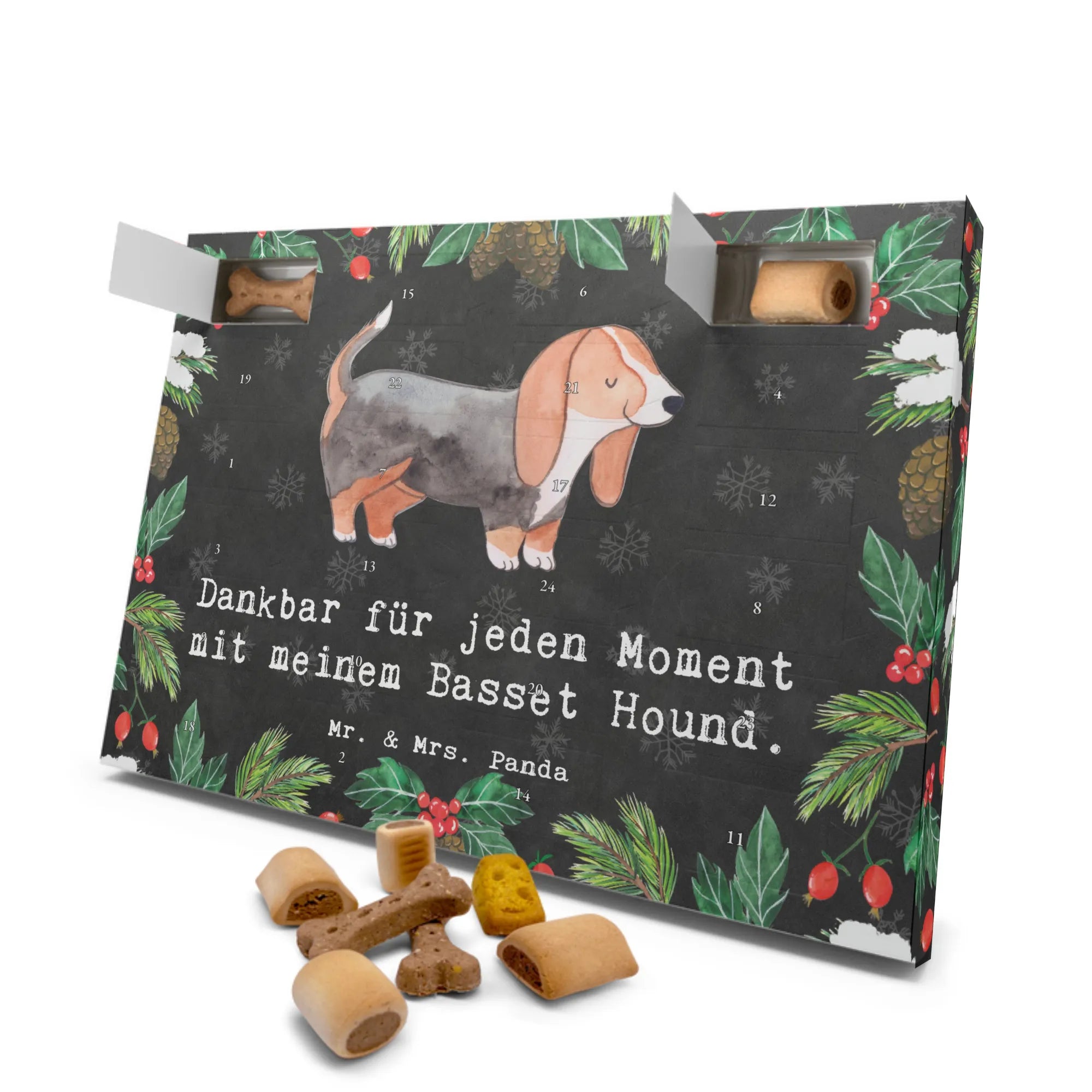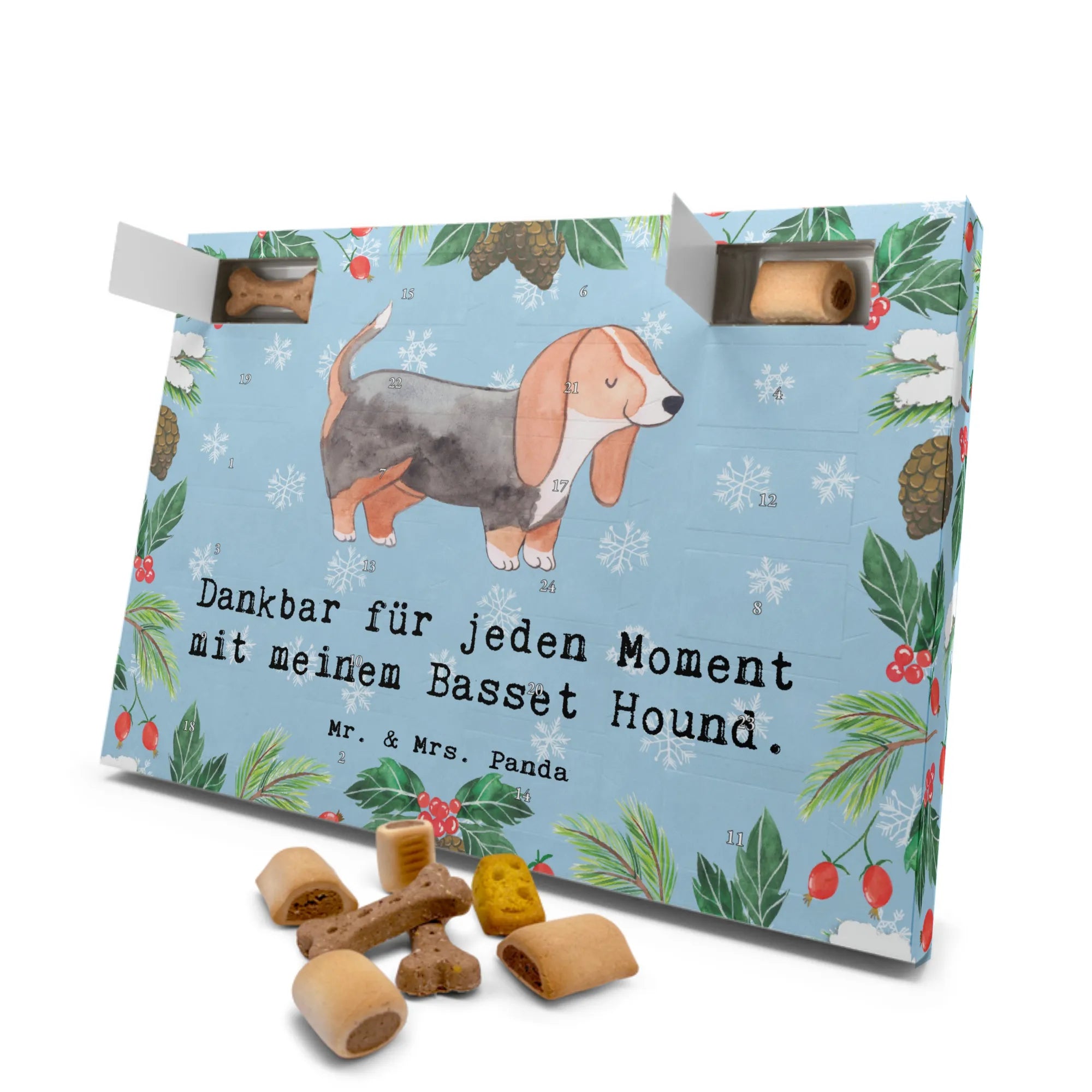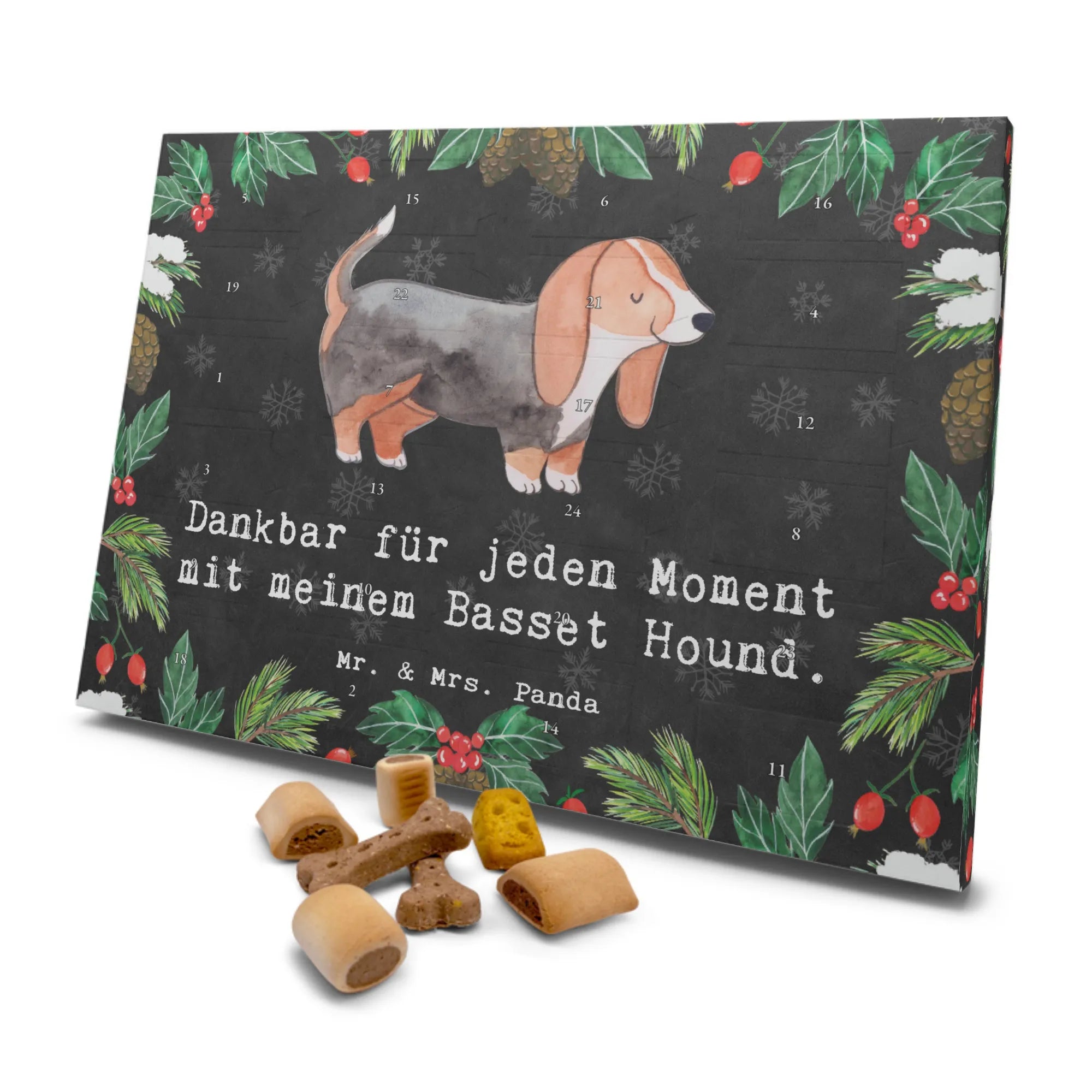 Der Hunde Adventskalender "Basset Hound Moment" von Mr. & Mrs. Panda ist das perfekte Geschenk für jeden Hundeliebhaber. Erlebe die Vorfreude auf Weihnachten gemeinsam mit deinem geliebten Vierbeiner! Dieser einzigartige Adventskalender ist nicht nur mit liebevollen Motiven gestaltet, sondern auch gefüllt mit 24 köstlichen Premium-Hundekuchen, die aus hochwertigen Zutaten gebacken wurden. Ob Beef Cake Mix, Mini Knabberknochen, Käse Snack oder Panino Röllchen – die Auswahl wird deinem Hund das Wasser im Mund zusammenlaufen lassen!