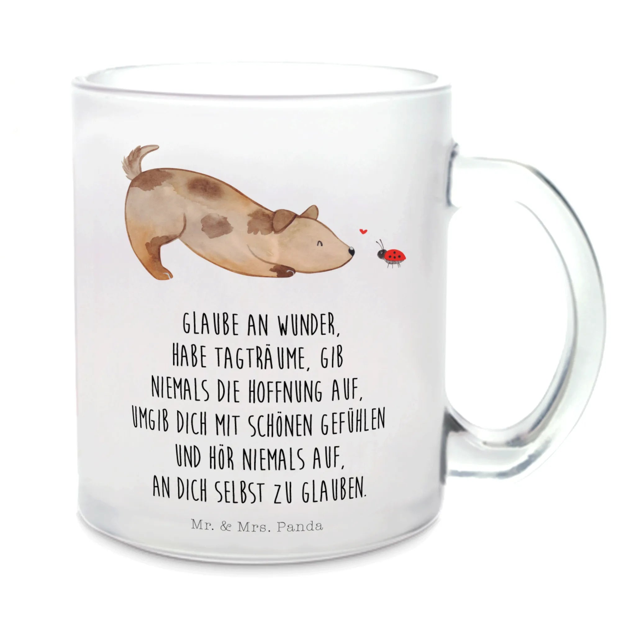 Entdecke die zauberhafte Teetasse mit dem süßen Hund und dem Marienkäfer aus der Hunde Kollektion von Mr. & Mrs. Panda! Diese edle Tasse aus robustem Premiumglas ist nicht nur ein echter Hingucker, sondern auch der perfekte Begleiter für Deine heißgeliebten Teestunden.