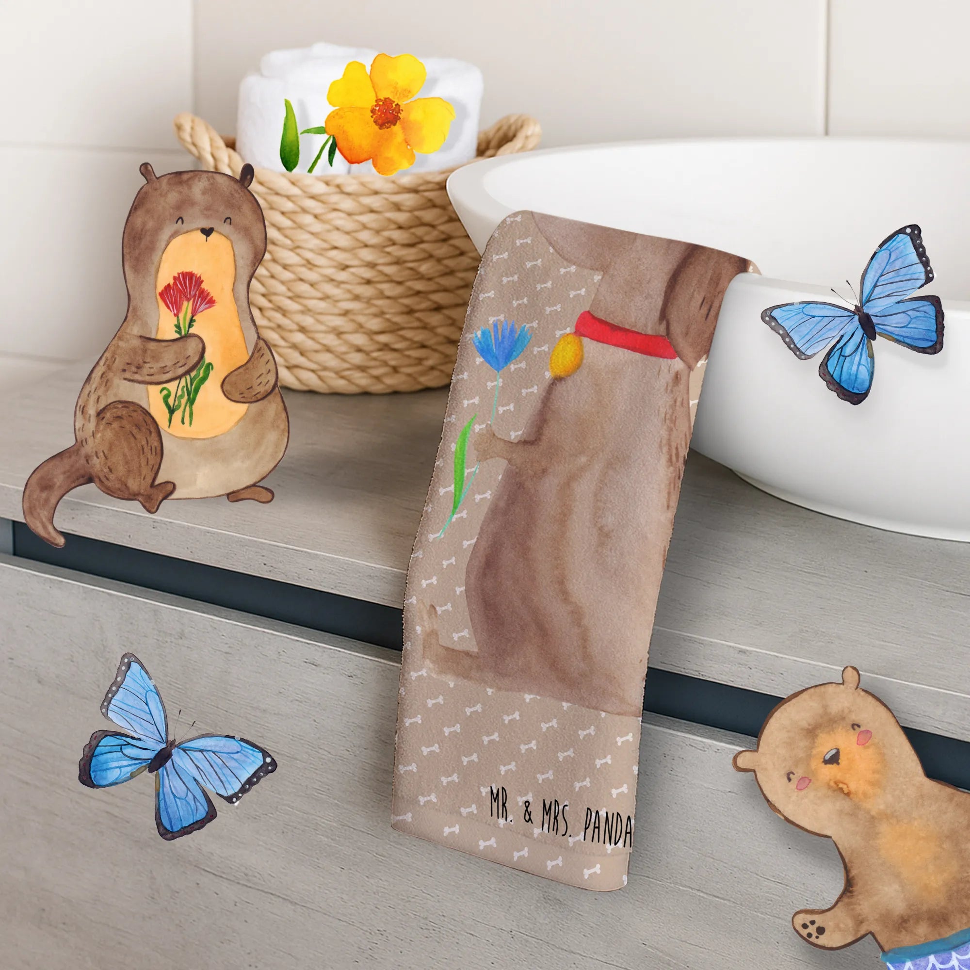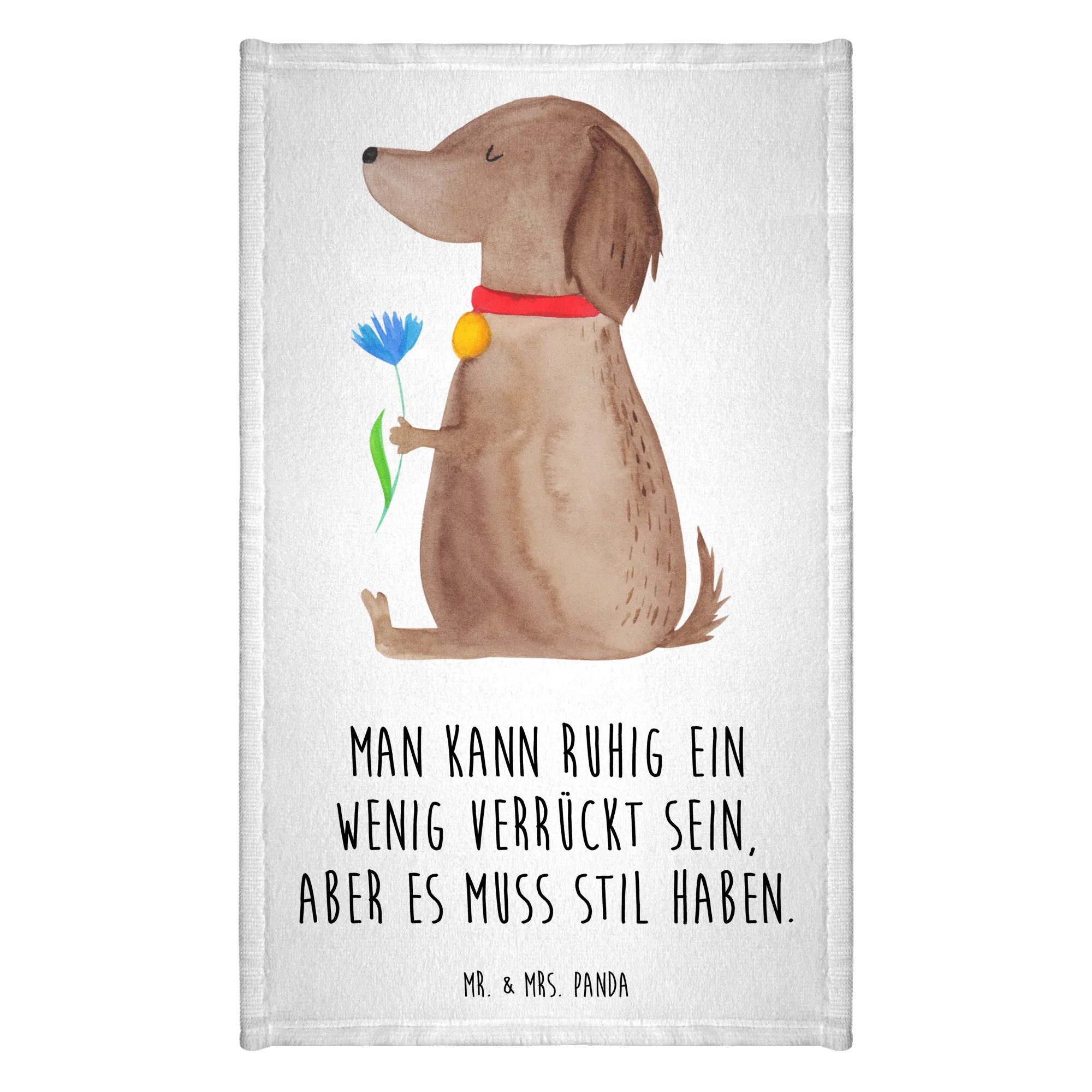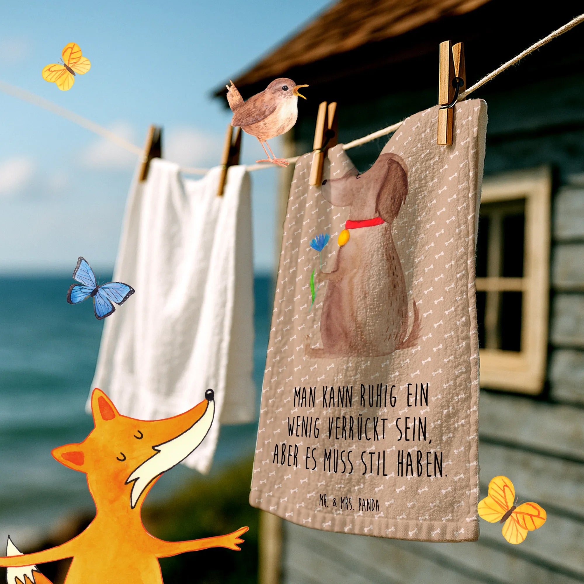 Ein zauberhaftes Gästehandtuch von Mr. & Mrs. Panda: Unser Gästehandtuch „Hund Blume“ aus der liebevollen Hunde Kollektion bringt Hundeglück ins Bad. Die süße Hündin mit einer Blume im Fell ist liebevoll von Mrs. Panda in Aquarell gezeichnet und mit dem frechen Spruch „Man kann ruhig ein wenig verrückt sein, aber es muss Stil haben.“ versehen. 🎀