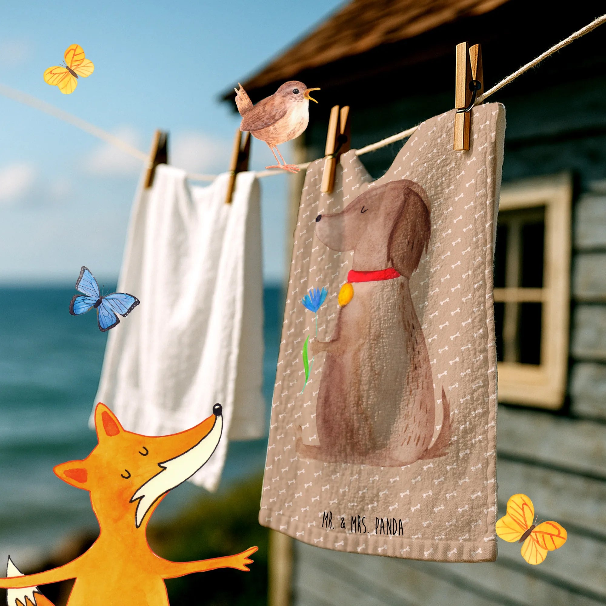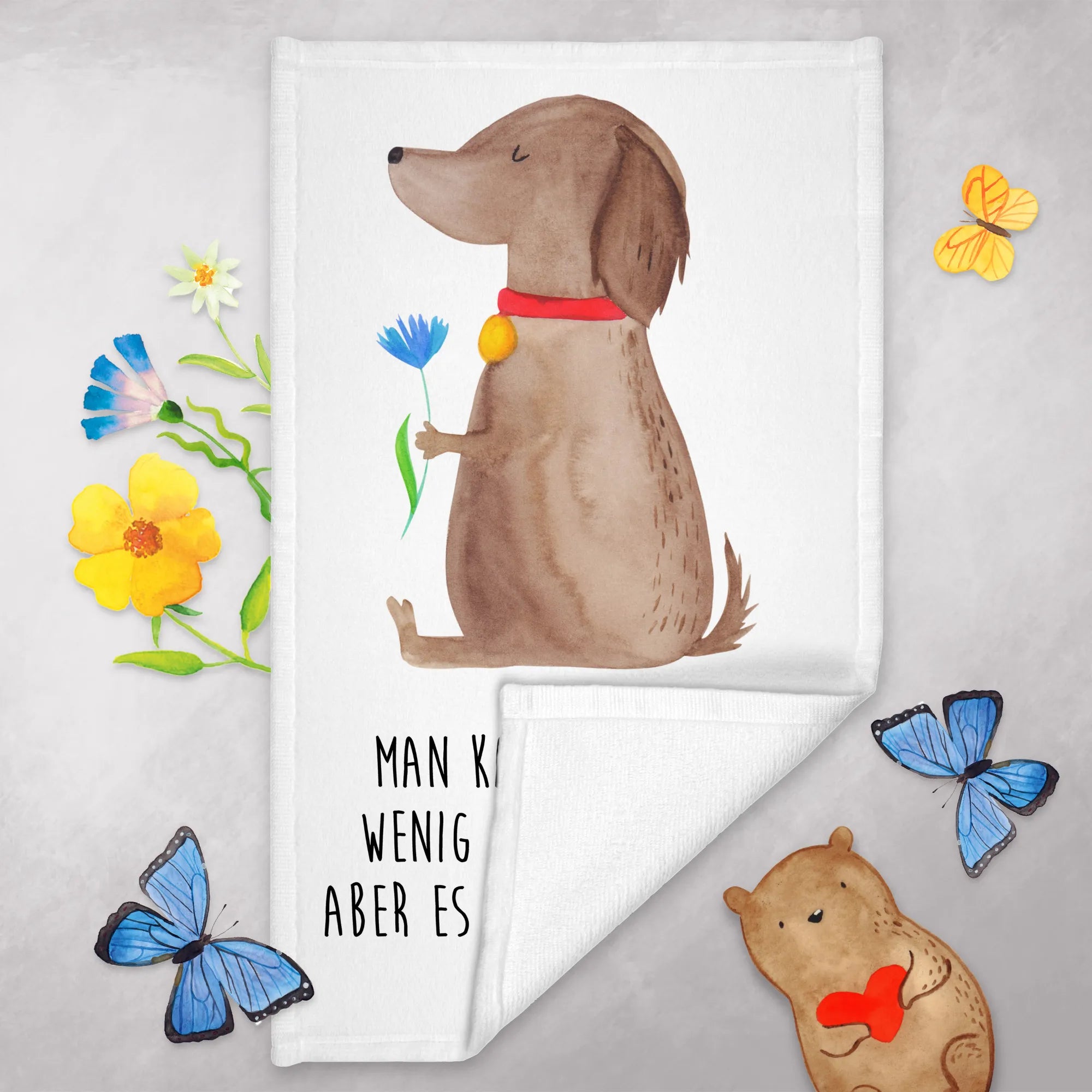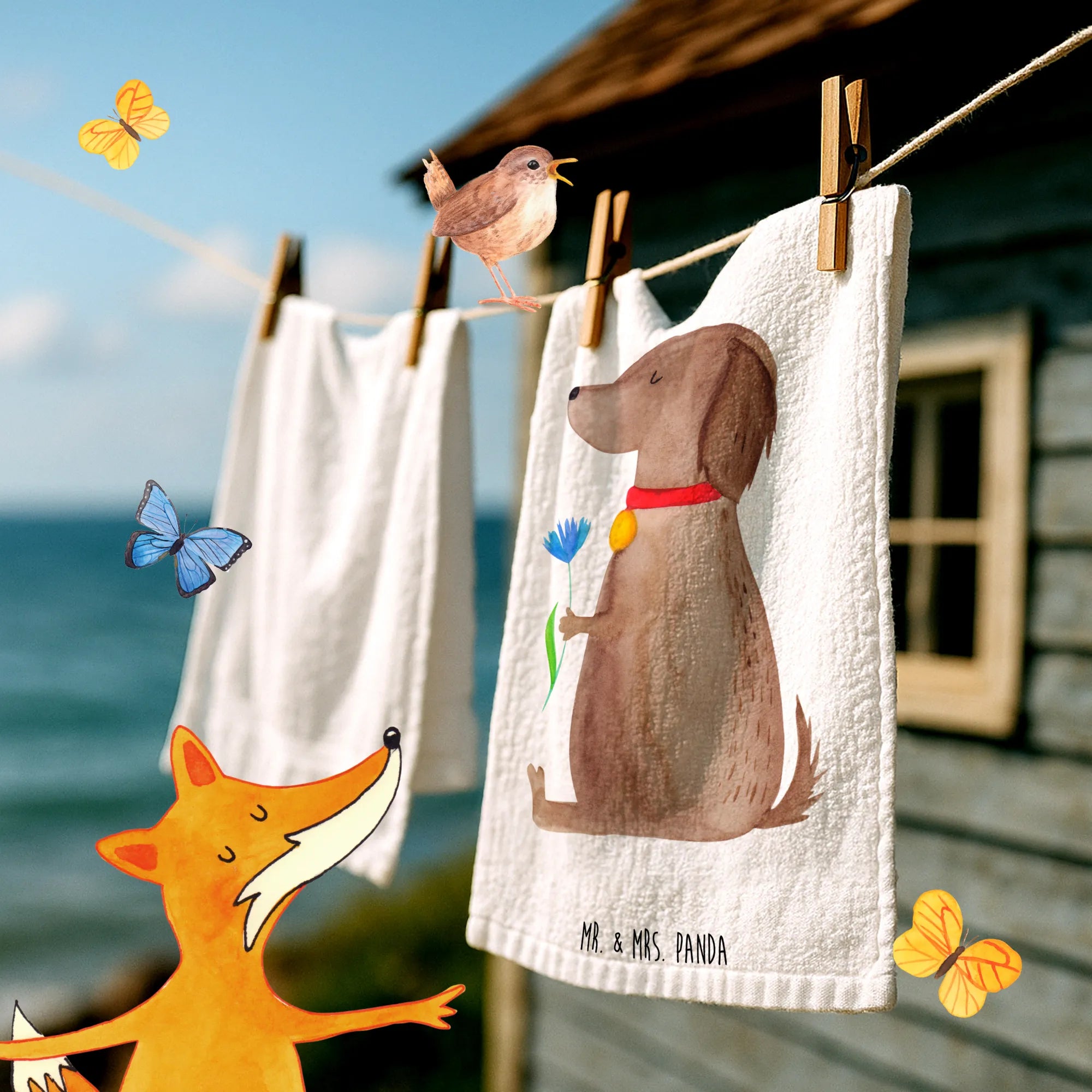 Ein zauberhaftes Gästehandtuch von Mr. & Mrs. Panda: Unser Gästehandtuch „Hund Blume“ aus der liebevollen Hunde Kollektion bringt Hundeglück ins Bad. Die süße Hündin mit einer Blume im Fell ist liebevoll von Mrs. Panda in Aquarell gezeichnet und mit dem frechen Spruch „Man kann ruhig ein wenig verrückt sein, aber es muss Stil haben.“ versehen. 🎀