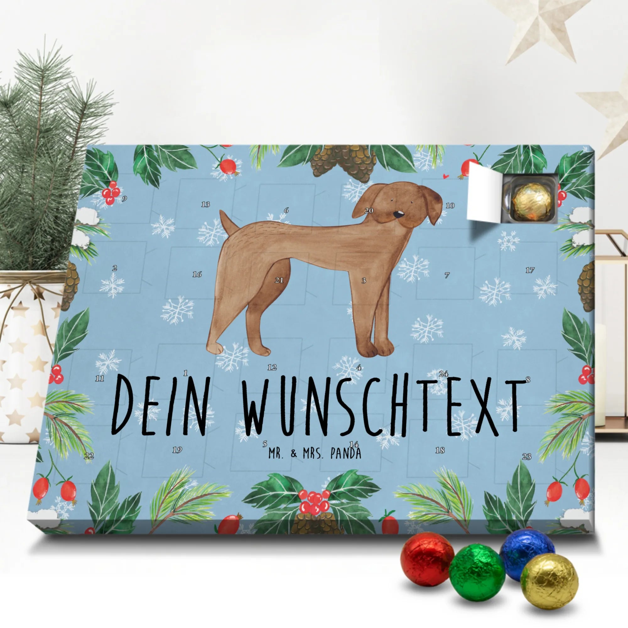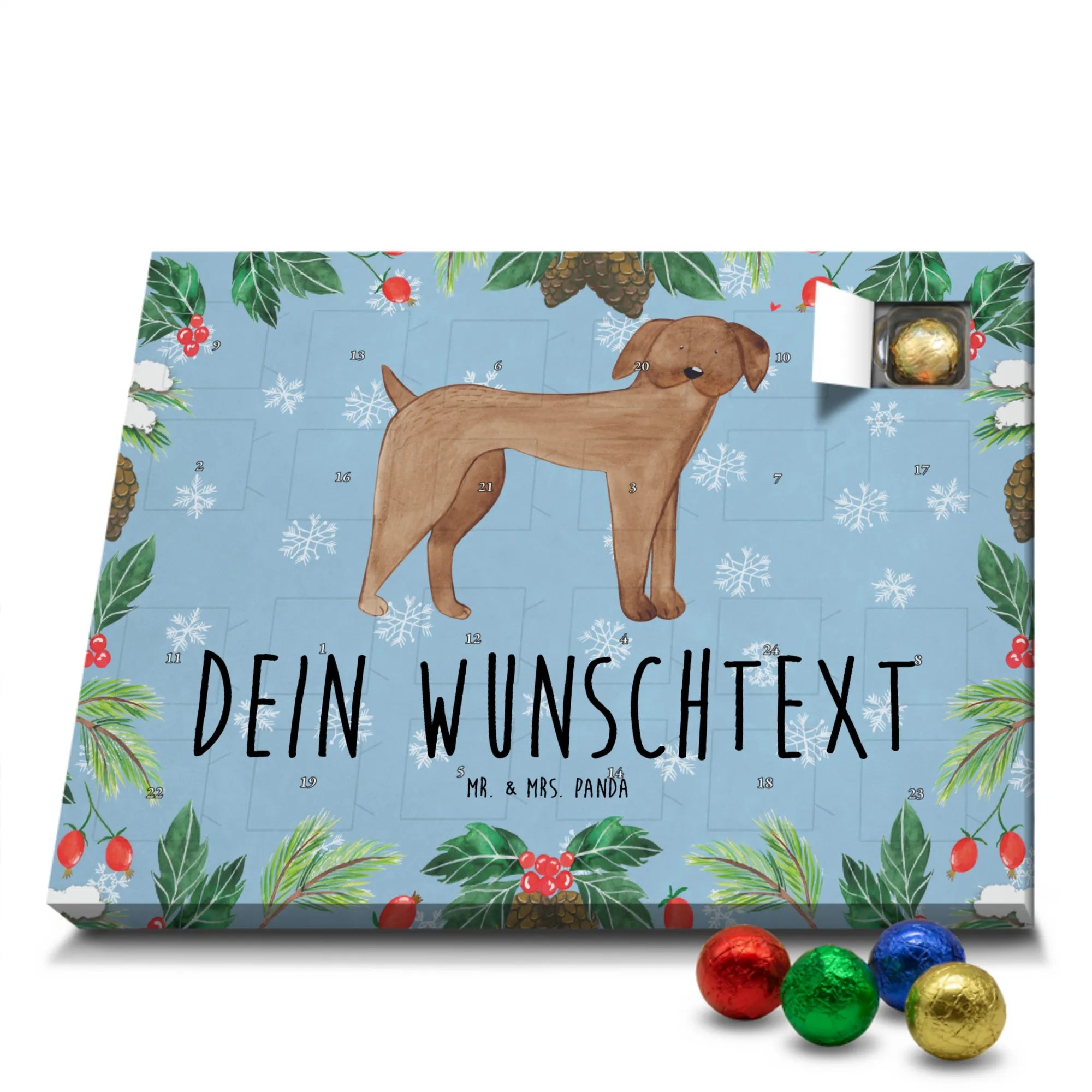 Du suchst einen besonderen Adventskalender? Unser Personalisierter Schoko-Adventskalender von Mr. & Mrs. Panda ist perfekt für dich! Er ist liebevoll gestaltet, mit vielen süßen Motiven und kurzen Sprüchen bedruckt und lässt sich ganz individuell mit deinem Wunschnamen oder einem Wunschtext personalisieren. Die hochwertige Bedruckung erhält durch eine seidenmatte Veredelung einen edlen Look, und auch die Seitenflächen sind komplett bedruckt – so wirkt der Kalender von vorne bis hinten durchgestylt. Maße: 233 mm x 178 mm x 24 mm. Eine tolle Besonderheit: Du kannst ihn aufstellen oder an die Wand hängen, je nachdem, wo er bei dir am besten zur Geltung kommt. Gefüllt ist der Kalender mit MARKENNAMEN Schokolade sowie leckeren Schokoladenkugeln für echte Genießer. Bitte beachten: (Kann Spuren von Haselnüssen, Mandeln, Gluten und Soja enthalten!), kühl und trocken lagern! Ob als Geschenk für Freunde oder als personalisierte Überraschung für dich selbst – dieser Kalender bringt Freude und süße Momente in die Vorweihnachtszeit. Hol ihn dir und gestalte deinen Advent mit persönlicher Note und liebevollen Panda-Motiven.