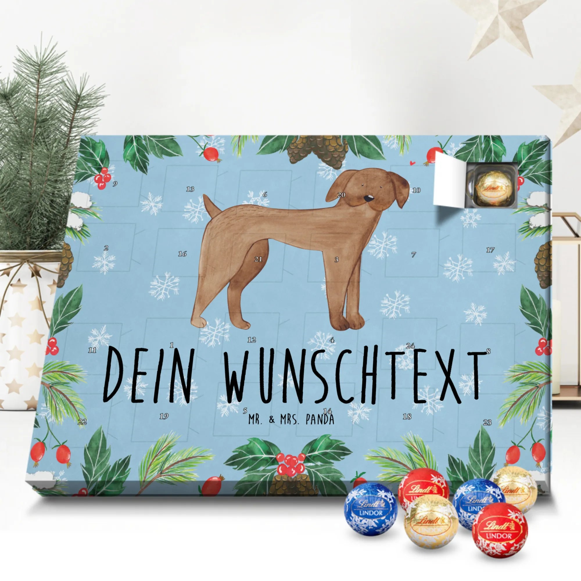 Personalisierter Adventskalender mit Schokolade von Mr. & Mrs. Panda – ein fröhlicher Blickfang in der Adventszeit! Der Kalender ist liebevoll gestaltet und bedruckt mit zauberhaften Motiven und positiven Sprüchen aus der Mr. & Mrs. Panda Kollektion. Du kannst ihn mit deinem Wunschnamen oder einem kurzen Wunschtext personalisieren, sodass jedes Türchen eine persönliche Botschaft trägt. Die brillante Druckqualität und die seidenmatte Oberflächenveredelung machen das Design besonders hochwertig, und die bedruckten Seitenflächen runden das Gesamtbild ab. Maße: 233 mm x 178 mm x 24 mm. Flexibel einsetzbar: entweder aufgehängt oder einfach aufgestellt – so wie es dir gefällt. Gefüllt mit Lindt Lindor Schokolade: 24 einzeln verpackte Markenschokoladen Kugeln in drei beliebten Sorten. Geschmacksrichtungen: Vollmilch, Feinherb und Weiße Schokolade. Zutaten: Zucker, pflanzliches Fett (Kokosnuss, Palmkern), Kakaobutter, Vollmilchpulver, Kakaomasse, Milchzucker, Magermilchpulver, Butterreinfett, Emulgator (Sojalecithin), Gerstenmalzextrakt, Aromen. Besondere Hinweise: Kann Haselnüsse und Mandeln enthalten. Verschenke Vorfreude und kleine Genussmomente – individuell, liebevoll und köstlich.