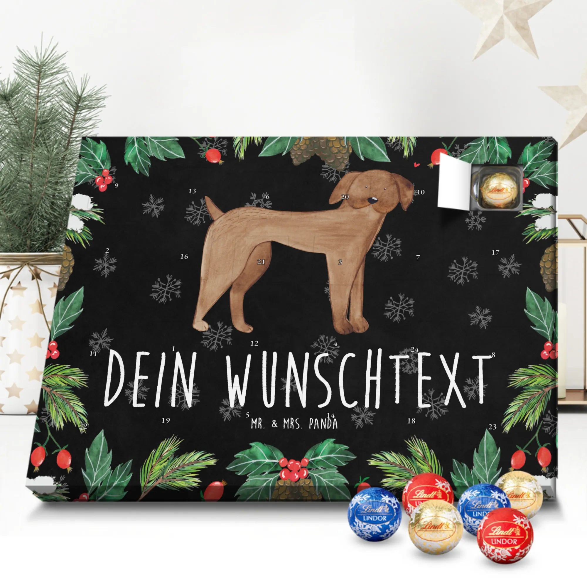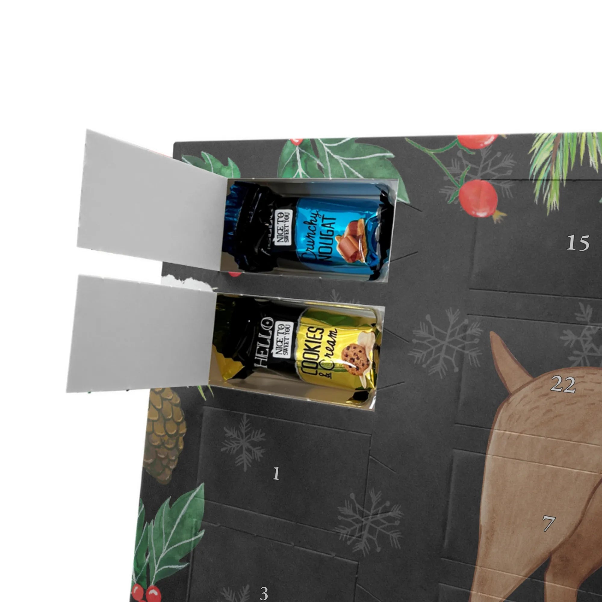 Klein, fein und persönlich: dieser Adventskalender ist unser liebevoll gestalteter Adventskalender mit Namen von Mr. & Mrs. Panda. Du bestimmst den Namen oder kurzen Text, wir drucken ihn auf den Kalender – zusammen mit unseren warmherzigen Illustrationen und Sprüchen. Die brillante Druckqualität und die seidenmatte Oberflächenveredelung sorgen dafür, dass dein Design hervorragend zur Geltung kommt. Bedruckte Seitenflächen runden das Gesamtbild ab. Der Kalender kann entweder aufgehängt oder aufgestellt werden, je nachdem, wie du ihn präsentieren möchtest. Gefüllt ist er mit Ritter Sport Schokowürfeln in sechs köstlichen Sorten: Mousse au Chocolat, Schoko Crisp, Voll-Nuss in Nougatcreme, Karamell Duo, Joghurt und Erdbeer-Joghurt – ideal, um jeden Adventstag mit einer kleinen Sünde zu versüßen. Maße: 325 mm x 225 mm x 27 mm – praktisch und dekorativ zugleich. Perfekt als Geschenk für Freunde, Familie oder Kollegen, die sich über eine personalisierte Überraschung freuen.