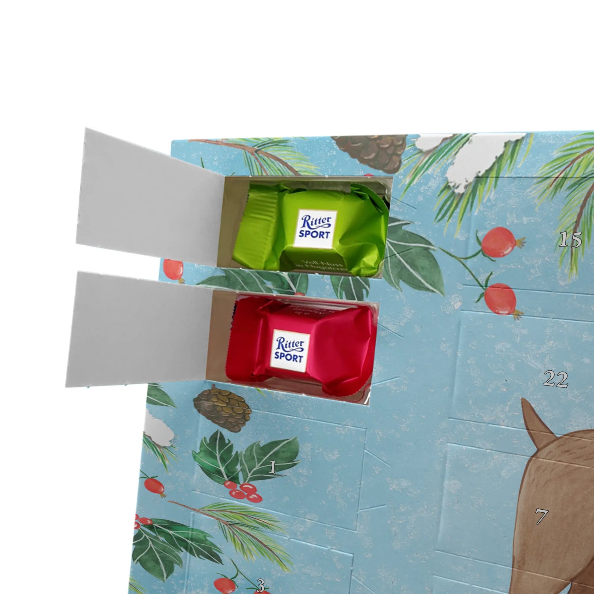 🐼 24 Türchen mit Ritter Sport Schokowürfeln in beliebten Sorten.