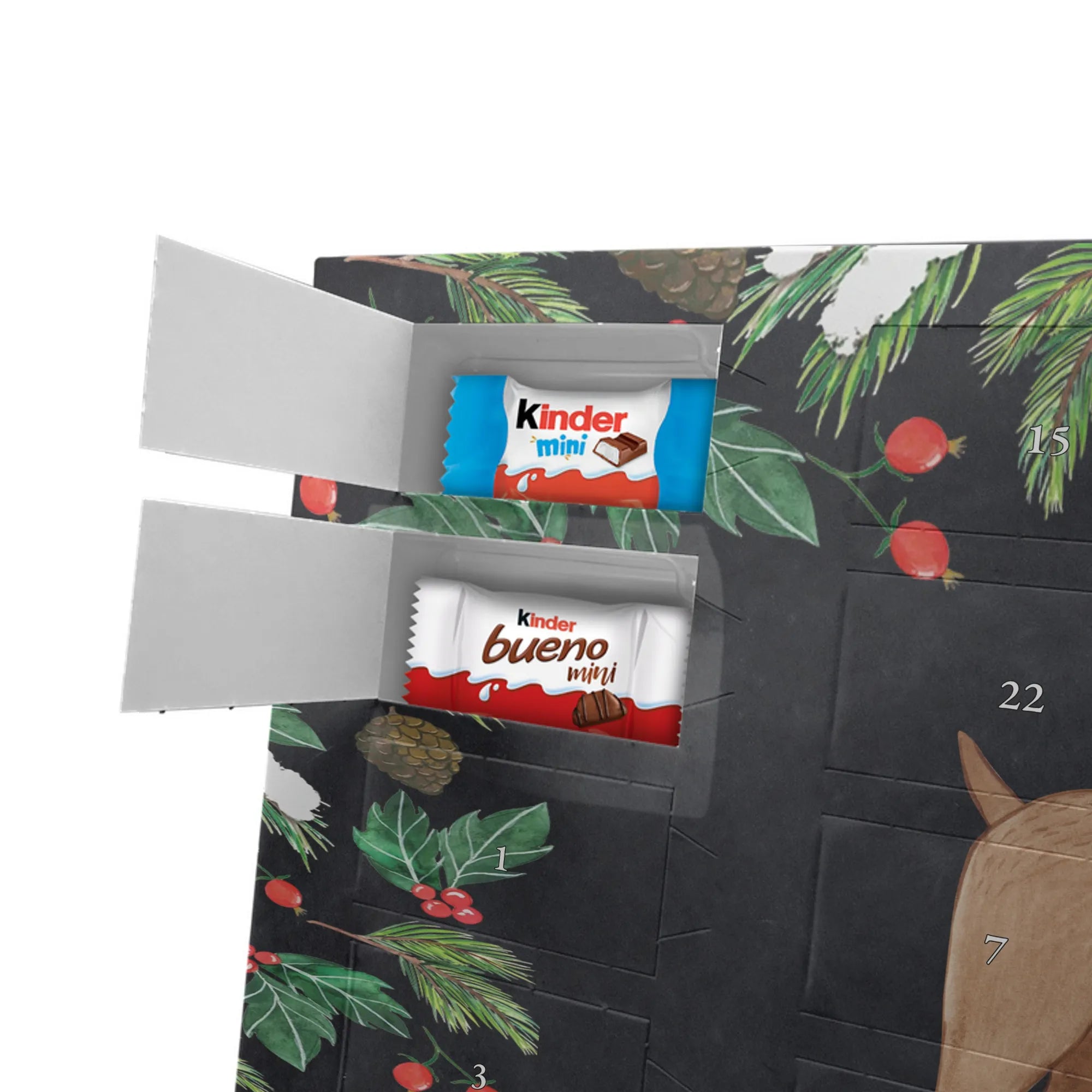 Fröhlich, persönlich und süß – unser Personalisierter Schoko Adventskalender von Mr. & Mrs. Panda bringt Wärme in die Adventszeit. Der Kalender ist liebevoll bedruckt mit wunderschönen Motiven & Sprüchen von Mr. & Mrs. Panda und lässt sich mit deinem Wunschnamen oder Wunschtext personalisieren, sodass jedes Türchen eine kleine, persönliche Überraschung wird. Die brillante Druckqualität in Kombination mit seidenmatter Oberflächenveredelung verleiht dem Kalender eine hochwertige Haptik. Auch die Seitenflächen sind bedruckt, damit dein Geschenk von allen Seiten überzeugt. Maße: 355 mm x 245 mm x 11 mm – praktisch und stilvoll. Besonderheit: kann aufgehängt oder aufgestellt werden, perfekt für Fensterbank, Kommode oder als Dekoration an der Wand. Gefüllt mit kinder® Schokolade: Adventskalender gefüllt mit kinder® Schokolade; Inhalt: kinder® Schoko-Bons, kinder® Bueno mini und kinder® Schokolade mini. Ob als Geschenk für die Liebsten oder als süße Belohnung für dich selbst – dieser Adventskalender verbindet tolles Design mit leckerem Inhalt und persönlicher Note.