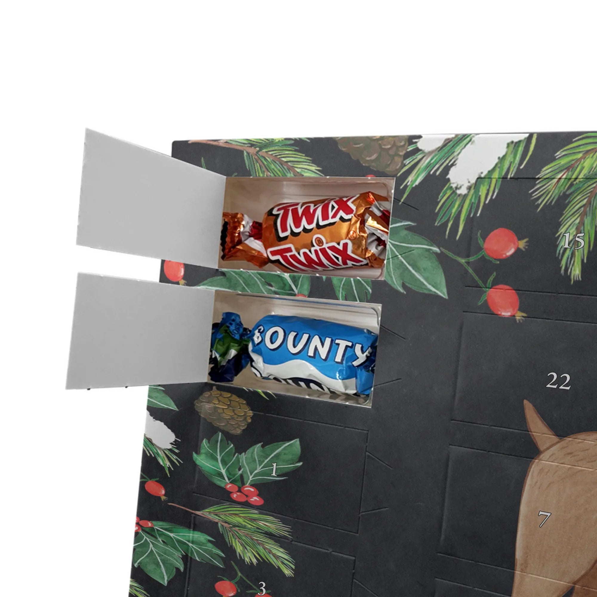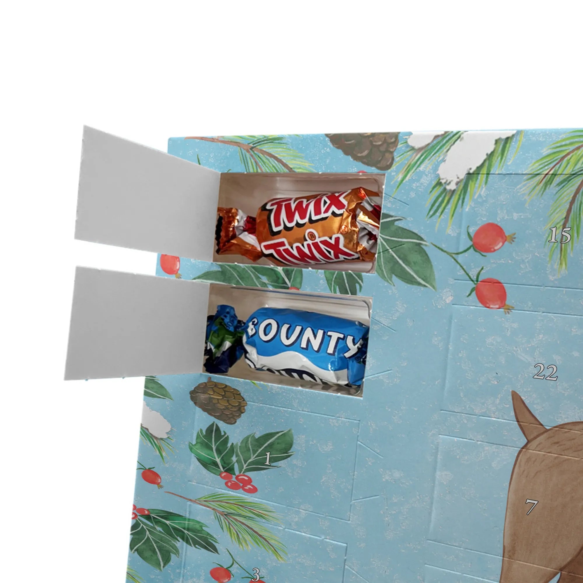 Wunderschöner Personalisierter Schoko Adventskalender von Mr. & Mrs. Panda – perfekt, um dir oder deinen Liebsten die Vorweihnachtszeit zu versüßen! Unser liebevoll gestalteter Adventskalender ist bedruckt mit wunderschönen Motiven & Sprüchen von Mr. & Mrs. Panda und lässt sich ganz individuell personalisieren: Trage einfach deinen Wunschnamen oder Wunschtext ein und wir drucken ihn sauber und farbenfroh auf die Vorderseite. Der Kalender besticht durch brillante Druckqualität und eine seidenmatte Oberflächenveredelung, die die Farben besonders edel aussehen lässt. Die Seitenflächen sind bedruckt, sodass das Motiv rundum zur Geltung kommt. Praktisch: Du kannst den Kalender sowohl aufgehängt als auch aufgestellt nutzen – je nachdem, wie es bei dir am schönsten aussieht. Gefüllt ist der Adventskalender mit Celebrations, inklusive 24 hochwertigen Füllungen in 8 verschiedenen Sorten wie Maltesers, Mars, Snickers, Twix, Milky Way, Bounty, Galaxy und Galaxy Caramel. Maße: 325 mm x 225 mm x 27 mm – kompakt genug, um überall Platz zu finden, und trotzdem groß genug für die leckeren Überraschungen hinter den Türchen. Ein tolles Geschenk für Familie, Freunde oder die eigene Vorfreude – süß, persönlich und mit viel Liebe gestaltet.