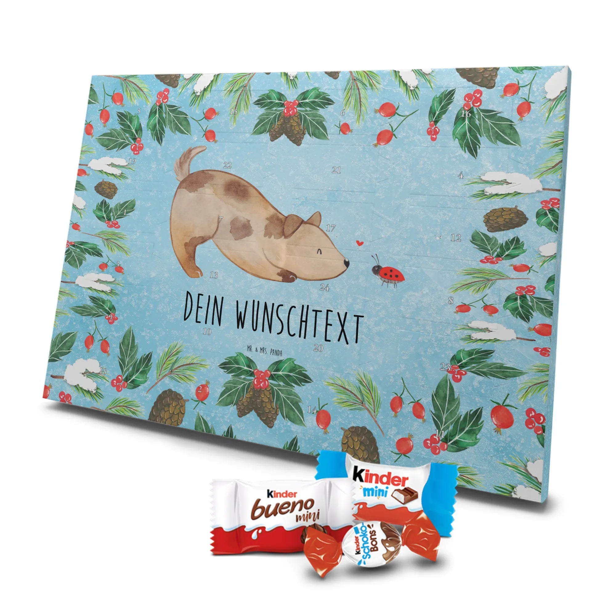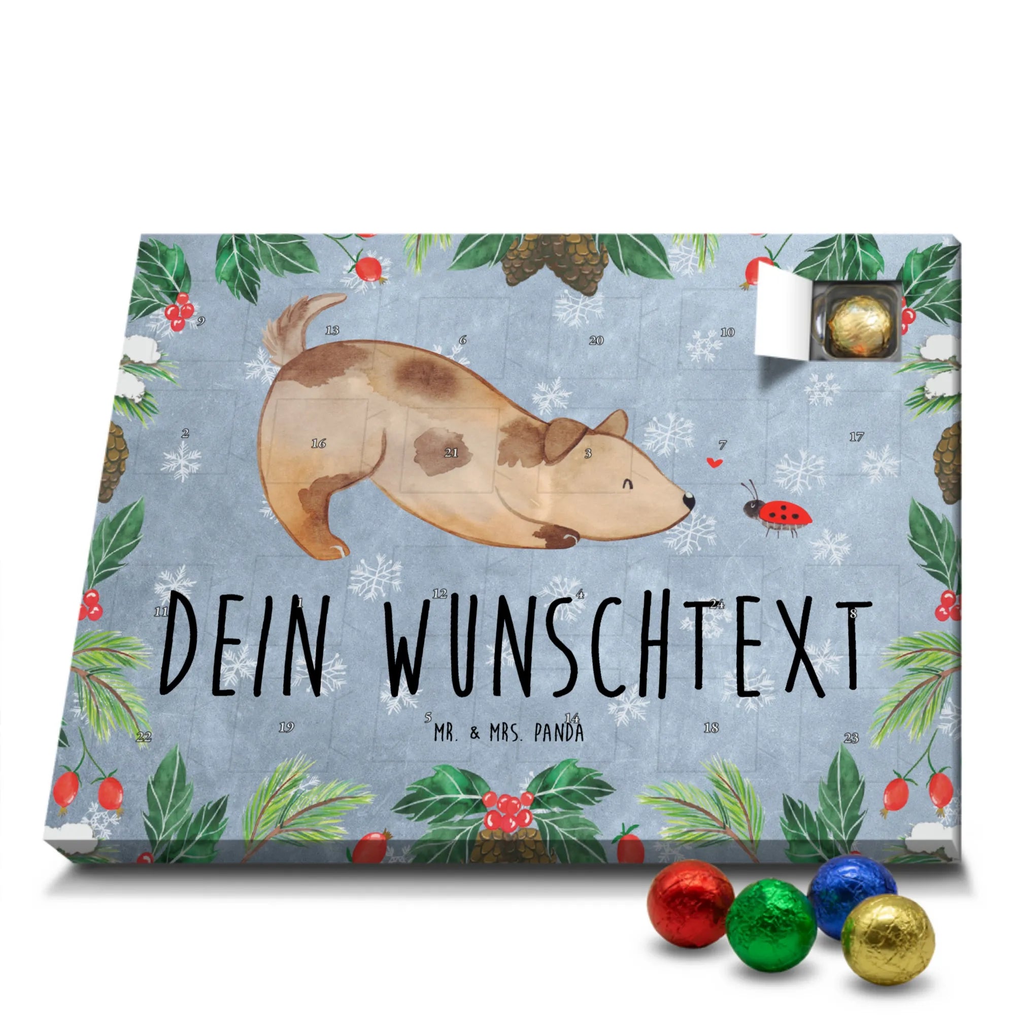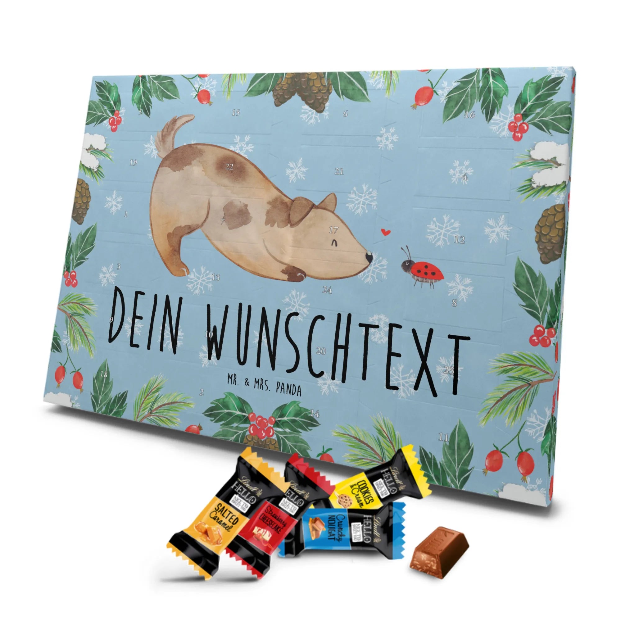 Verschenke Vorfreude mit Herz: Unser personalisierter Schoko Adventskalender Hund Marienkäfer aus der Hunde Kollektion von Mr. & Mrs. Panda ist das ideale Geschenk für Hundebesitzer, Tierfreunde und alle, die es liebevoll und persönlich mögen. Auf dem Vordergrund blickt ein süßer Mischlingshund voller Neugier auf einen kleinen Marienkäfer – ein Motiv, das lächeln lässt und sofort sympathisch wirkt.