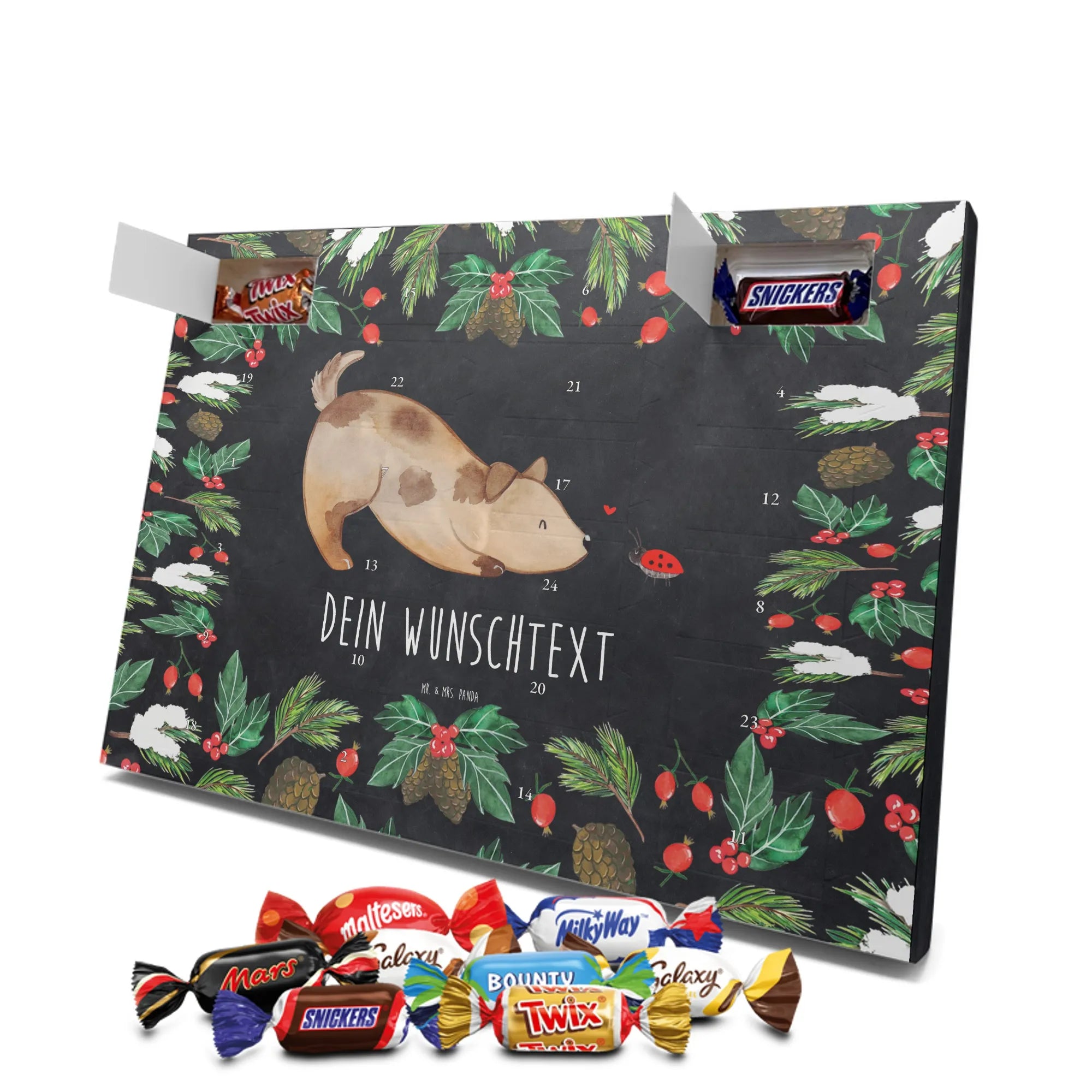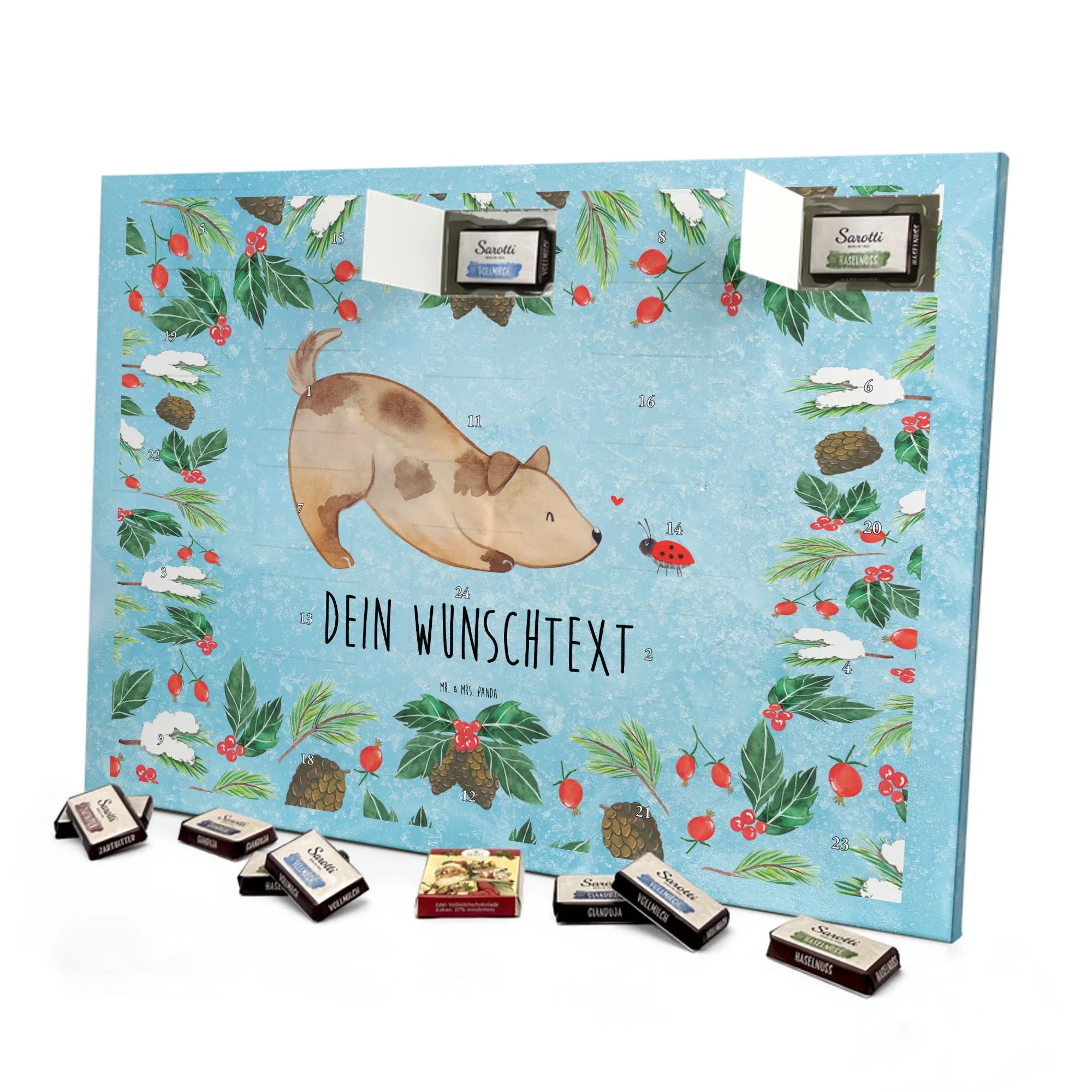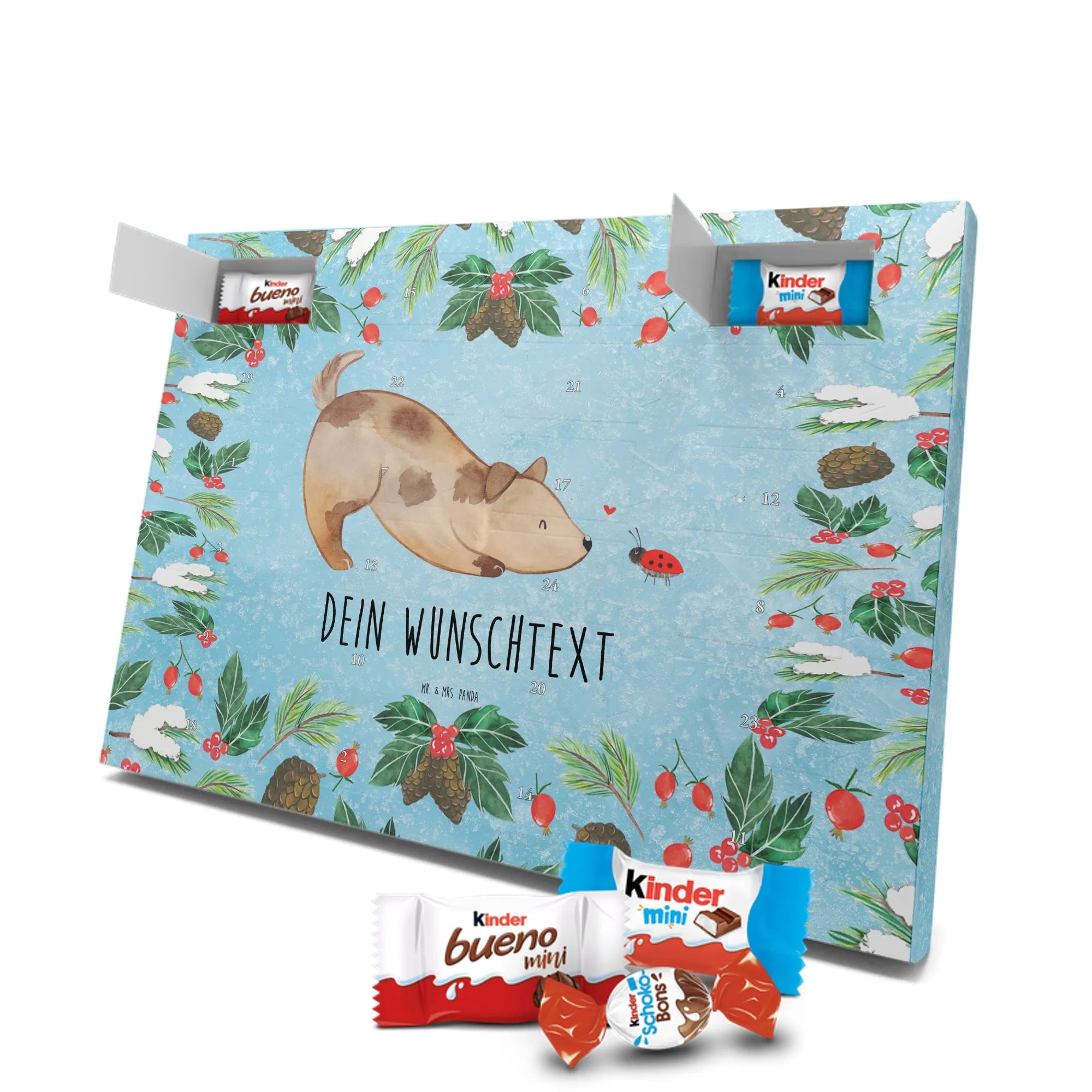 Verschenke Vorfreude mit Herz: Unser personalisierter Schoko Adventskalender Hund Marienkäfer aus der Hunde Kollektion von Mr. & Mrs. Panda ist das ideale Geschenk für Hundebesitzer, Tierfreunde und alle, die es liebevoll und persönlich mögen. Auf dem Vordergrund blickt ein süßer Mischlingshund voller Neugier auf einen kleinen Marienkäfer – ein Motiv, das lächeln lässt und sofort sympathisch wirkt.