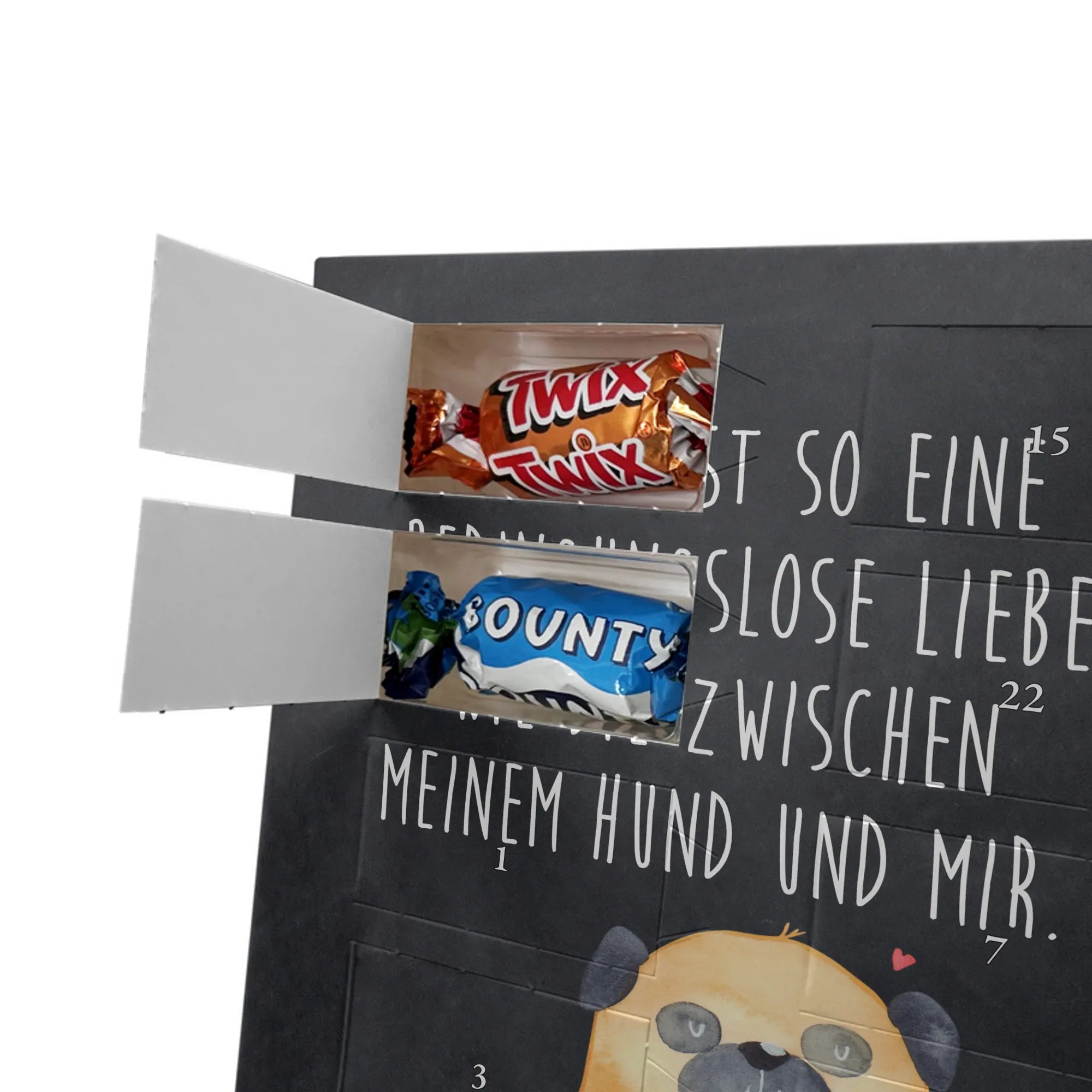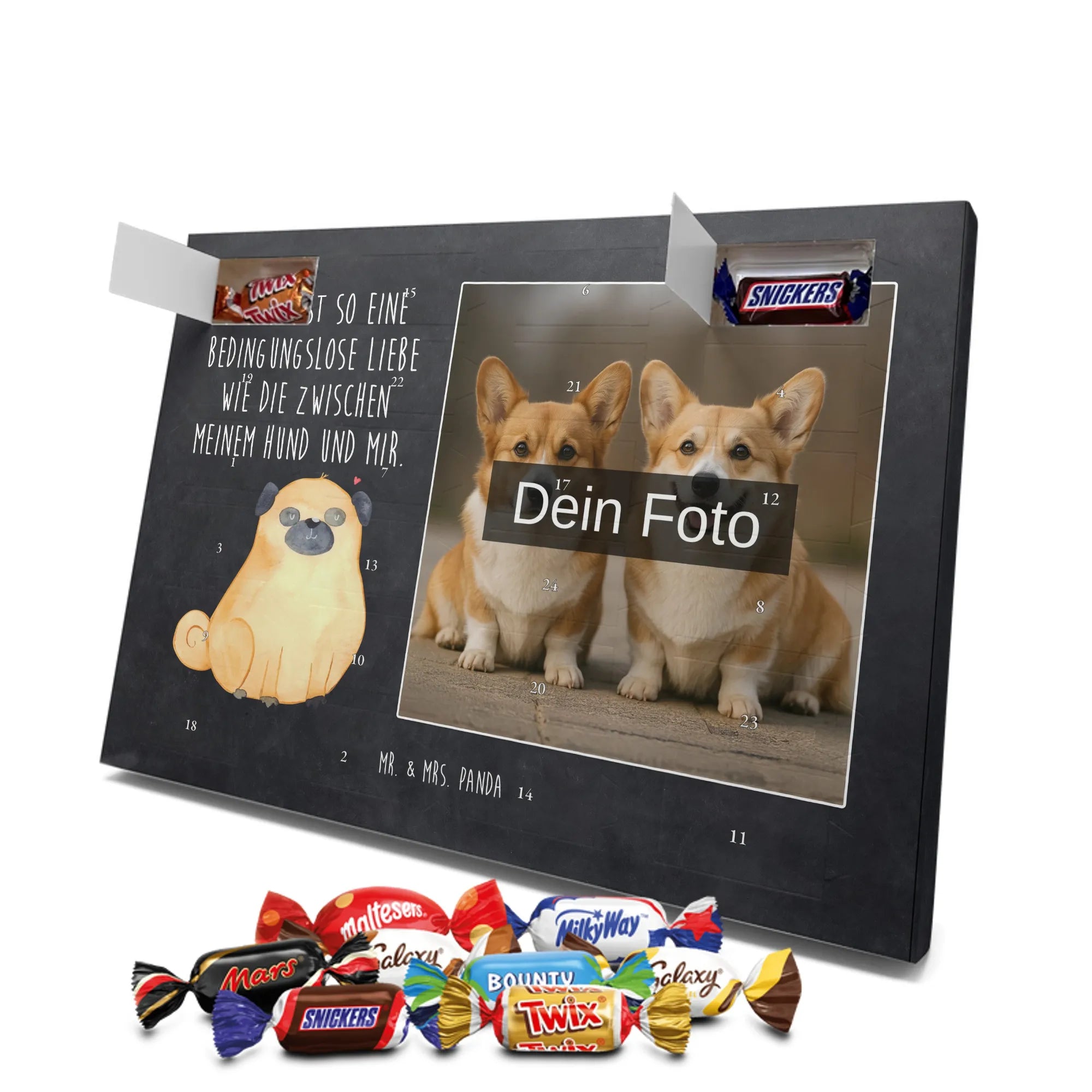 Herziger Personalisierter Foto Adventskalender mit Schokolade von Mr. & Mrs. Panda – perfekt, um schöne Erinnerungen sichtbar zu machen und jeden Dezembertag zu versüßen. Die Vorderseite ziert dein persönliches Foto, der Rest des Kalenders ist mit warmen Motiven und liebevollen Sprüchen von Mr. & Mrs. Panda gestaltet. Bitte lade ein Bild in hoher Auflösung hoch und prüfe den Bildausschnitt, damit nichts Wichtiges abgeschnitten wird. Verwende nur Fotos, bei denen du die Rechte besitzt oder die Zustimmung der abgebildeten Personen vorliegt. Unsere Drucke bestechen durch brillante Qualität und eine seidenmatte Oberflächenveredelung; auch die Seitenflächen sind bedruckt. Maße: 325 mm x 225 mm x 27 mm. Der Adventskalender lässt sich aufhängen oder aufstellen – ganz flexibel. Wichtiger Hinweis: Fotos werden nicht nachbearbeitet oder zugeschnitten; personalisierte Foto-Artikel sind vom Widerruf ausgeschlossen. Gefüllt ist der Kalender mit Celebrations Schokolade – 24 hochwertige Füllungen in 8 leckeren Sorten (Maltesers, Mars, Snickers, Twix, Milky Way, Bounty, Galaxy, Galaxy Caramel). Schenke ein persönliches Unikat, das Freude und Süße verbindet.