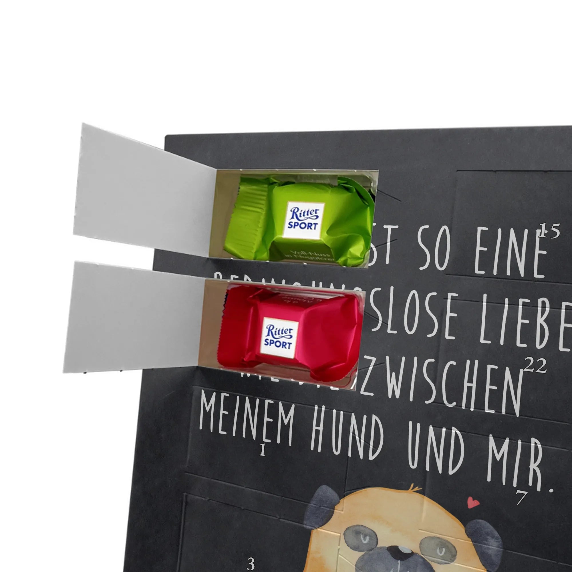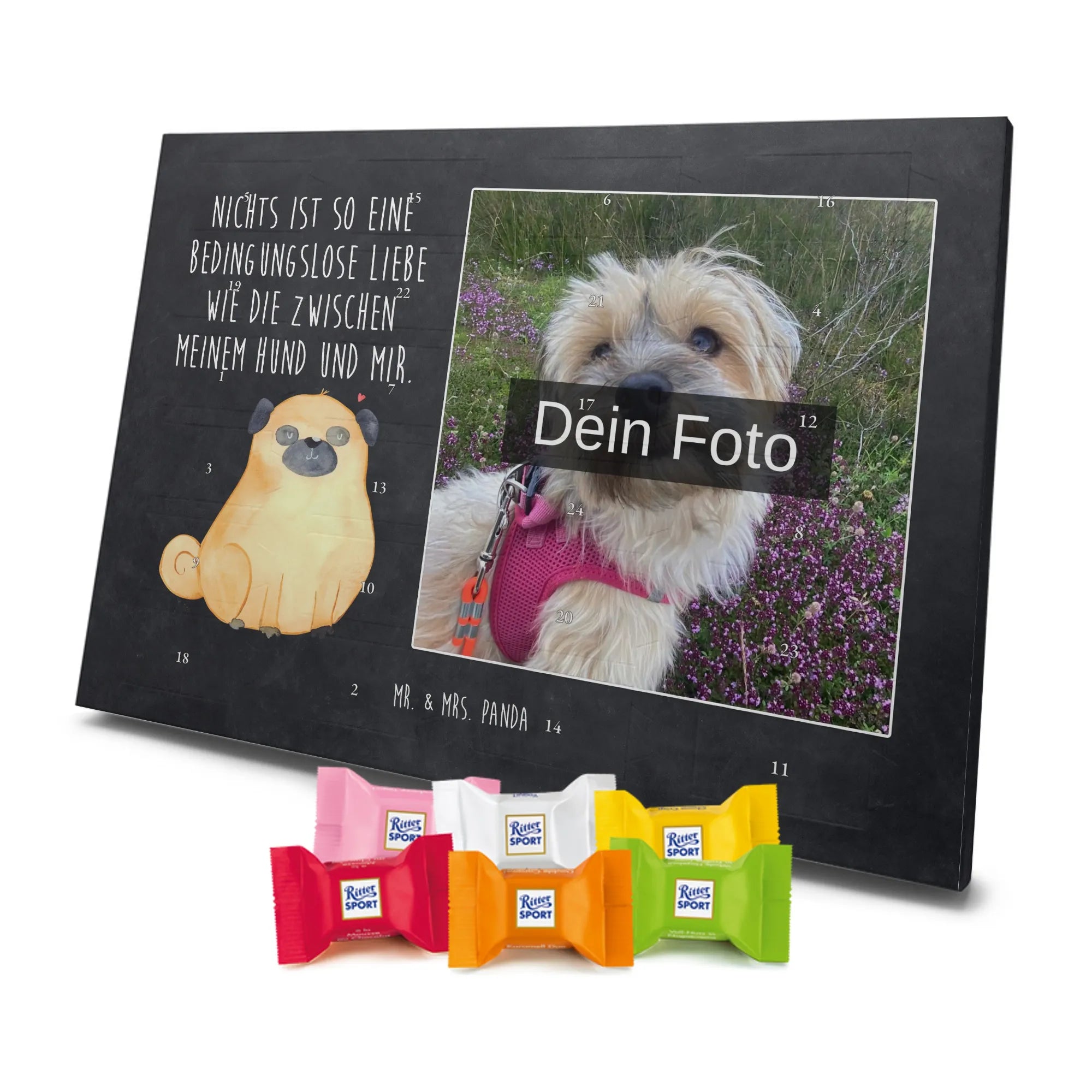 Schoko Foto Adventskalender personalisiert – ein fröhlicher Hingucker von Mr. & Mrs. Panda, der Adventszeit und Erinnerungen verbindet. Der Kalender ist bedruckt mit zauberhaften Motiven & Sprüchen von Mr. & Mrs. Panda und lässt sich ganz leicht mit einem Foto deiner Wahl personalisieren. Achtung Bildqualität: Für ein scharfes Druckbild solltest du ein Foto in hoher Auflösung verwenden. Kontrolliere den Bildausschnitt, damit wichtige Gesichter oder Details nicht verloren gehen. Verwende nur Fotos, für die du die Rechte besitzt oder die frei nutzbar sind. Bitte beachte: Die Fotos werden weder nachbearbeitet noch zugeschnitten und personalisierte Foto Artikel sind vom Umtausch ausgeschlossen. Die Verarbeitung überzeugt mit seidenmatter Oberflächenveredelung und bedruckten Seitenflächen für ein edles Finish. Maße: 325 mm x 225 mm x 27 mm. Besonderheit: Du kannst den Kalender aufhängen oder aufstellen – ganz flexibel. Gefüllt ist der Kalender mit Ritter Sport Schokowürfeln in leckeren Geschmacksrichtungen wie Mousse au Chocolat, Schoko Crisp, Voll-Nuss in Nougatcreme, Karamell Duo, Joghurt und Erdbeer-Joghurt. Ein liebevolles Geschenk, das jeden Tag im Advent versüßt.