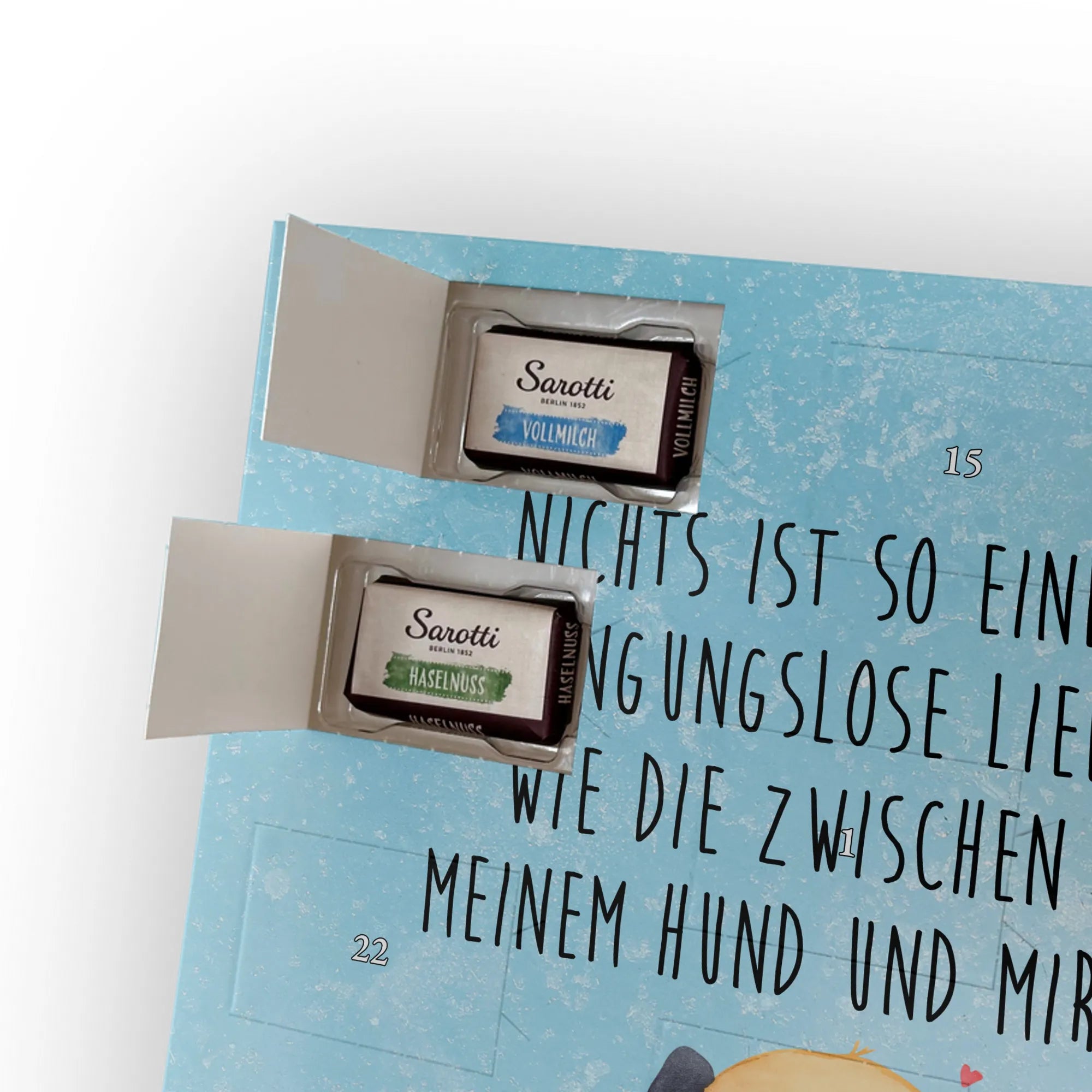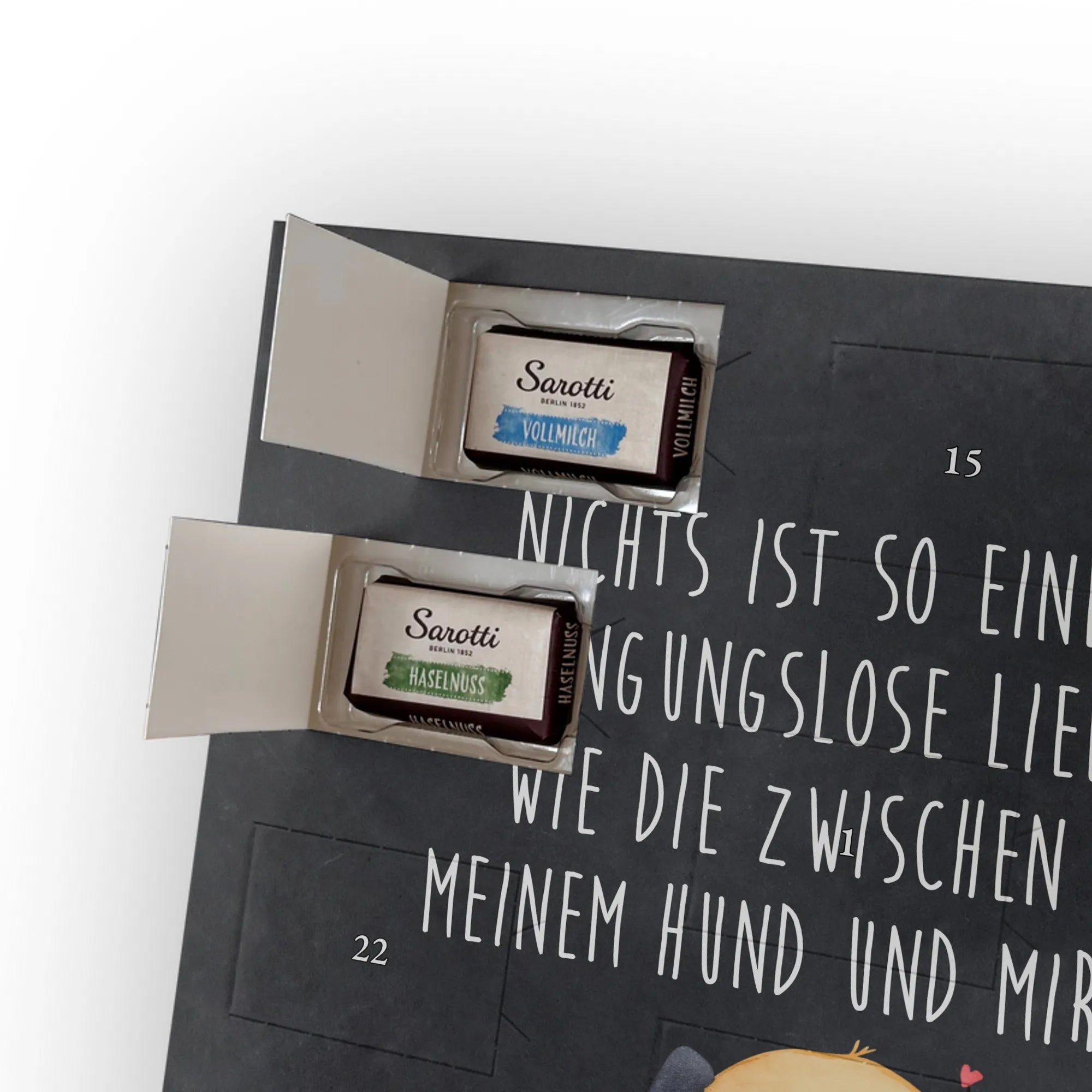 Personalisierter Schoko Foto Adventskalender – die süße, individuelle Adventsüberraschung von Mr. & Mrs. Panda! Jeder Kalender ist bedruckt mit unseren liebevollen Motiven und Sprüchen und kann mit deinem persönlichen Foto gestaltet werden. Für ein perfektes Druckergebnis achte bitte auf eine hohe Auflösung des Fotos und auf einen passenden Bildausschnitt; lade nur Bilder hoch, für die du die Rechte besitzt. Der Kalender überzeugt durch brillante Druckqualität, seidenmatte Oberflächenveredelung und bedruckte Seitenflächen. Maße: 355 mm x 245 mm x 11 mm – ideal zum Hinstellen oder Aufhängen. Hinweis: Die Fotos werden weder aufbereitet noch zugeschnitten; personalisierte Foto Artikel sind vom Rückgaberecht ausgeschlossen. Gefüllt mit einer hochwertigen Auswahl: 24 einzeln verpackte Schokoladentäfelchen in den Geschmacksrichtungen Vollmilch, Nougat, Zartbitter und Haselnuss von Sarotti® und Confiserie Heidel®. Insgesamt 107 g Markenschokolade sorgen für köstliche Adventsmomente. Verschenke Erinnerungen und Schokolade – ein persönliches Statement unter dem Weihnachtsbaum, mit ganz viel Mr. & Mrs. Panda Herz.