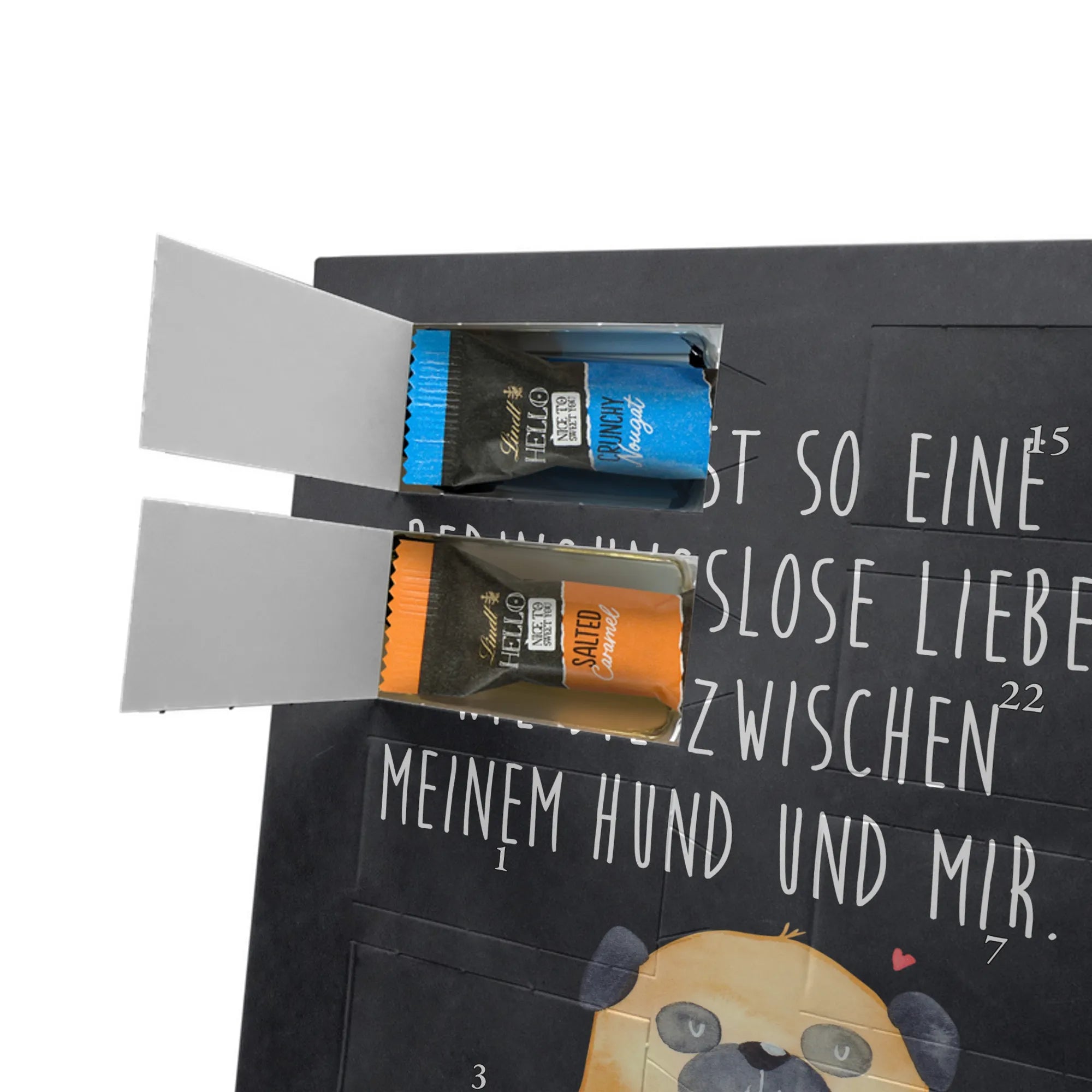 Wunderschöner Personalisierter Schoko Foto Adventskalender von Mr. & Mrs. Panda – perfekt, um dir oder deinen Liebsten die Vorweihnachtszeit zu versüßen. Dieser Adventskalender ist mit liebevollen Motiven und herzlichen Sprüchen von Mr. & Mrs. Panda bedruckt und du kannst ihn ganz einfach mit einem persönlichen Foto individualisieren. Achte bitte darauf, dass dein Foto eine hohe Auflösung hat und der Bildausschnitt passt, damit das Druckergebnis klar und strahlend wird. Lade nur Bilder hoch, an denen du die Bildrechte besitzt oder für die du die Erlaubnis hast. Die brillante Druckqualität mit seidenmatter Oberflächenveredelung sorgt für einen edlen Look, die Seitenflächen sind ebenfalls bedruckt. Maße: 325 mm x 225 mm x 27 mm. Der Kalender enthält 24 einzeln verpackte Schokoladen Mini Sticks in vier verschiedenen Sorten: Karamell-Schokoladenkuchen, Kekse, Knuspriger Nougat und Erdbeer-Cheesecake. Gefüllt mit Lindt Hello Schokolade. Allergene: Milcheiweiß, Milchzucker, Soja, Weizen, Haselnüsse. Kann Mandeln und andere Schalenfrüchte enthalten. Besonderheiten: Der Kalender kann aufgehängt oder aufgestellt werden. Bitte beachte: Die Fotos werden weder aufbereitet noch zugeschnitten – Rücknahme bei personalisierten Foto-Artikeln ist ausgeschlossen. Wir von Mr. & Mrs. Panda wünschen dir eine zuckersüße Adventszeit mit deinem ganz persönlichen Foto-Adventskalender!
