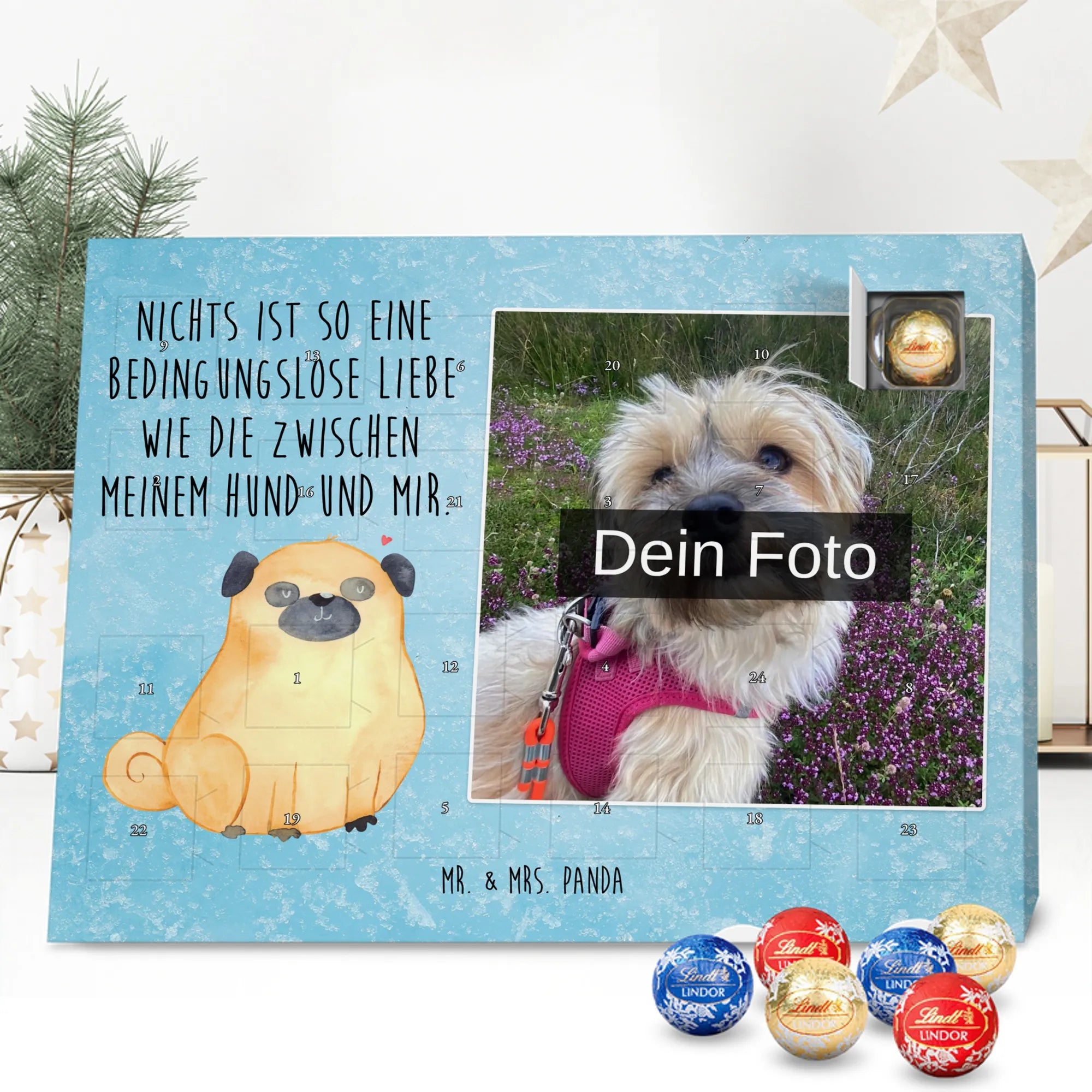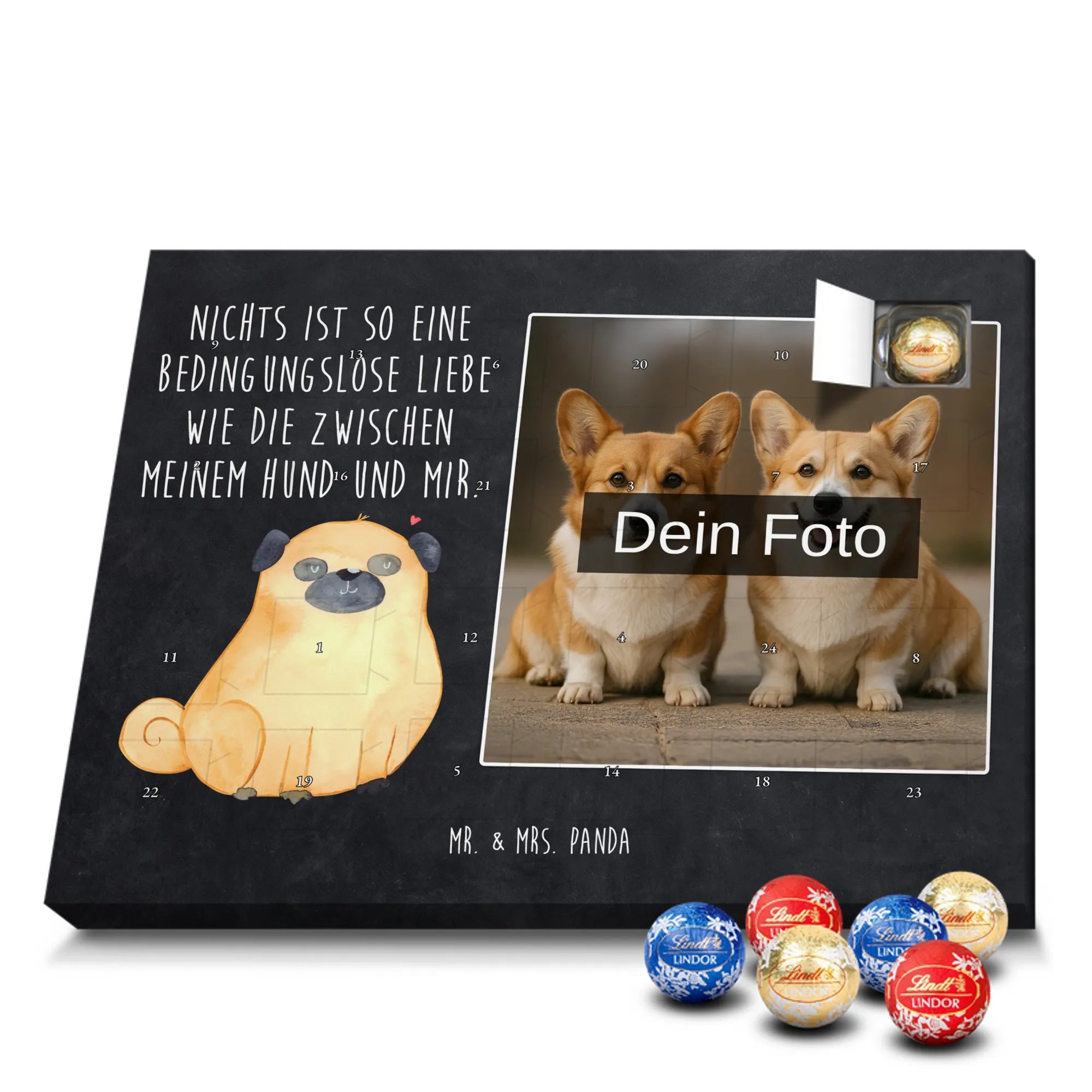 Entdecke unseren charmanten Personalisierter Schoko-Foto Adventskalender von Mr. & Mrs. Panda – ein liebevolles Geschenk für Freunde, Familie oder dich selbst. Aufdrucke mit süßen Motiven und herzlichen Sprüchen begleiten dein persönliches Foto, das du individuell hochlädst. Achte bitte auf eine ausreichende Auflösung des Bildes und einen passenden Bildausschnitt, damit das Druckbild klar bleibt. Wir weisen darauf hin, dass Fotos nicht nachbearbeitet oder zugeschnitten werden; achte daher auf Bildrechte und Zustimmung der abgebildeten Personen. Die Verarbeitung überzeugt durch eine seidenmatte Oberflächenveredelung und bedruckte Seitenflächen; dadurch wirkt der Kalender sehr hochwertig. Der Kalender ist vielseitig: Du kannst ihn sowohl aufstellen als auch aufhängen. Maße: 233 mm x 178 mm x 24 mm. Gefüllt mit Lindt Lindor Markenschokolade – 24 einzeln verpackte Markenschokoladen Kugeln in den Geschmacksrichtungen Vollmilch, Feinherb und Weiße Schokolade. Zutaten und Allergene sind auf der Verpackung angegeben; es kann Spuren von Haselnüssen und Mandeln geben. Hinweis: Personalisierte Foto-Artikel sind vom Umtausch ausgeschlossen.