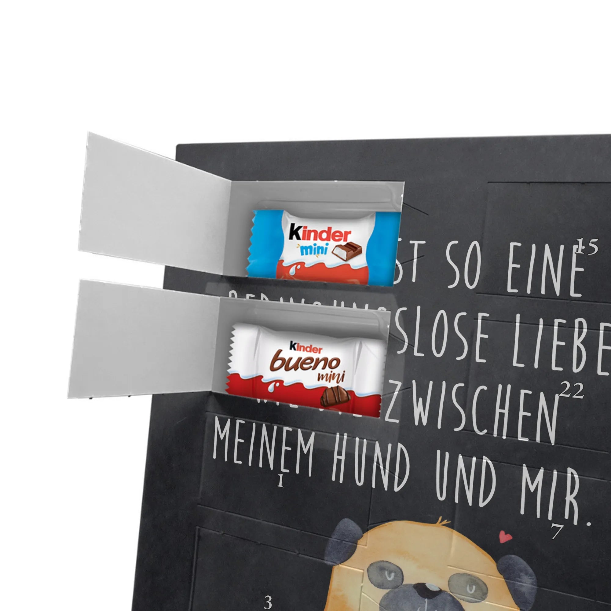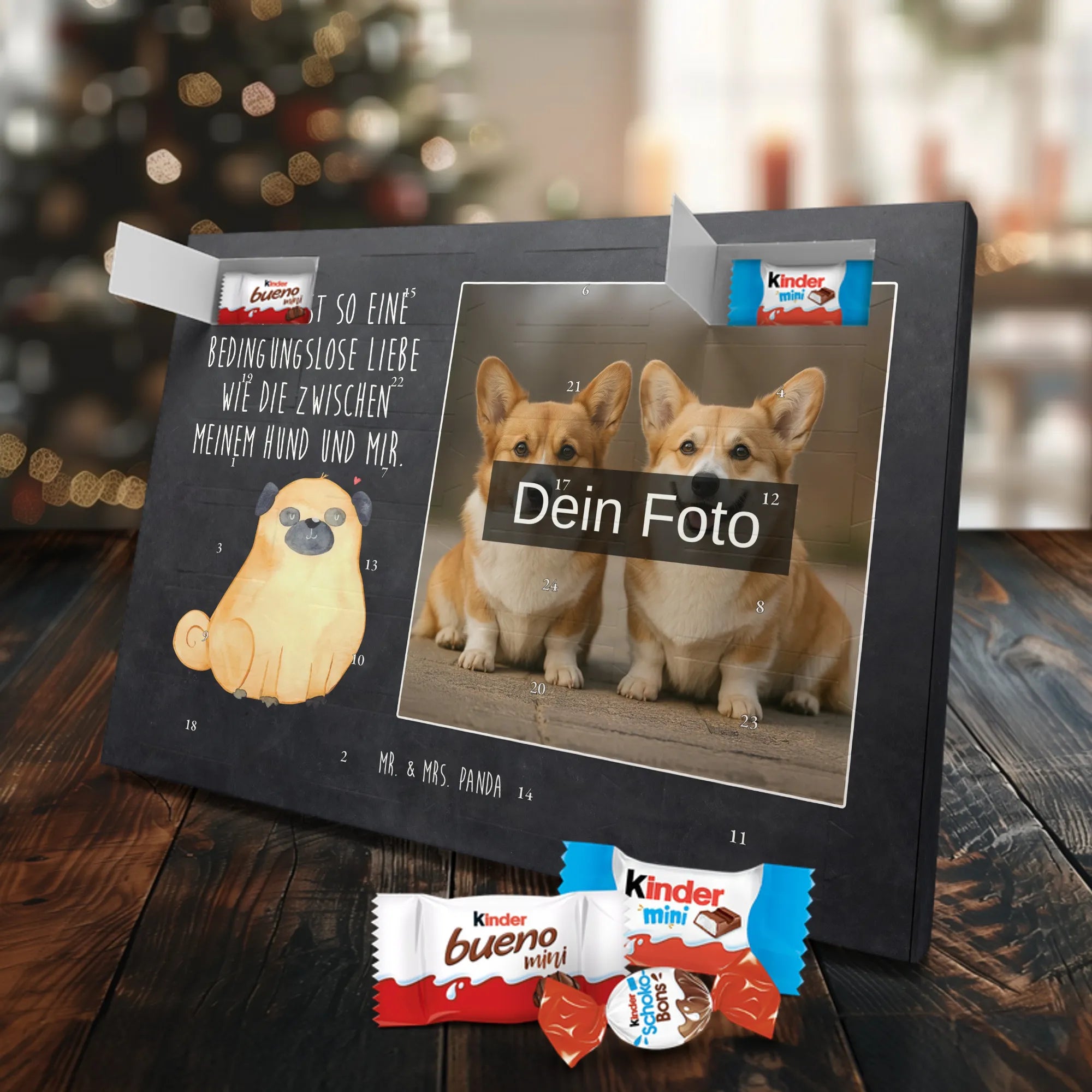 Unser personalisierten Schoko Foto Adventskalender ist ein echtes Highlight in der Adventszeit – handlich, individuell und voller süßer Überraschungen. Du personalisierst die Vorderseite mit deinem liebsten Foto und wir kombinieren es mit liebevollen Motiven und Sprüchen von Mr. & Mrs. Panda. Bitte achte auf eine ausreichende Bildauflösung und einen passenden Bildausschnitt, damit das Druckergebnis gestochen scharf ist. Lade nur Bilder hoch, deren Rechte du besitzt oder bei denen du die Erlaubnis hast, besonders wenn Personen darauf zu sehen sind. Wichtig: Fotos werden nicht retuschiert oder zugeschnitten; personalisierte Foto-Artikel sind vom Widerruf ausgeschlossen. Der Kalender besticht durch brillante Druckqualität und eine seidenmatte Oberflächenveredelung sowie bedruckte Seitenflächen. Maße: 355 mm x 245 mm x 11 mm. Du kannst ihn entweder aufstellen oder an die Wand hängen. Gefüllt ist der Adventskalender mit kinder® Schokolade, inklusive kinder® Schoko-Bons, kinder® Bueno mini und kinder® Schokolade mini. Ein liebevolles, persönliches Geschenk für Kinder, Freunde oder die bessere Hälfte – individuell, süß und mit dem typischen Mr. & Mrs. Panda Charme.