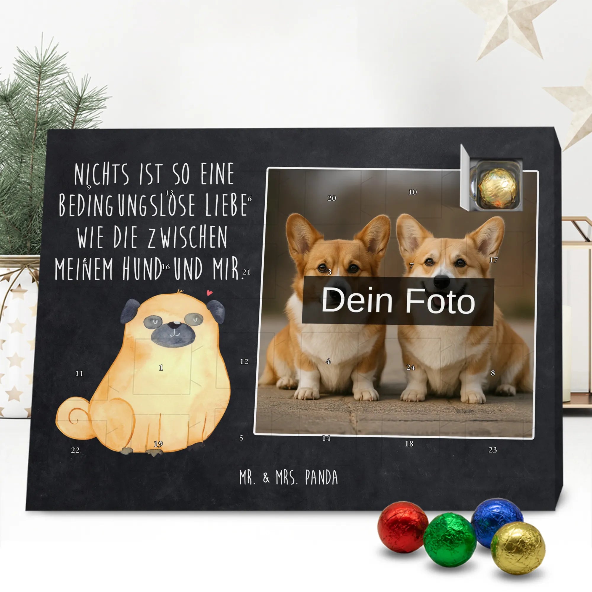 Liebevoll gestalteter Personalisierter Foto-Adventskalender von Mr. & Mrs. Panda – perfektes Geschenk für alle, die Weihnachten mit einer persönlichen Note mögen. Du erhältst einen Adventskalender, bedruckt mit unseren typischen Mr. & Mrs. Panda Motiven & Sprüchen, und kannst ein eigenes Foto einfügen. Bitte lade ein Foto in hoher Auflösung hoch und achte auf den Bildausschnitt, damit wichtige Gesichter und Details nicht verloren gehen. Verwende nur Bilder, für die du die Rechte besitzt oder eine Erlaubnis hast. Der Kalender überzeugt durch brillante Druckqualität, eine seidenmatte Oberflächenveredelung und bedruckte Seitenflächen. Maße: 233 mm x 178 mm x 24 mm. Besonderheit: Der Kalender kann aufgehängt oder aufgestellt werden. Hinweis: Die Fotos werden weder aufbereitet noch zugeschnitten; Rücknahme bei personalisierten Foto-Artikeln ist ausgeschlossen. Gefüllt mit MARKENNAMEN Schokolade und leckeren Schokoladenkugeln. Kann Spuren von Haselnüssen, Mandeln, Gluten und Soja enthalten. Kühl und trocken lagern. Ein emotionales, süßes Geschenk, das an jedem Adventstag Freude und Erinnerungen schenkt.