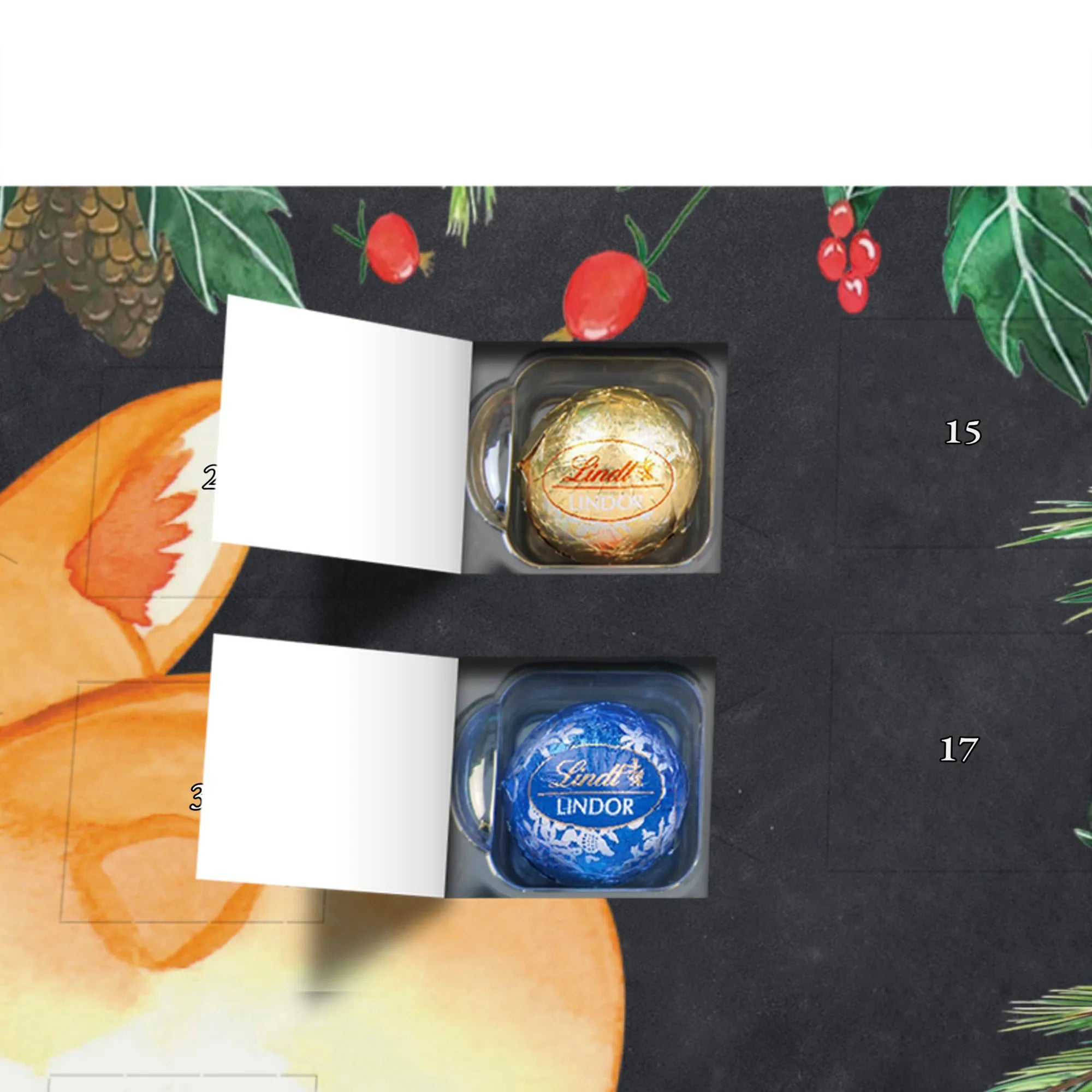 Unser zauberhafter Schoko Adventskalender von Mr. & Mrs. Panda bringt dir die süßeste Vorfreude auf Weihnachten! Dieser liebevoll gestaltete Adventskalender ist bedruckt mit wunderschönen Motiven & Sprüchen von Mr. & Mrs. Panda und ist nicht personalisierbar – dafür aber ein perfektes Geschenk für Freunde und Familie. Brillante Druckqualität mit seidenmatter Oberflächenveredelung sorgt für ein edles Finish, und die bedruckten Seitenflächen machen den Kalender von allen Seiten zu einem Hingucker. Maße: 233 mm x 178 mm x 24 mm. Besonderheit: kann aufgehängt oder aufgestellt werden, je nachdem, wie du ihn präsentieren möchtest. Gefüllt mit Lindt Lindor: 24 einzeln verpackte Markenschokoladen Kugeln in drei verschiedenen Sorten – Vollmilch, Feinherb und Weiße Schokolade – sorgen für abwechslungsreichen Genuss in der Adventszeit. Zutaten: Zucker, pflanzliches Fett (Kokosnuss, Palmkern), Kakaobutter, Vollmilchpulver, Kakaomasse, Milchzucker, Magermilchpulver, Butterreinfett, Emulgator (Sojalecithin), Gerstenmalzextrakt, Aromen. Besondere Hinweise: Kann Haselnüsse und Mandeln enthalten. Unser Schoko Adventskalender verbindet niedliches Design mit hochwertiger Füllung – ideal zum Verschenken oder selbst Naschen. Mr. & Mrs. Panda wünschen dir eine fröhliche und leckere Adventszeit!