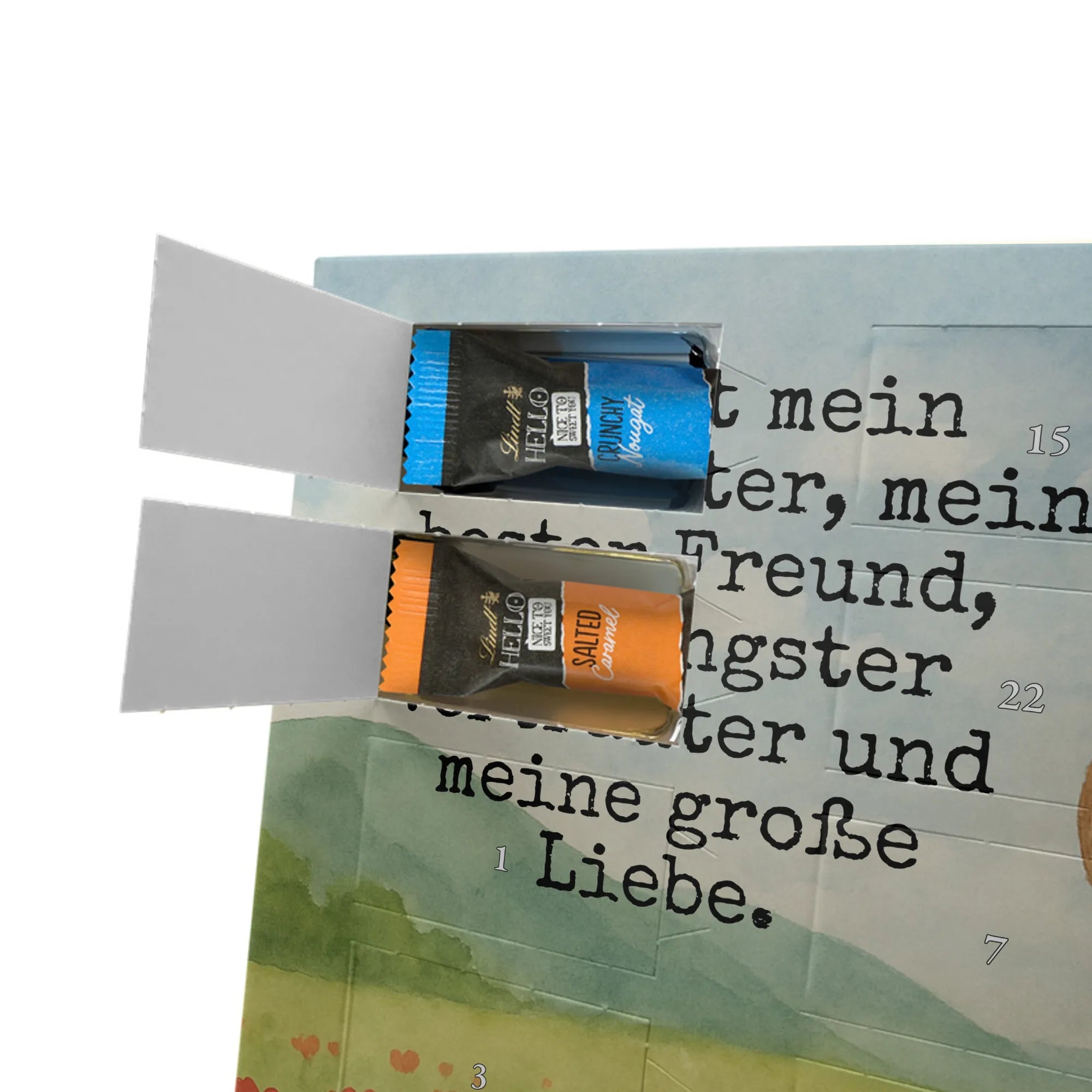 Unser Adventskalender Schokolade von Mr. & Mrs. Panda bringt dir jeden Tag eine kleine Freude. Das Design ist liebevoll bedruckt mit unseren typischen Motiven und lustigen Sprüchen – ein echter Blickfang in deinem Zuhause. Der Kalender ist nicht personalisierbar, überzeugt aber durch brillante Druckqualität und seidenmatte Oberflächenveredelung. Zusätzlich sind die Seitenflächen bedruckt, sodass das Motiv rundum zur Geltung kommt. Maße: 325 mm x 225 mm x 27 mm. Dank seines cleveren Aufhängemechanismus kannst du ihn entweder an die Wand hängen oder frei aufstellen. Gefüllt mit Lindt Hello Schokolade: 24 einzeln verpackte Schokoladen Mini Sticks in den Sorten Karamell-Schokoladenkuchen, Kekse, Knuspriger Nougat und Erdbeer-Cheesecake. Zutatenliste enthält u. a. Zucker, Kakaomasse, Vollmilchpulver, Haselnüsse; Allergene: Milcheiweiß, Milchzucker, Soja, Weizen und Haselnüsse, kann Mandeln und andere Schalenfrüchte enthalten. Perfekt als Geschenk für Kinder, Freunde oder als kleines Mitbringsel in der Adventszeit.