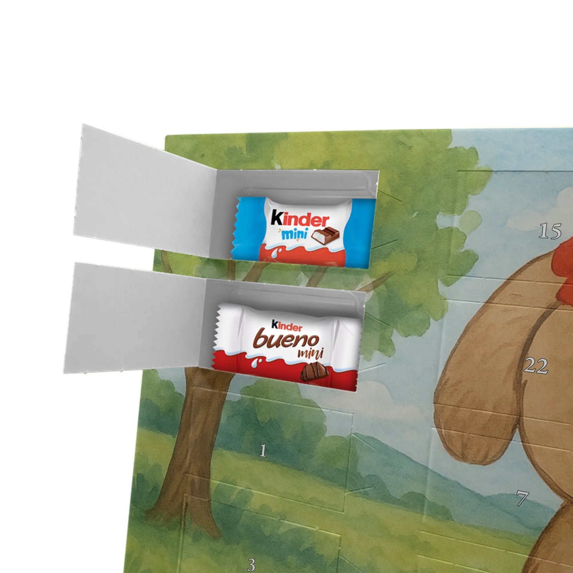 Entdecke unseren liebevoll gestalteten Schoko-Adventskalender von Mr. & Mrs. Panda – eine zauberhafte Idee, um die Tage bis Weihnachten zu versüßen. Der Kalender ist bedruckt mit wunderschönen Motiven & Sprüchen von Mr. & Mrs. Panda und ist nicht personalisierbar. Wir setzen auf brillante Druckqualität mit seidenmatter Oberflächenveredelung und bedruckte Seitenflächen für ein rundum schönes Erscheinungsbild. Maße: 355 mm x 245 mm x 11 mm. Die clevere Bauweise erlaubt es, den Kalender entweder aufzuhängen oder freistehend aufzustellen – so bist du flexibel bei der Dekoration. Gefüllt mit Markenname Schokolade: Adventskalender gefüllt mit kinder® Schokolade. Inhalt: kinder® Schoko-Bons, kinder® Bueno mini und kinder® Schokolade mini. Jeder Tag bringt eine kleine Freude und eignet sich perfekt als Geschenk oder als dekoratives Highlight in deinem Zuhause. Die stabile Verarbeitung sorgt dafür, dass der Kalender die ganze Adventszeit über Freude bereitet. Hol dir diesen Schoko-Adventskalender und lade die Vorweihnachtszeit mit süßen Überraschungen auf!