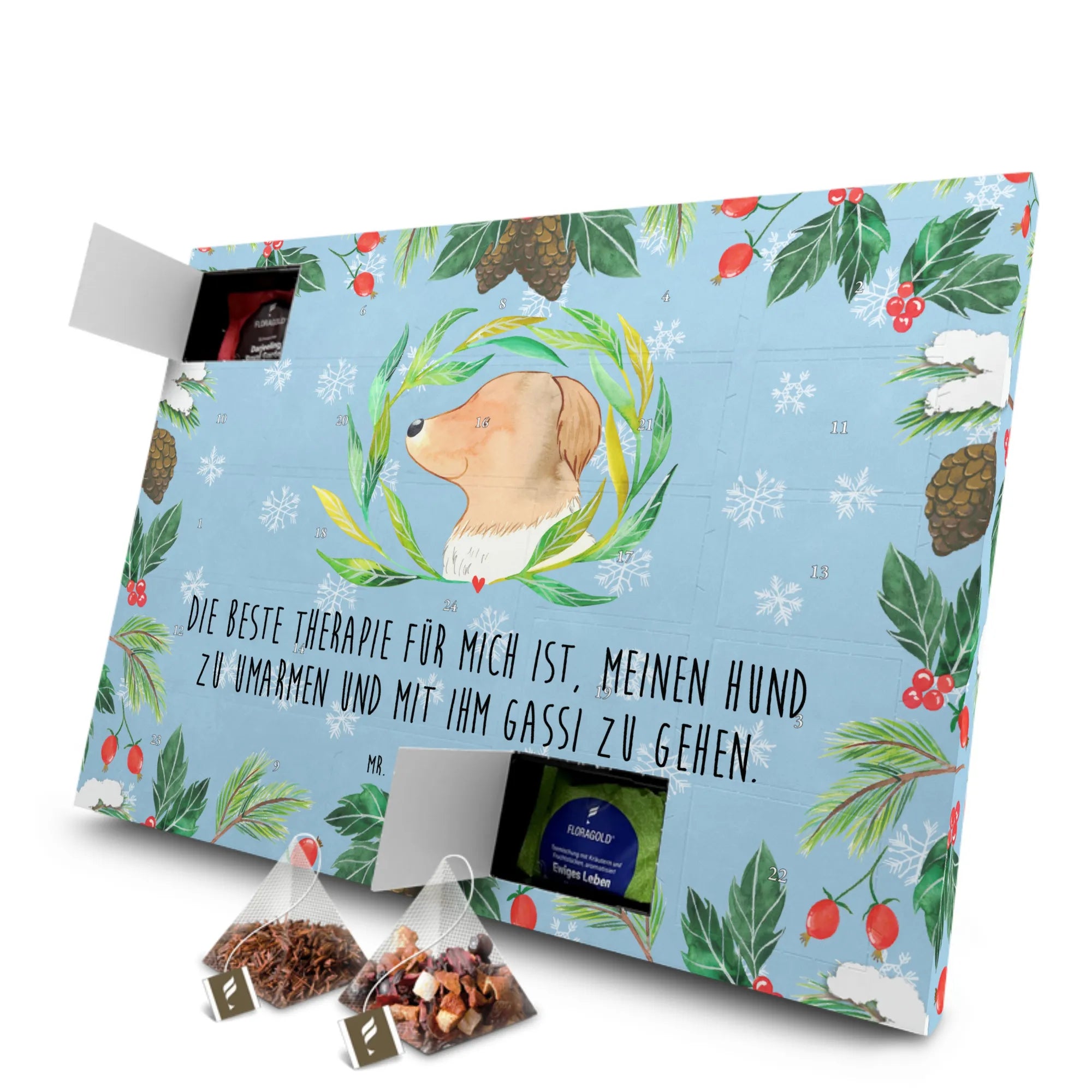 Der Adventskalender besticht nicht nur durch seine köstlichen Tees, sondern auch durch das zauberhafte Design. Das Motiv zeigt einen niedlichen Hund mit einer Blume in der Pfote, umgeben von zarten Ranken - eine echte Augenweide! Dieser Kalender ist nicht nur ein wahrer Blickfang, sondern auch ein liebevolles Symbol für die Freude, die uns unsere Haustiere bringen. Der eingedruckte Spruch „Die beste Therapie für mich ist, meinen Hund zu umarmen und mit ihm Gassi zu gehen“ spricht aus, was viele Hundebesitzer fühlen: Die Liebe und das Glück, das ein Hund ins Leben bringt.