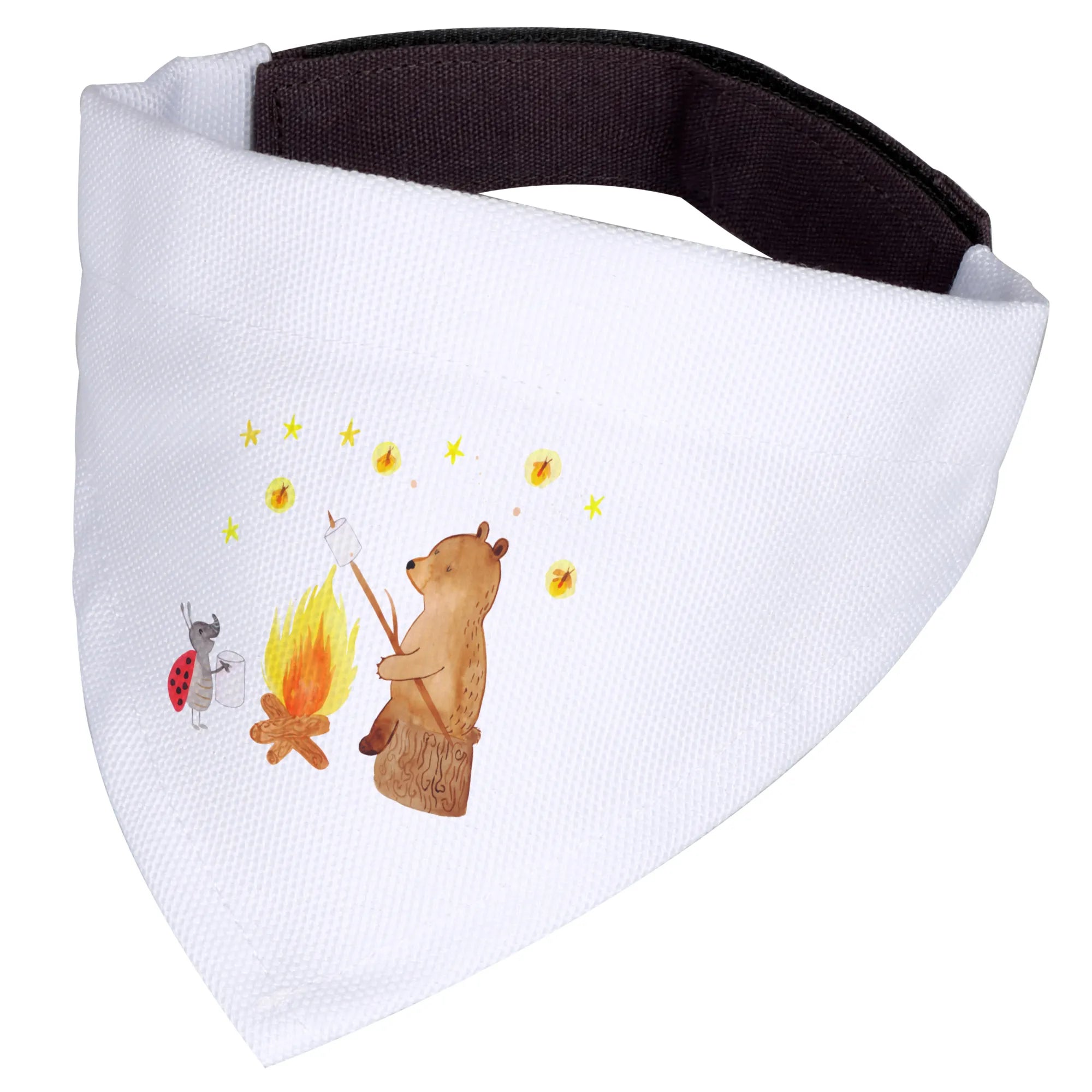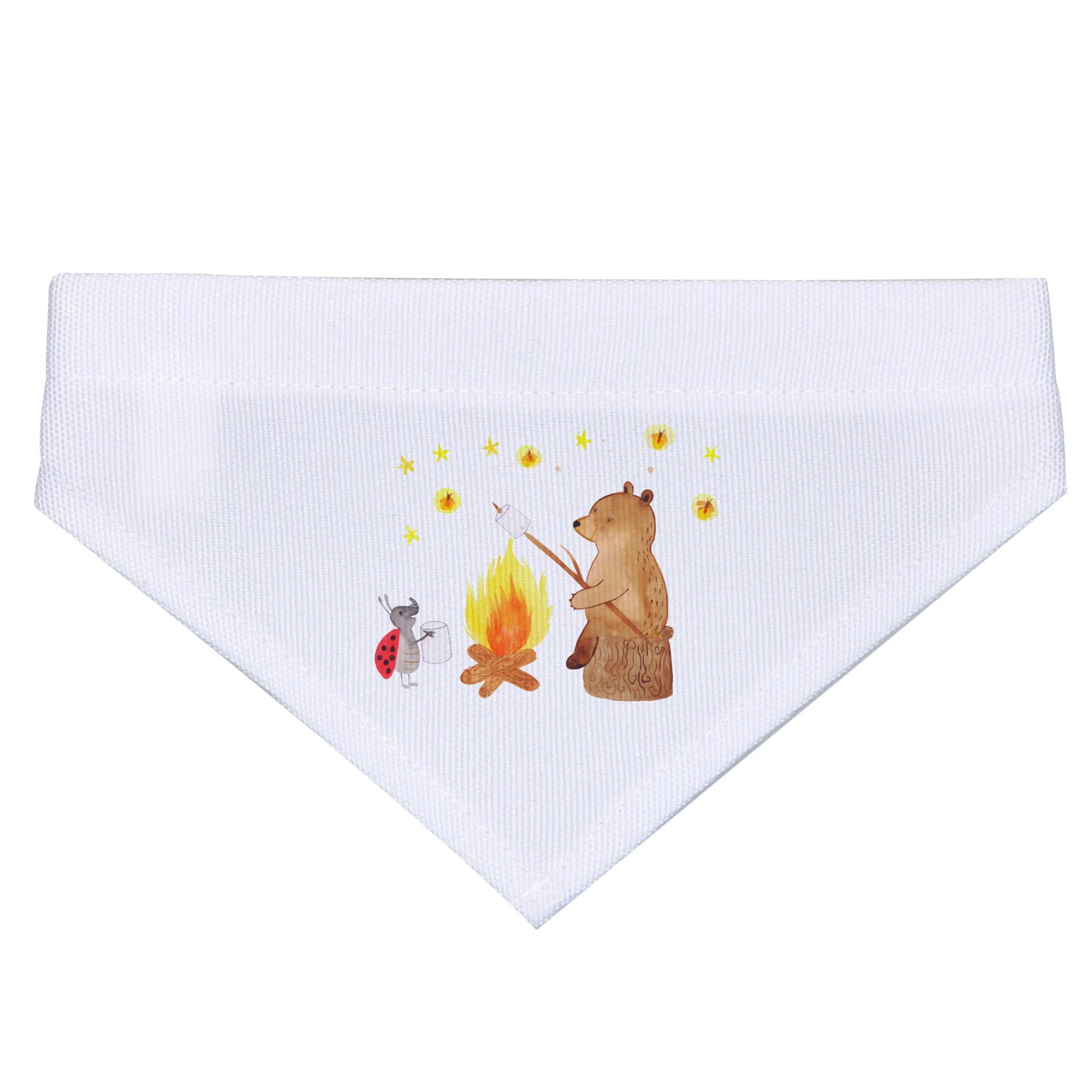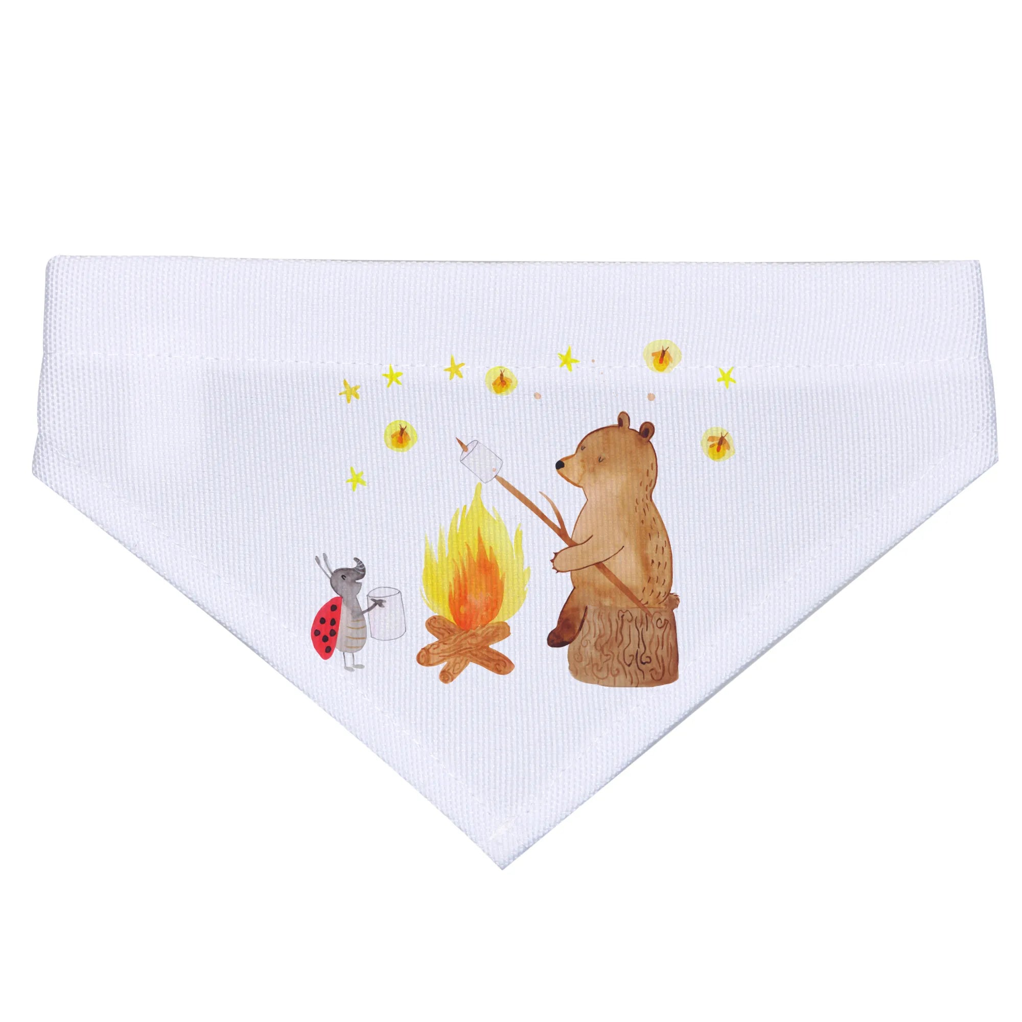 Das Hundehalstuch M mit dem fröhlichen Motiv von Bär und Marienkäfer am Lagerfeuer ist das perfekte Geschenk für jeden kleinen und mittelgroßen Hund und seine Familien.