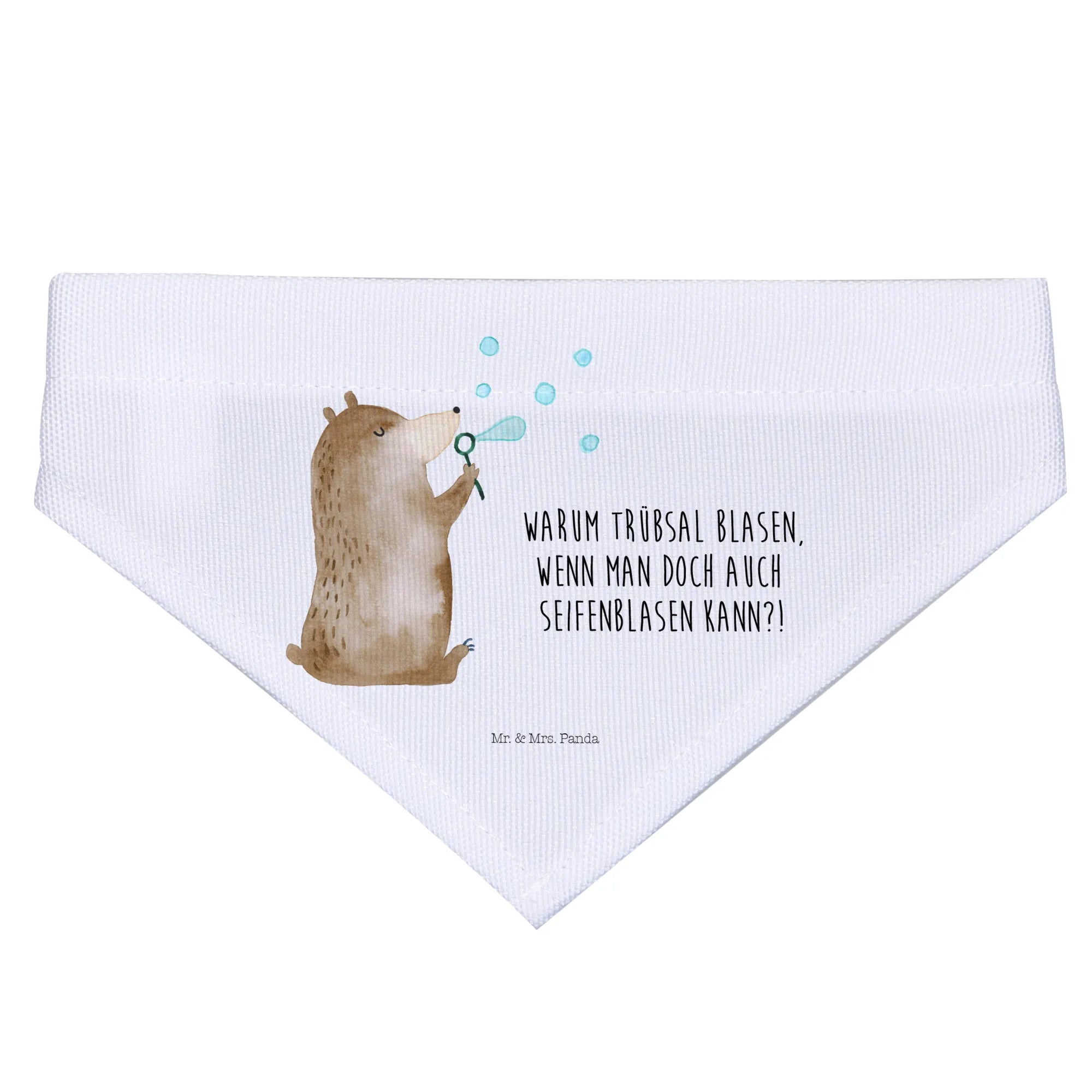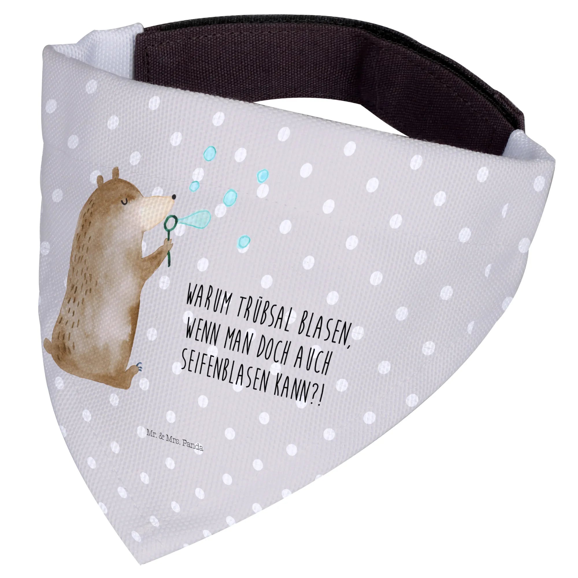 Ob zur Feier eines besonderen Anlasses oder einfach nur als kleine Freude zwischendurch – das Hundehalstuch ist ein ganz besonderes Geschenk, das jedem Hund und seinem Menschen ein Lächeln ins Gesicht zaubert. Der fröhliche Spruch „Warum Trübsal blasen, wenn man doch auch Seifenblasen kann?!” bringt die fröhliche Lebenshaltung von Mr. & Mrs. Panda perfekt zur Ausdruck.