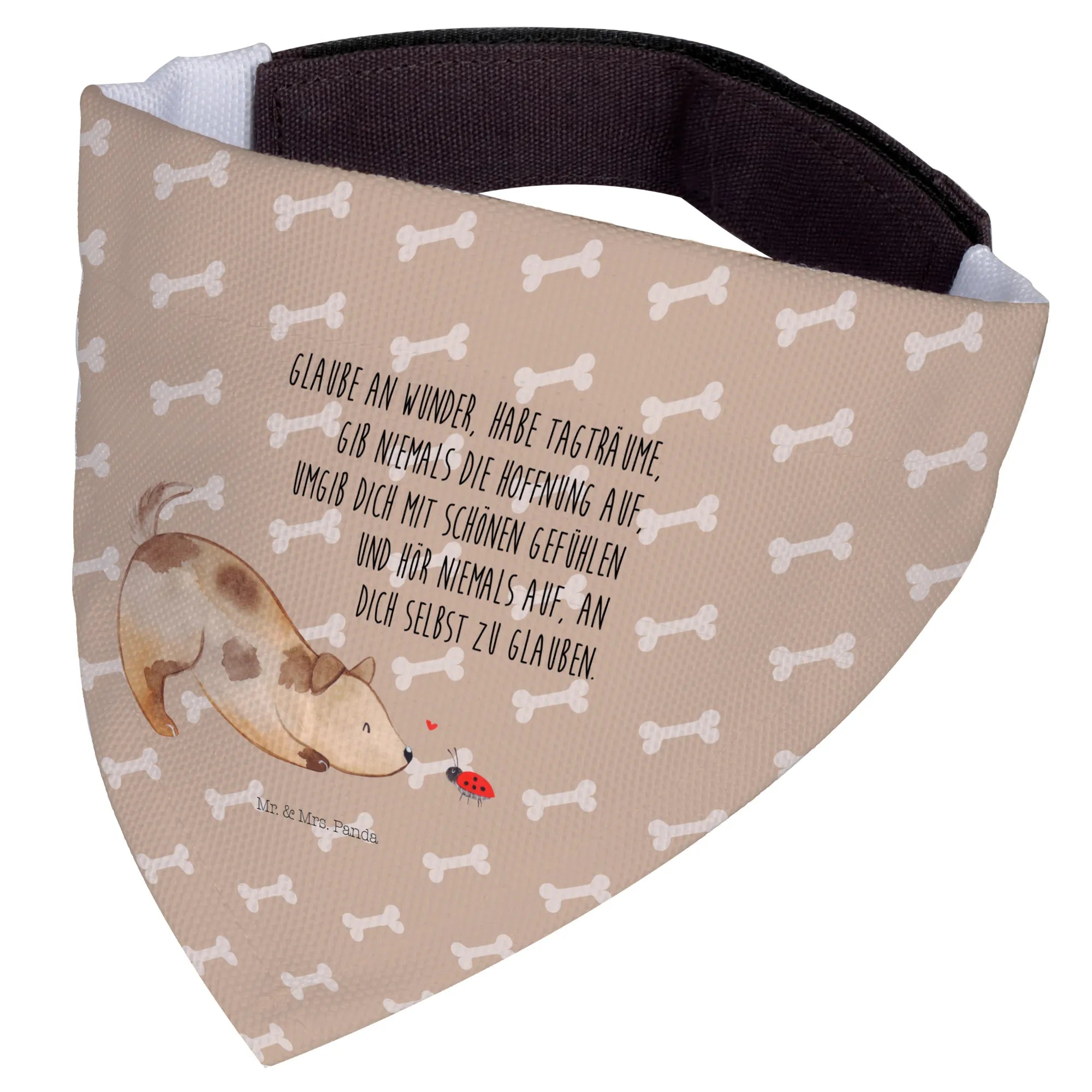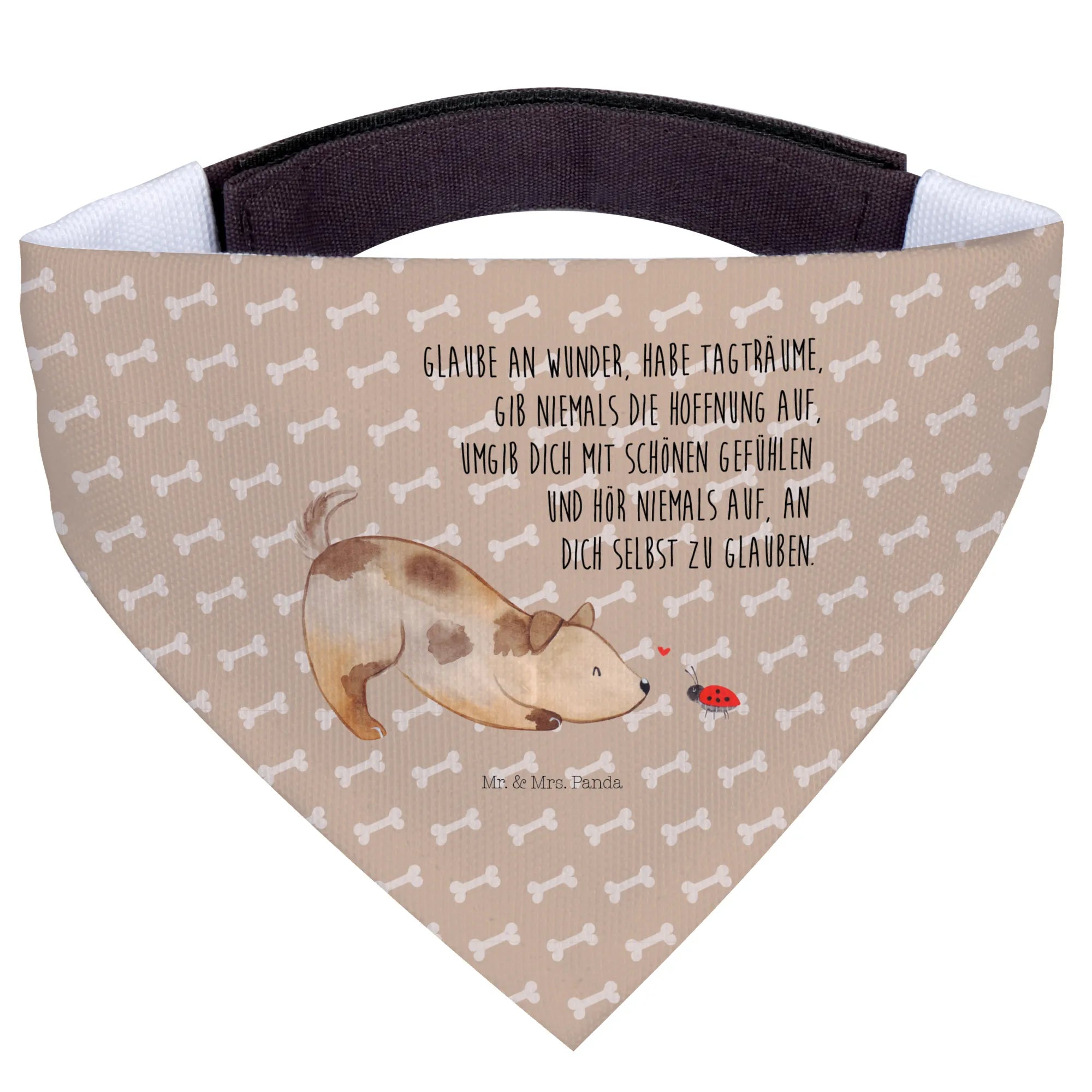 Suchst du nach einem niedlichen, stilvollen Hunde-Bandana, das Freude bringt und im Alltag praktisch ist? Unser Bandana zeigt einen süßen Hund, der fasziniert vor einem kleinen Marienkäfer sitzt – ein liebevolles Motiv aus der Hunde Kollektion. Der integrierte Spruch „Glaube an Wunder, habe Tagträume, gib niemals die Hoffnung auf, umgib dich mit schönen Gefühlen und hör niemals auf, an dich selbst zu glauben.“ verleiht dem Schal eine besondere, herzerwärmende Botschaft.