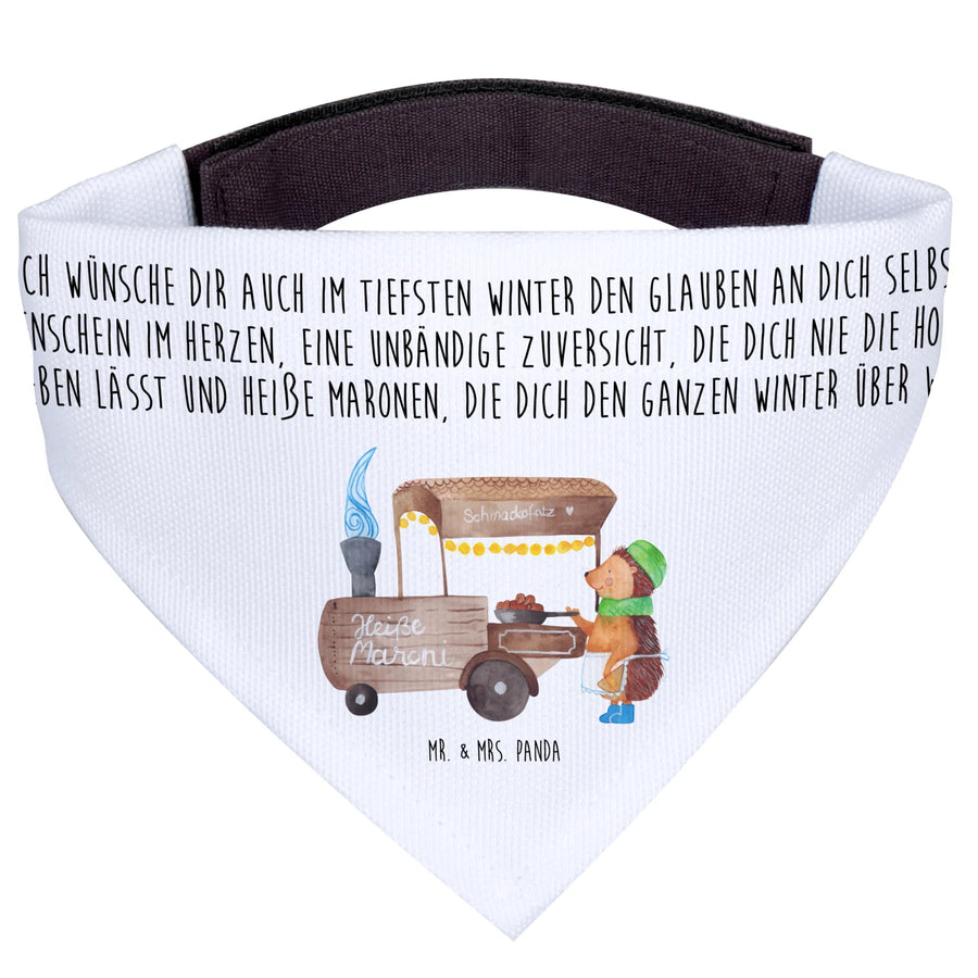 Dieses Hundehalstuch ist besonders für große Hunde geeignet und punktet mit einem ansprechenden Design: Ein kleiner Igel, der mit Hingabe heiße Maronen verkauft – einfach zum Verlieben!
