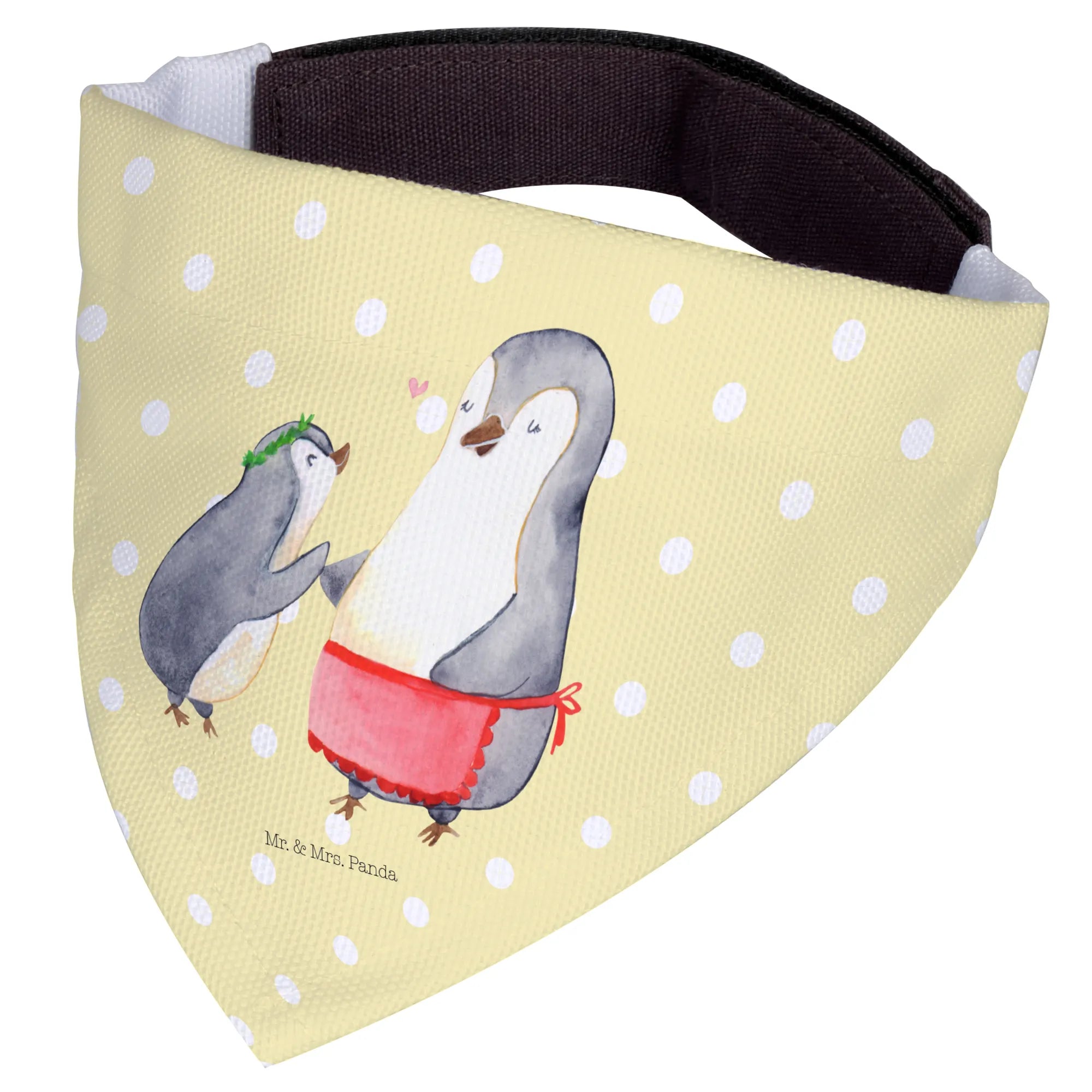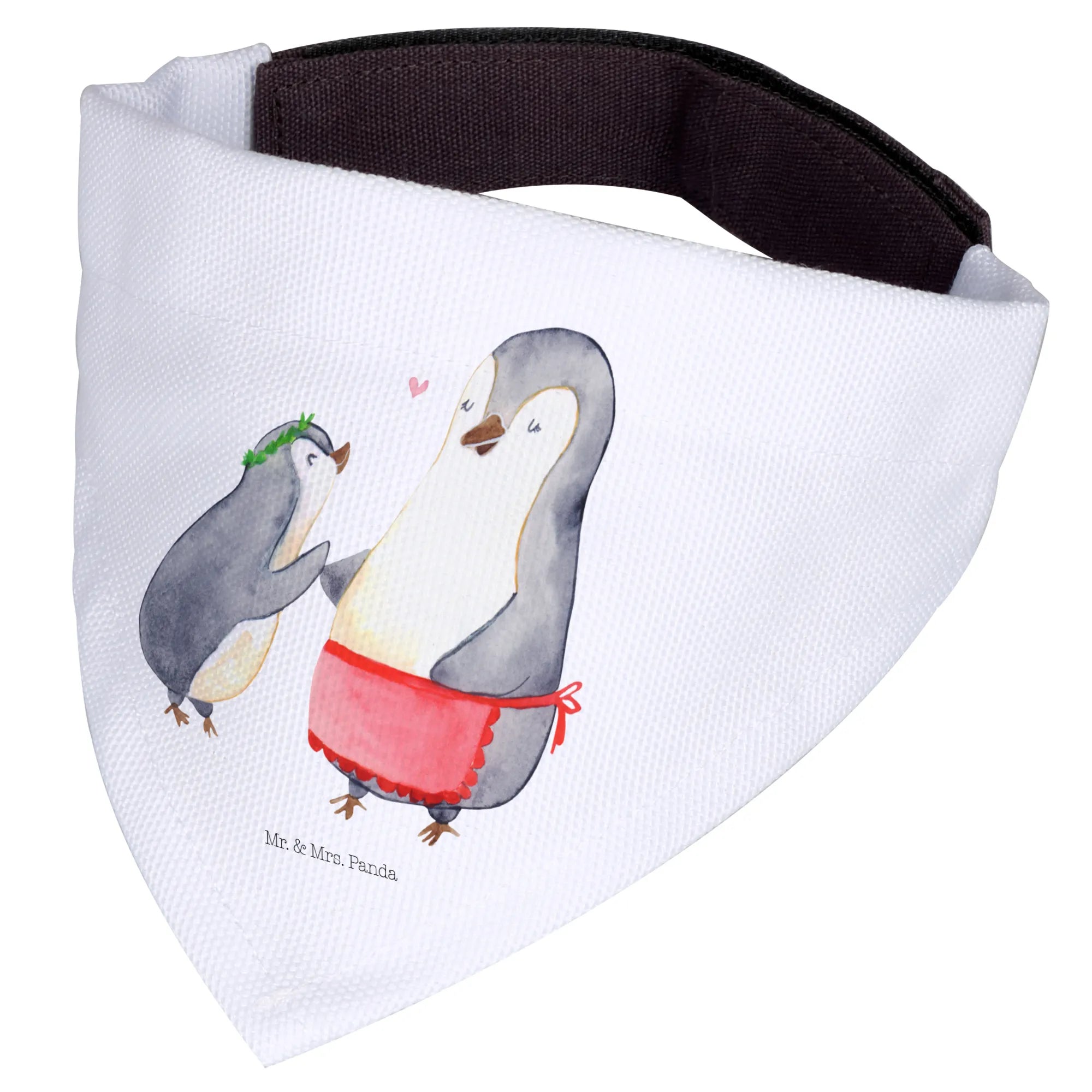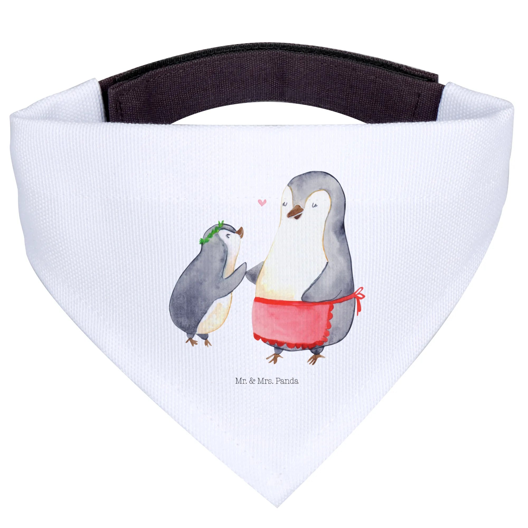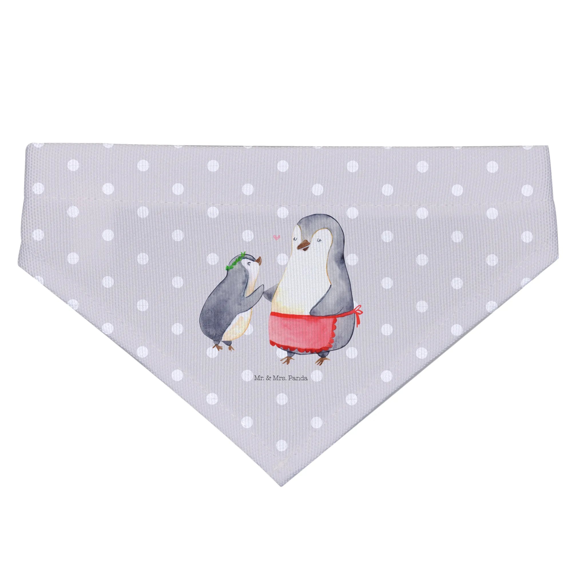 Das verspielte Motiv zeigt einen größeren Pinguin in einer roten Schürze, der fürsorglich auf den kleineren Pinguin mit dem grünen Kranz herabblickt. Ein kleines Herz schwebt zwischen den beiden und symbolisiert die unendliche Verbundenheit zwischen Mutter und Kind. Diese Art von liebevoller Verbindung, die in der Familienkollektion von Mr. & Mrs. Panda zelebriert wird, macht dieses Halstuch zum idealen Accessoire für mittelgroße Hunde, die einen besonderen Blickfang verdienen.
