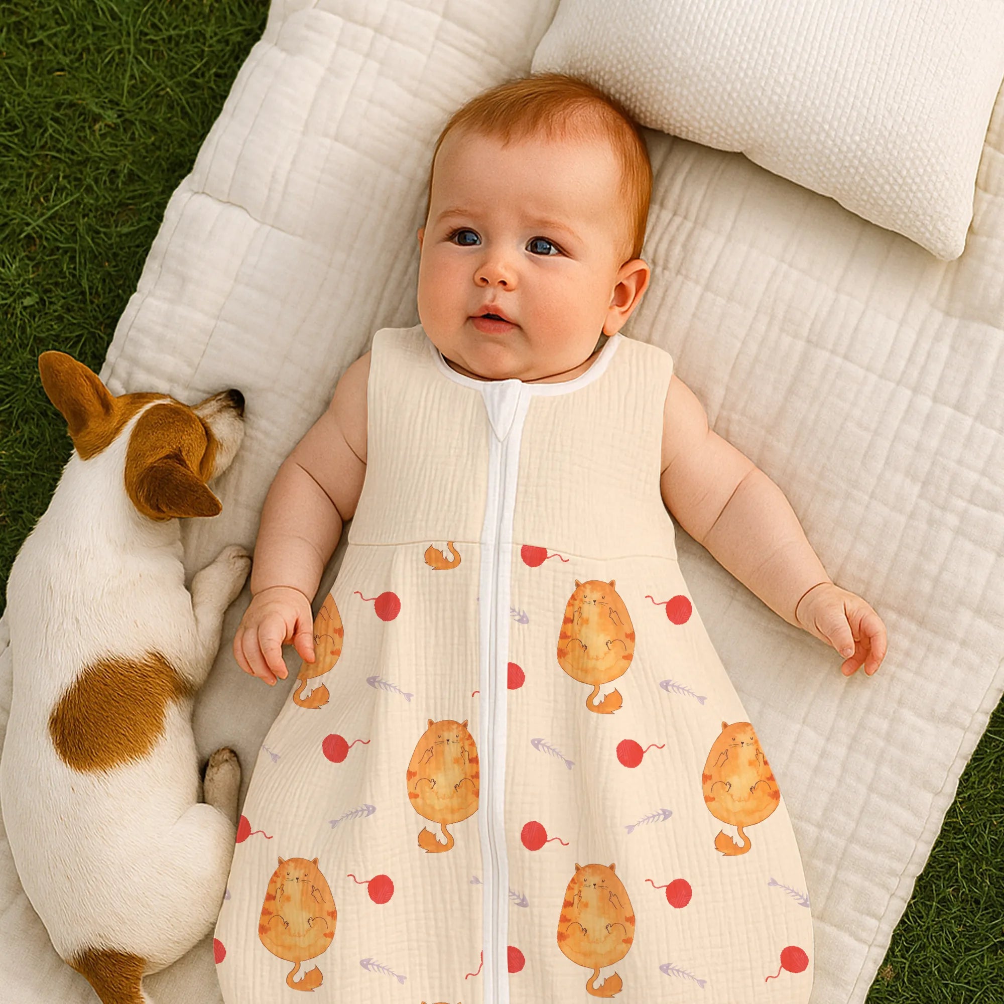 Die handgezeichnete Katze mit frechem Ausdruck verleiht dem Schlafsack einen besonderen Charakter. Ob als Schlafsack Baby für den ersten Babyschlaf, als Geschenk zur Geburt oder zur Babyparty – dieses Babyschlafsack Katzenmotiv sorgt für Lacher und liebevolle Blicke.