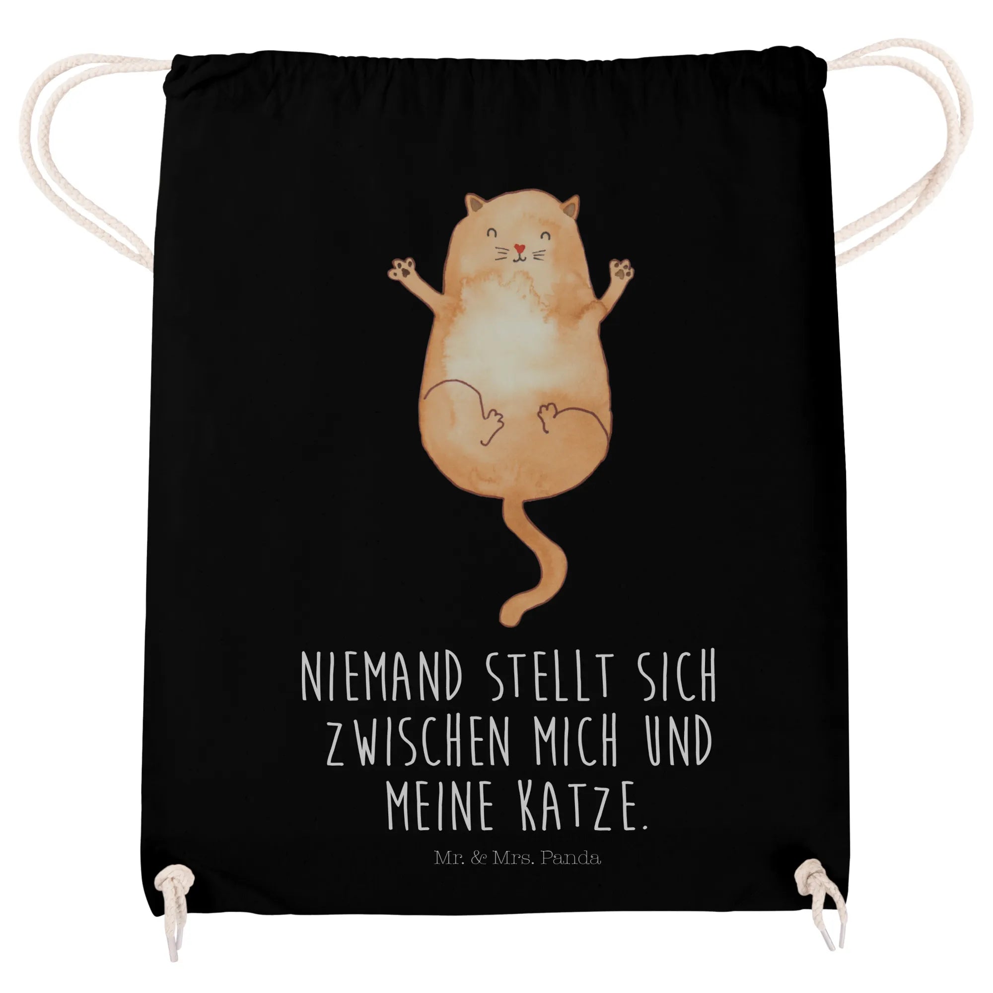 Dieser hochwertige Baumwollbeutel ist weit mehr als nur eine einfache Gymnastiktasche. Er ist ein Statement für alle Katzenliebhaber und ein treuer Gefährte, egal ob du zum Sport gehst, ein Festival besuchst oder einfach nur einen entspannten Stadtbummel machst. Das Motiv Katzen Umarmen zeigt eine zuckersüße Katze, die voller Lebensfreude auf dem Rücken liegt und ihre Arme weit ausbreitet, als wollte sie die ganze Welt umarmen. Kombiniert mit dem frechen Spruch "Niemand stellt sich zwischen mich und meine Katze." fängt dieser Rucksackbeutel genau das Wesen unserer geliebten Samtpfoten ein: eigenwillig, liebevoll und absolut unverzichtbar.