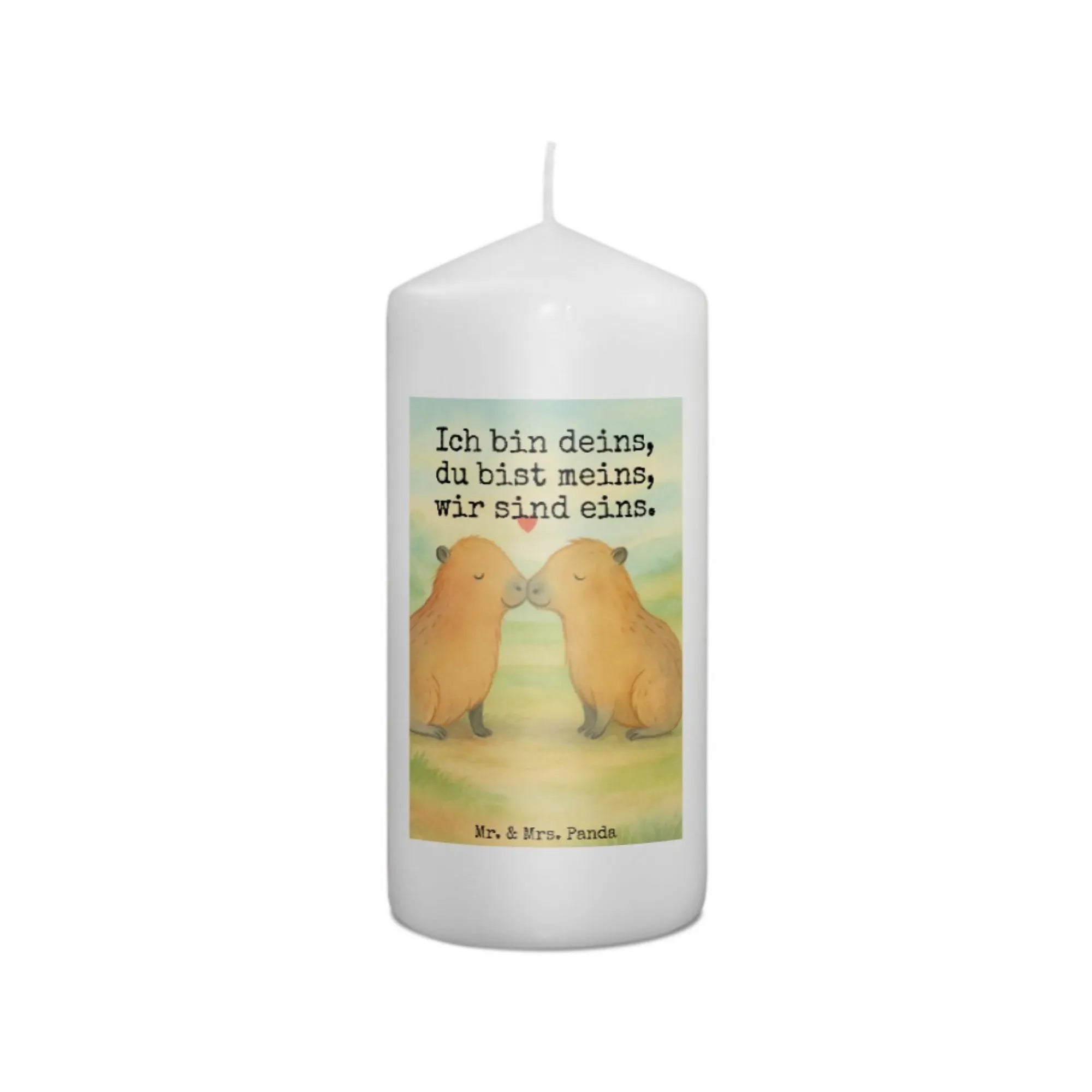 Die herzerwärmende Darstellung von zwei Capybaras auf diesem bezaubernden Motiv von Mr. & Mrs. Panda zeigt die Zuneigung auf wundervolle Weise. Sie berühren sich sanft an der Nase, sodass sich ihre Schnauzen zu einem herzförmigen Muster formen. Über ihnen schwebt ein kleines, rotes Herz, das ihre Liebe wunderschön symbolisiert. Die handgezeichneten pelzigen Gefährten sind in sanften Brauntönen gehalten und strahlen Gelassenheit und Freude aus. Mit dem berührenden Spruch 'Ich bin deins, du bist meins, wir sind eins.' vermittelt dieses Motiv eine tiefe Botschaft der Liebe und Einheit und ist daher die perfekte Geschenkidee für Verliebte und Romantiker, sei es zum Jahrestag, Valentinstag oder einfach als Liebesbeweis.