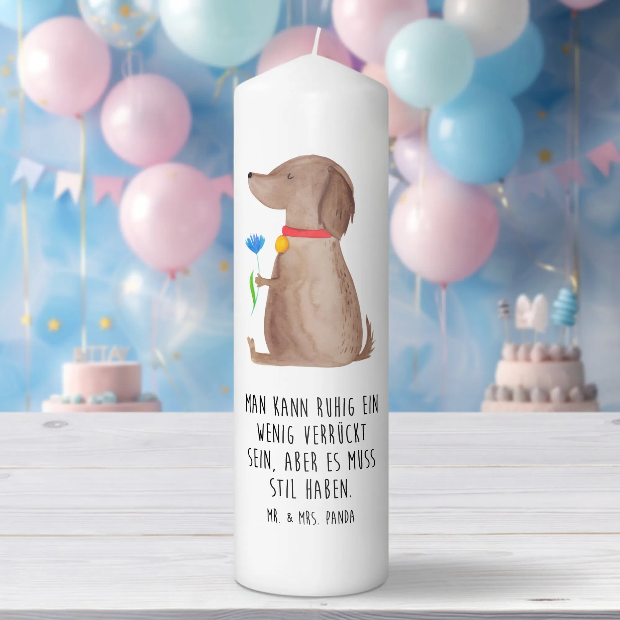 Die Taufkerze Hund Blume aus der liebevollen Hunde Kollektion von Mr. & Mrs. Panda ist das perfekte Geschenk für alle Hundeliebhaber! Diese bezaubernde Kerze, bedruckt mit einem niedlichen Motiv einer Hündin mit einer Blume im Fell, wird jedes Herz höher schlagen lassen. Egal, ob zur Taufe, Kommunion oder als Geburtstagsgeschenk – sie bringt eine besondere Atmosphäre in jeden Raum.