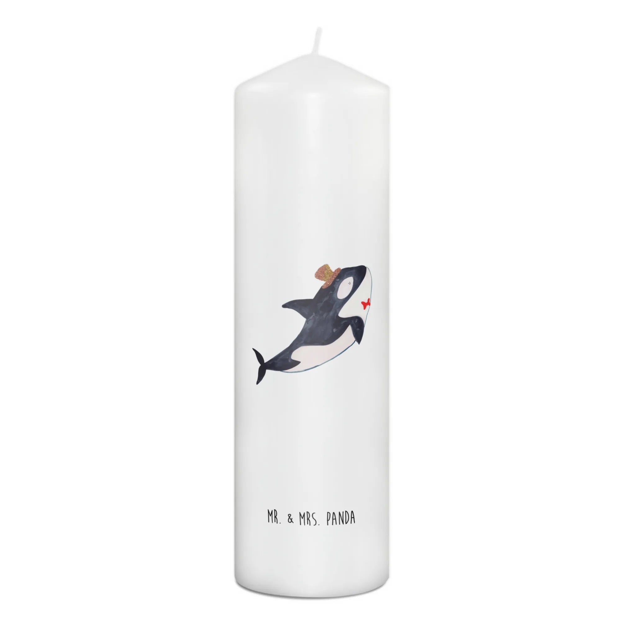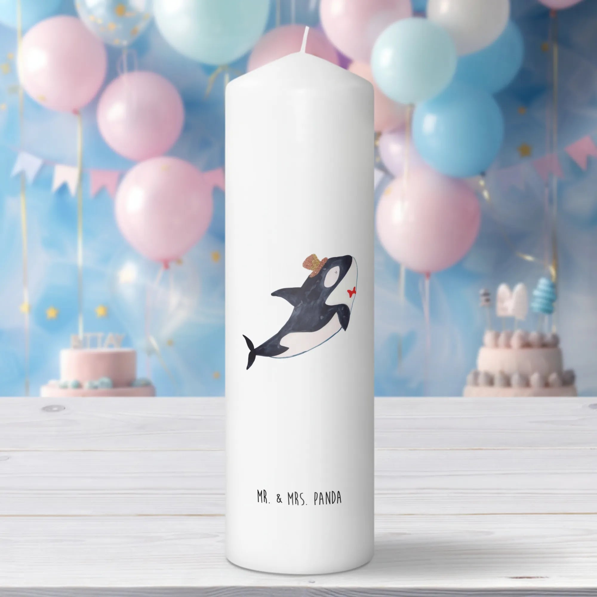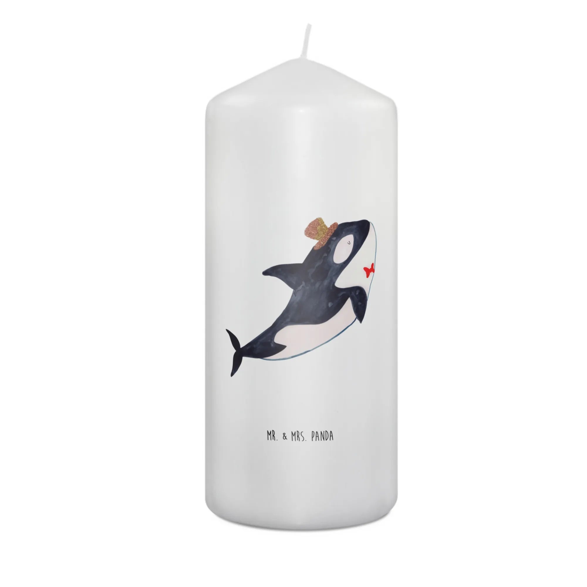 Das liebevoll gestaltete Motiv zeigt einen fröhlichen Orca, der mit seinem Zylinder im skizzierten Aquarell-Stil überzeugt. Die Blumenverzierung auf dem Zylinder und der kleine rote Fisch, der sich neben seiner Wange befindet, verleihen der Kerze eine verspielte Note, die jeden Raum verschönert.