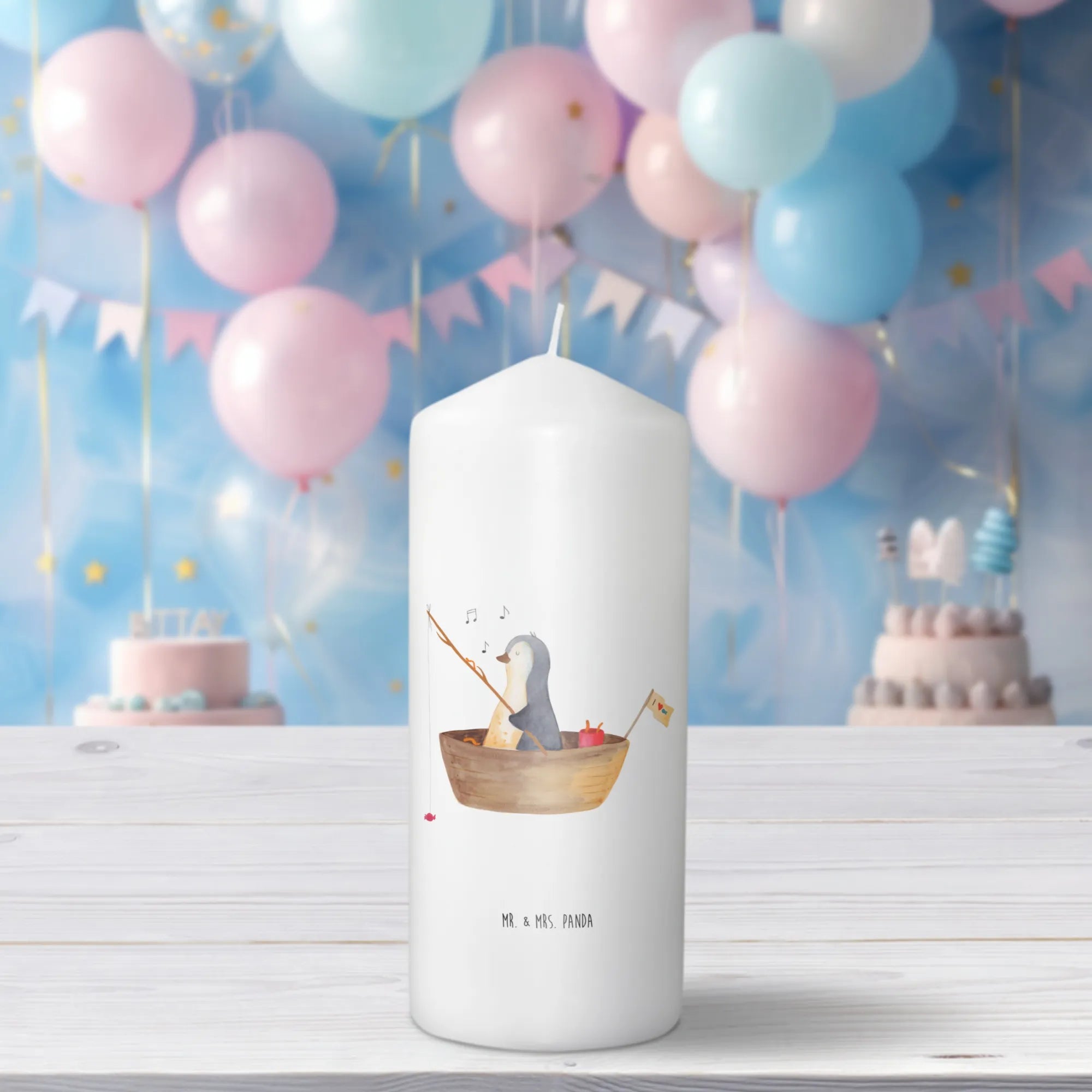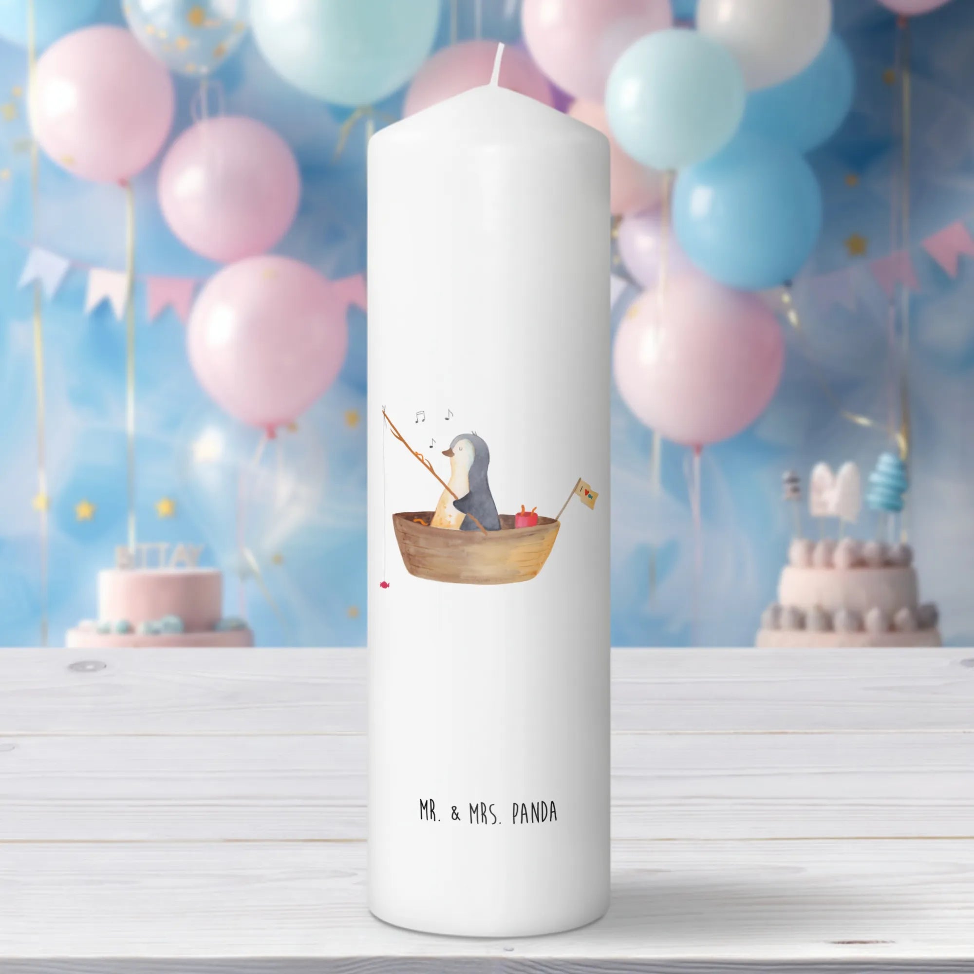 Mr. & Mrs. Panda Kerze „Pinguin Angelboot“ – eine liebevoll illustrierte Dekokerze, die Herzen erwärmt. Unser süßer Pinguin ist in einem kleinen Angelboot unterwegs und angelt Bonbons. Dieses fröhliche Motiv verbreitet sofort Lebensfreude und sorgt für ein Lächeln, egal ob zu Hause oder im Büro.