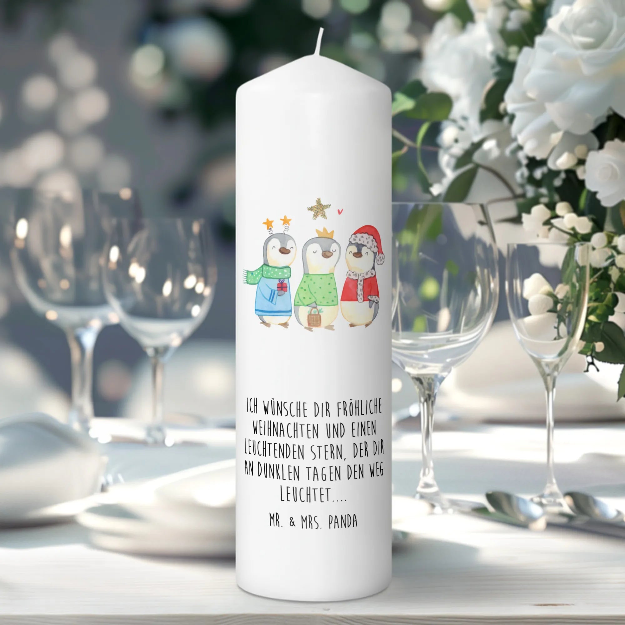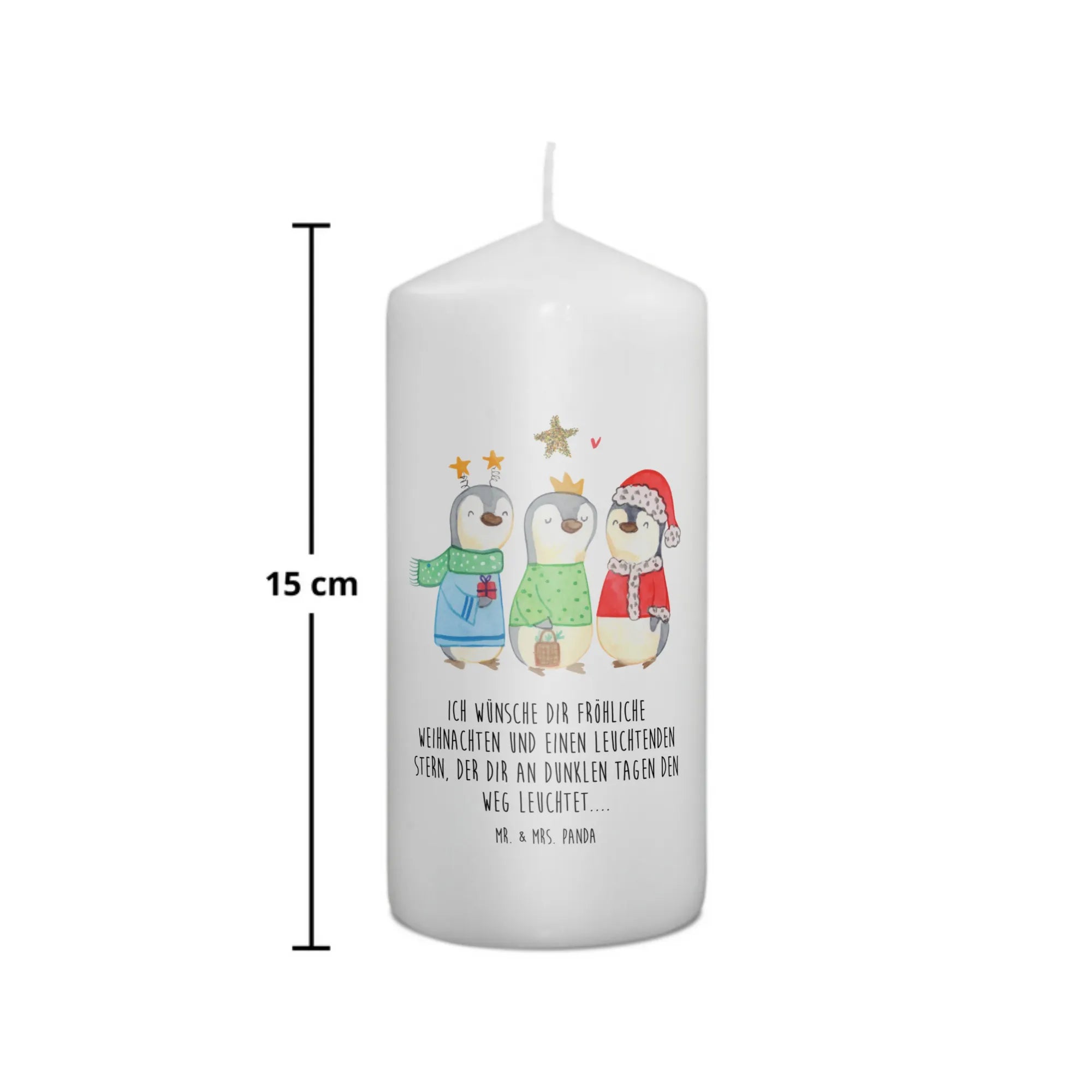 Ob zur Taufe, zur Kommunion oder als Geburtstagsgeschenk, diese Kerze zaubert ein Lächeln auf die Gesichter deiner Liebsten. Das Design zeigt drei süße Pinguine, die wie die Heiligen drei Könige gekleidet sind - einfach zum Verlieben! Mit dem Slogan "Ich wünsche dir fröhliche Weihnachten und einen leuchtenden Stern, der dir an dunklen Tagen den Weg leuchtet..." bringt diese Kerze eine besondere emotionale Note mit sich.