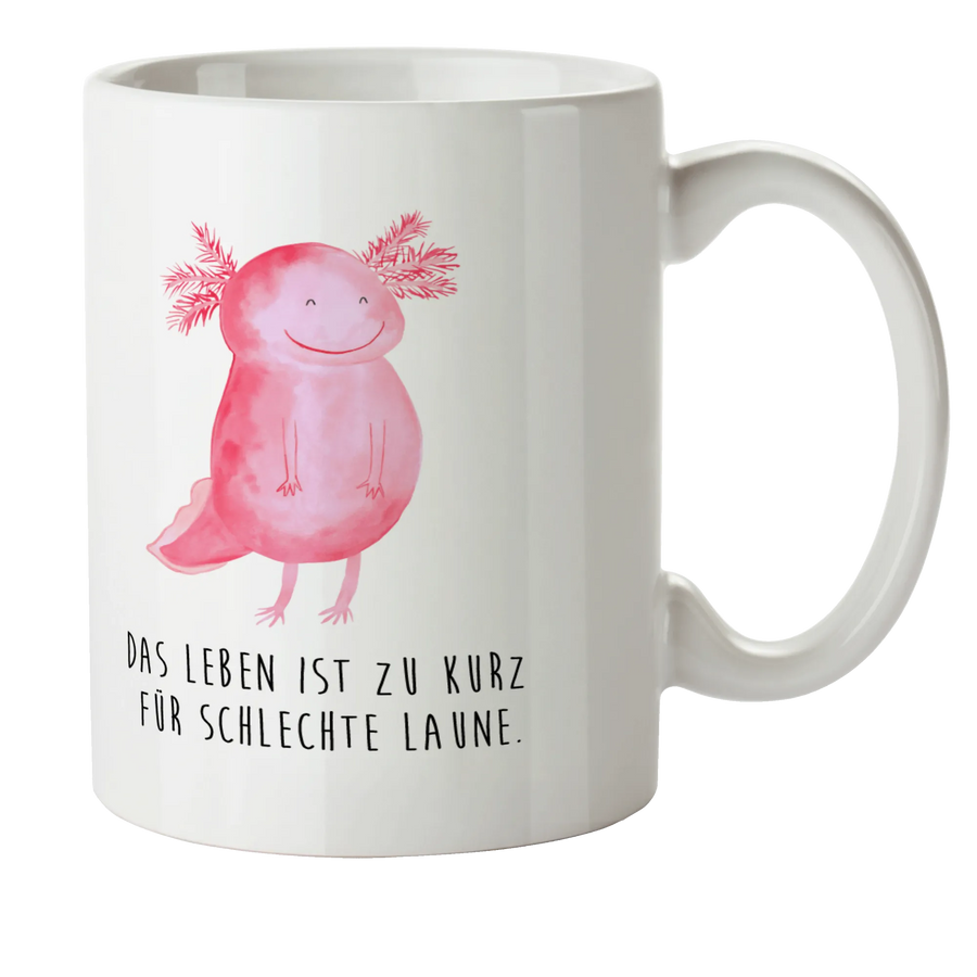 Das Motiv "Axolotl glücklich" ist Teil unserer speziellen Axolotl-Kollektion, die von Mrs. Panda liebevoll handgezeichnet wurde. Jedes Produkt dieser Kollektion ist einzigartig und bringt ein Lächeln ins Gesicht. Die Botschaft "Das Leben ist zu kurz für schlechte Laune" macht diese Tasse zu einem besonderen Geschenk für Geburtstage, Ostern oder einfach als kleine Überraschung.