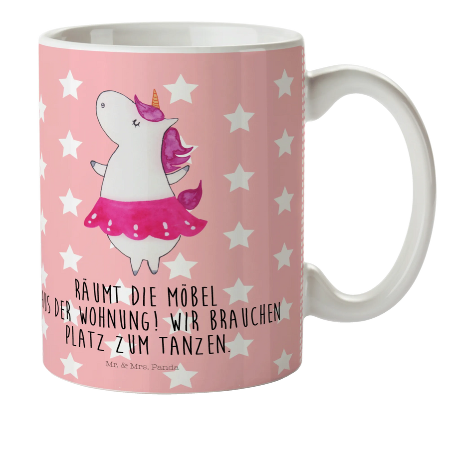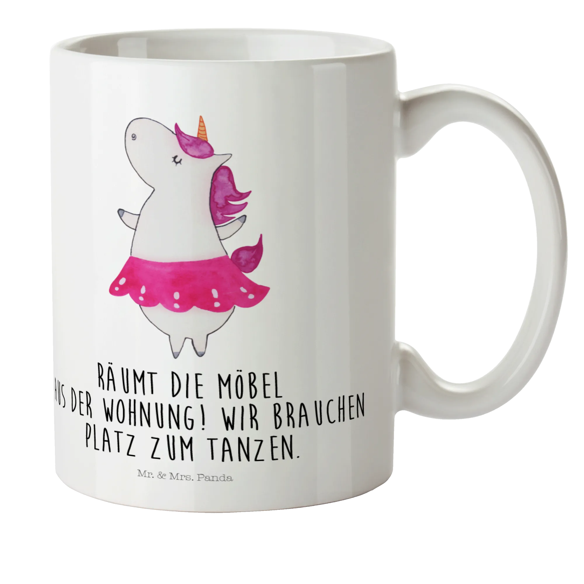 Unsere fröhliche Kindertasse aus der Einhorn - Kollektion von Mr. & Mrs. Panda ist mehr als nur ein Trinkbecher: Sie ist ein kleines Stück Magie für jeden Tag. Das liebevoll von Mrs. Panda handgezeichnete Ballerina-Einhorn im Tütü versprüht Lebensfreude und lädt zum Tanzen ein. Der freche Spruch „Räumt die Möbel aus der Wohnung! Wir brauchen Platz zum Tanzen.“ sorgt garantiert für Schmunzeln beim Frühstück, in der Kita oder auf dem Kindergeburtstag.