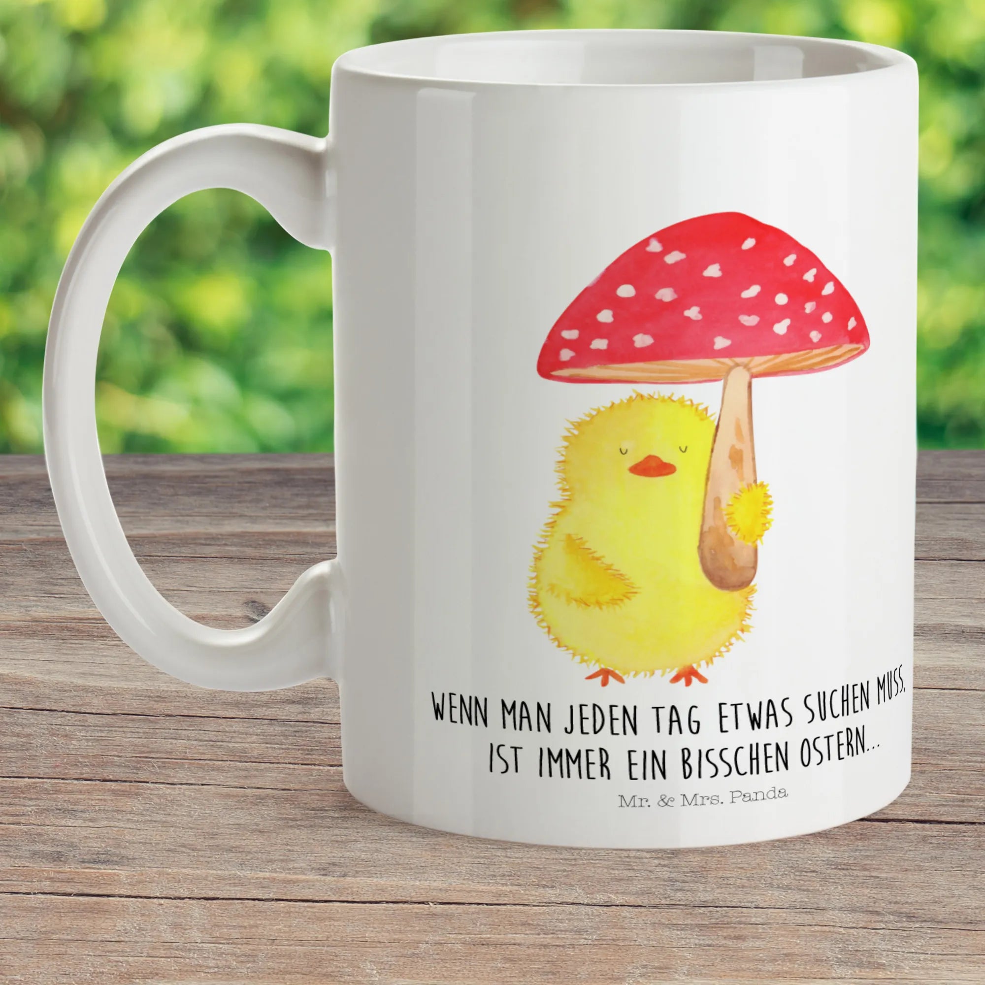 Das bezaubernde Küken sitzt gemütlich unter einem fröhlichen roten Fliegenpilz und vermittelt mit seinem Charme ein Stückchen Osterfreude. "Wenn man jeden Tag etwas suchen muss, ist immer ein bisschen Ostern." – dieser frohe Spruch begleitet die Kinder an ihrem liebsten Trinkbehälter. Die liebevolle Gestaltung macht die Tasse nicht nur zu einem tollen Begleiter für die Kleinen, sondern auch zu einem fantastischen Geschenk zum Osterfest. Du kannst das süße Küken als perfektes Ostergeschenk nutzen oder in das Osternest stecken.