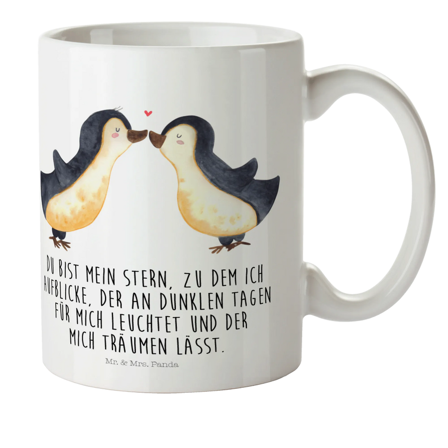 Mr. & Mrs. Panda Kindertasse „Pinguin Liebe“ – ein kleiner Herzenswärmer für jeden Tag. Unsere farbenfrohe, bruchfeste Kindertasse überzeugt mit einem liebevollen Aquarell-Motiv: Zwei verliebte Pinguine kuscheln sich aneinander, ein Herz schwebt über ihnen und der passende Spruch macht die Tasse zu einem besonderen Geschenk: Du bist mein Stern, zu dem ich aufblicke, der an dunklen Tagen für mich leuchtet und der mich träumen lässt.