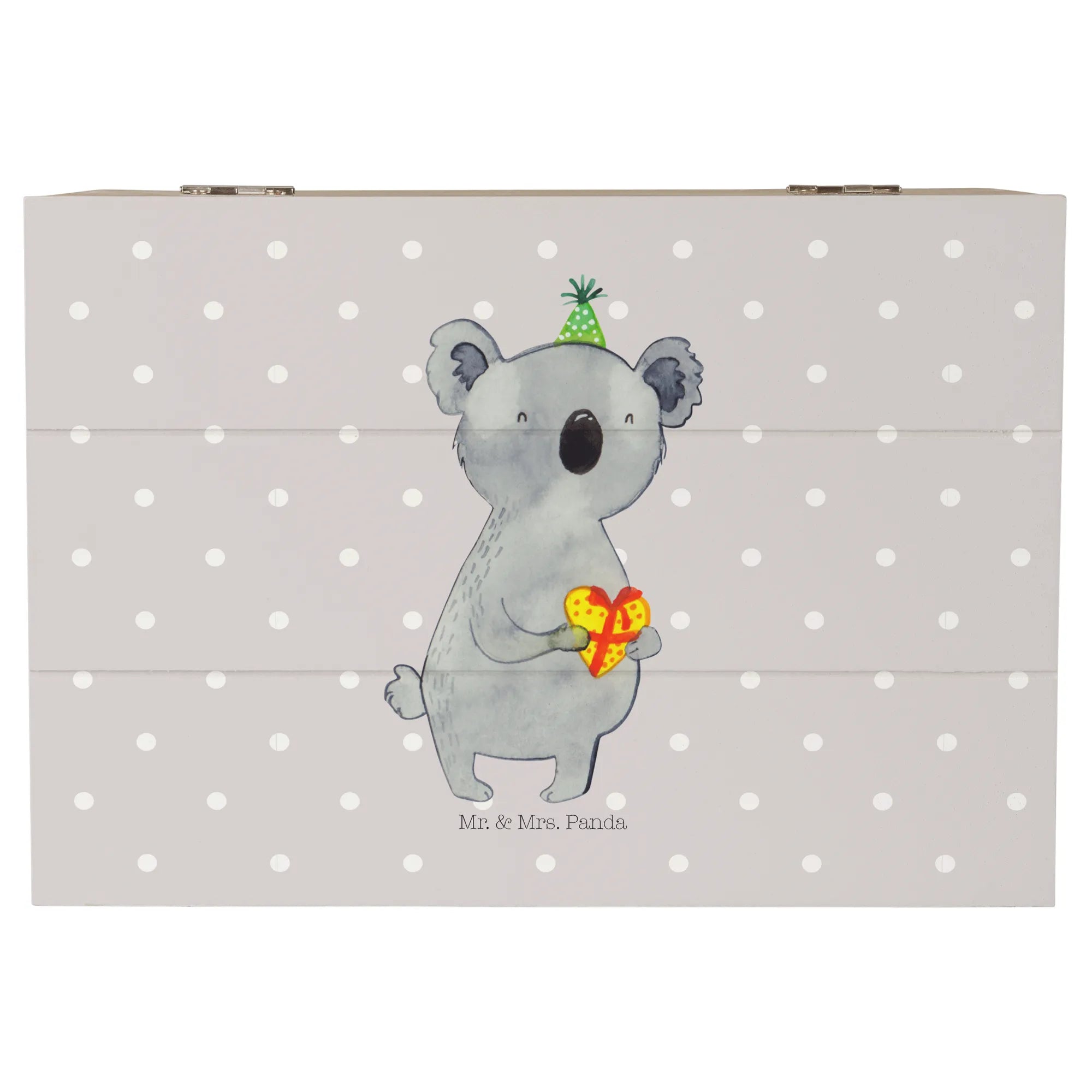 Die Holzkiste von Mr. & Mrs. Panda ist das perfekte Geschenk, wenn es darum geht, Schätze und Erinnerungen zu bewahren. Mit einem bezaubernden Koala-Motiv, das einen Partyhut trägt und ein eingepacktes Geschenk in Herzform hält, strahlt diese Kiste Lebensfreude aus.