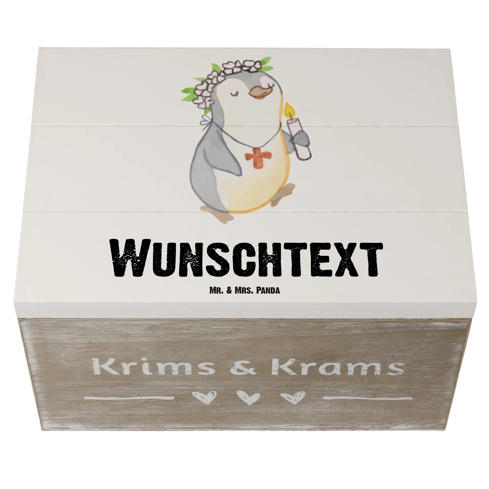 Die personalisierte Holzkiste "Pinguin Kommunion Mädchen" von Mr. & Mrs. Panda ist das perfekte Geschenk zur Kommunion oder Konfirmation für kleine Mädchen. Diese bezaubernde Kiste, gefertigt aus hochwertiger Premium Hartfaser, misst 19 x 12 cm und hat die ideale Größe, um all die kleinen Schätze und Erinnerungen zu verstauen.